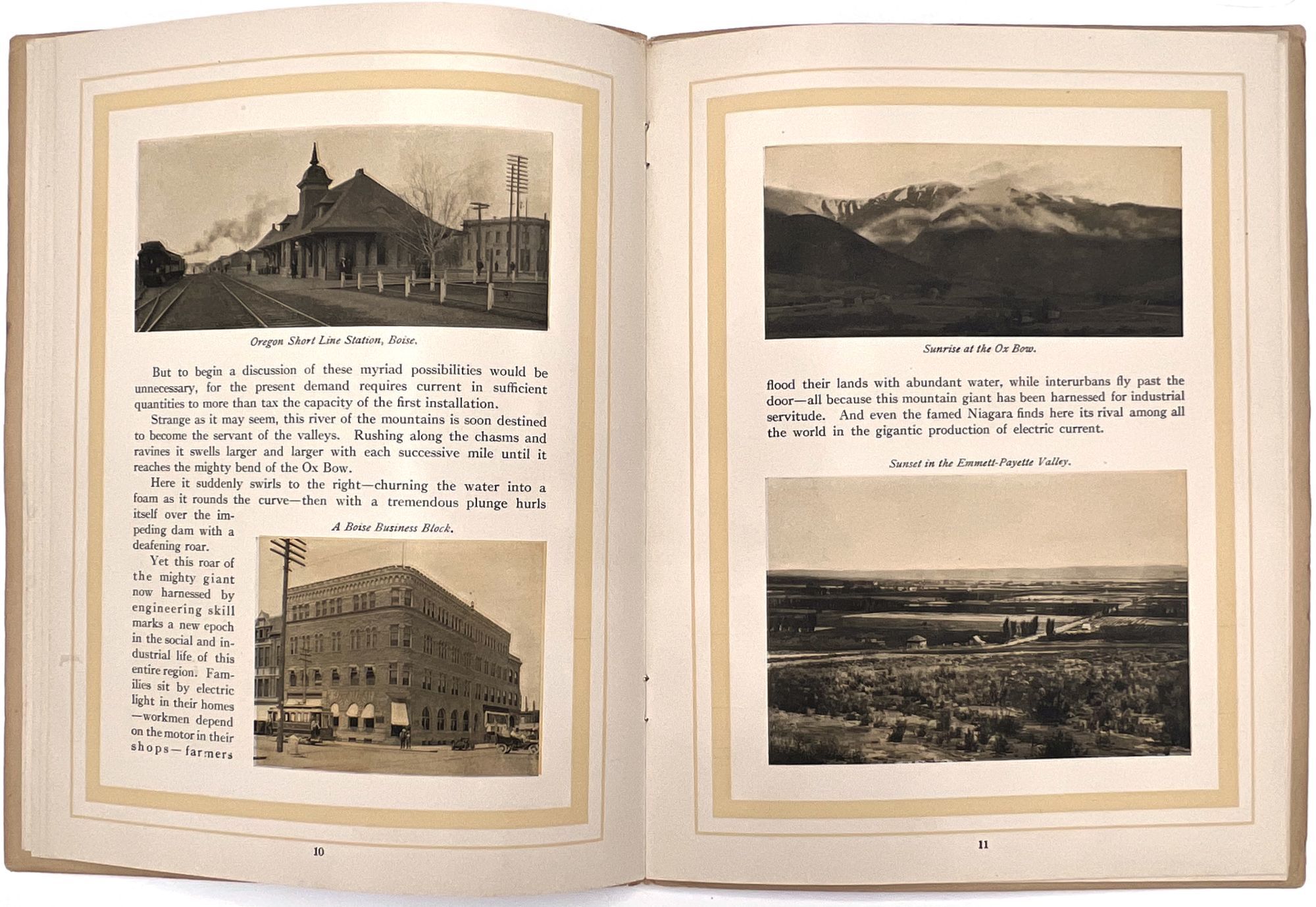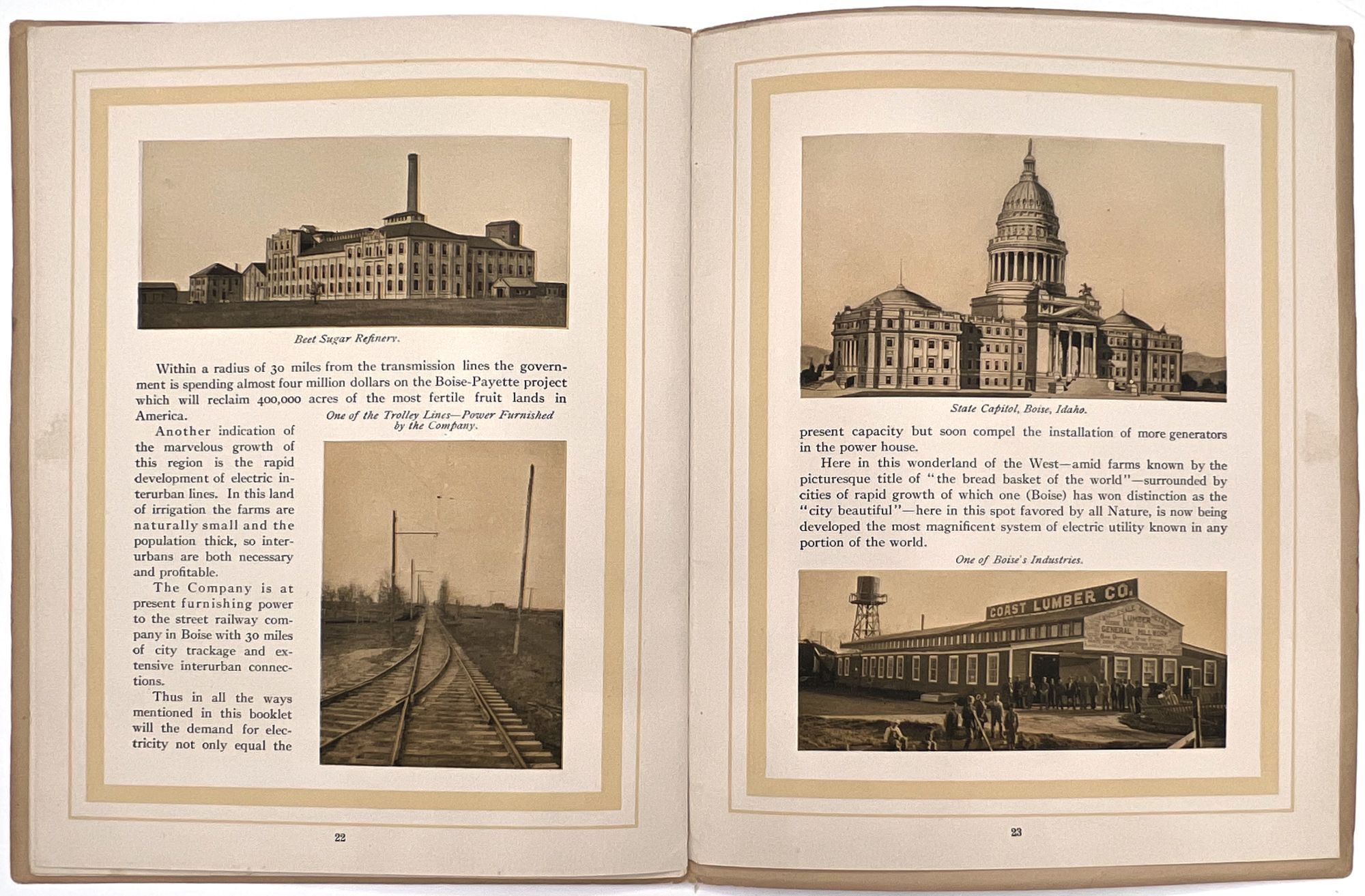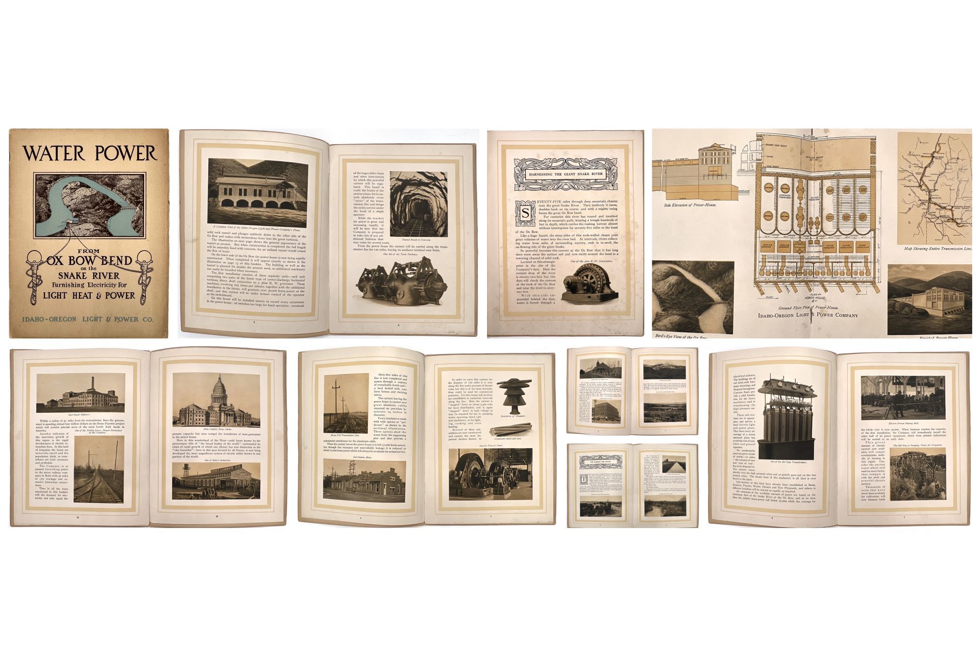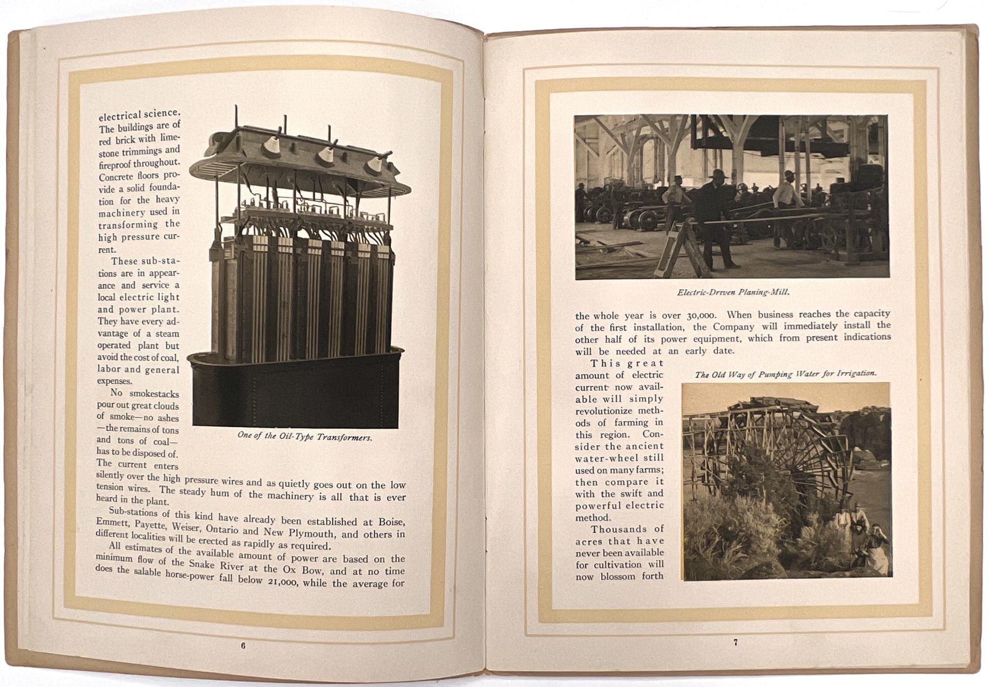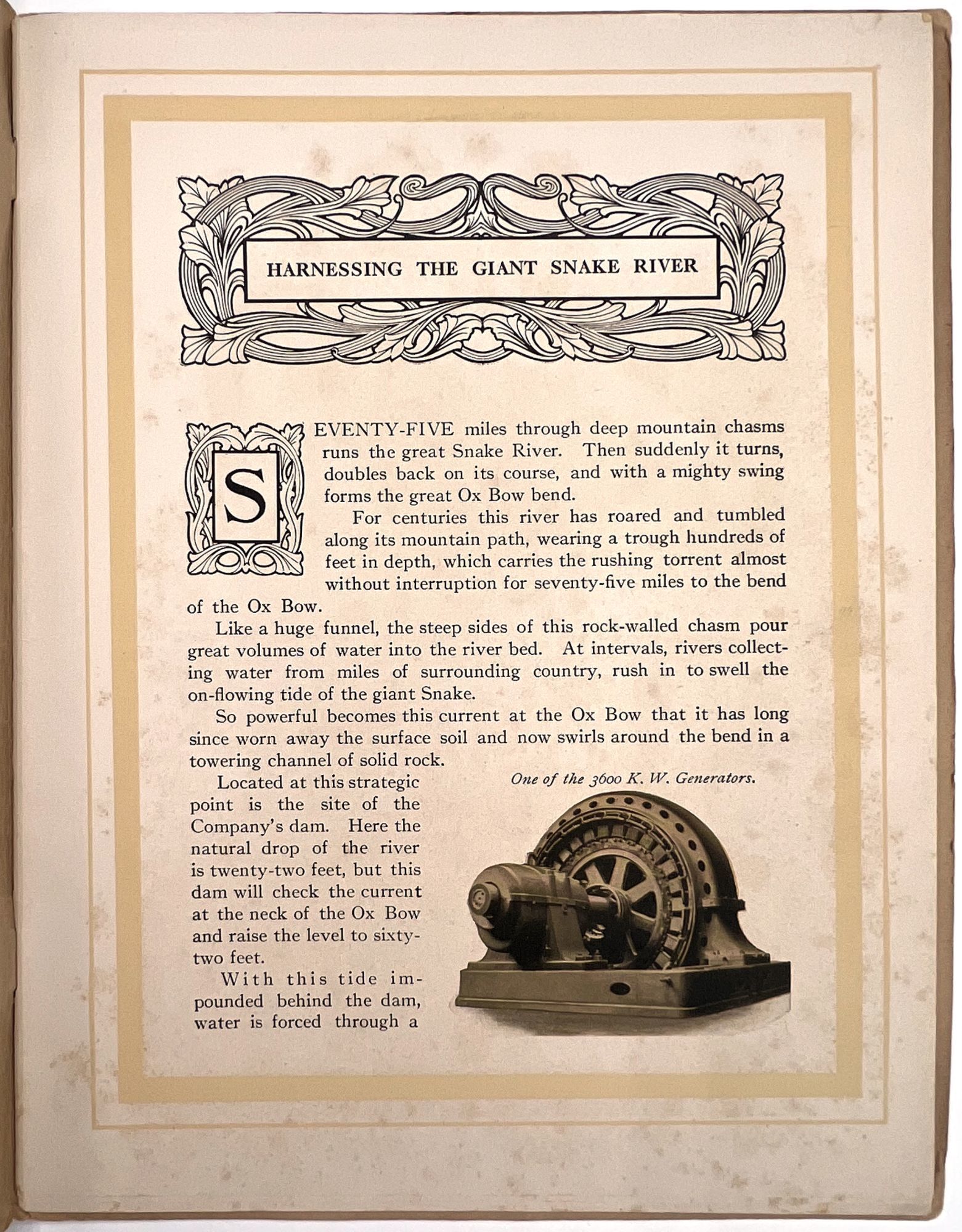 Oshkosh, Wisconsin: Idaho-Oregon Light & Power Co, 1909. Very good. Spotting.. A promotional booklet for the Idaho-Oregon Light & Power Co. highlighting their new hydroelectric project using currents "from Ox Bow Bend on the Snake River" on the border or Oregon and Idaho. Features an attractively designed wrapper with aerial view of the proposed site, and lines connected to two stylized electric torches on either side of the image. Includes photos and plans of the proposed site and construction, which is to be done by the Arnold Company of Chicago. Includes photos of the surrounding cities, highlighting the rapidly growing need for power. Single vol. (9.25" by 7"), pp. 24, illus., stapled in original illus. wrps.