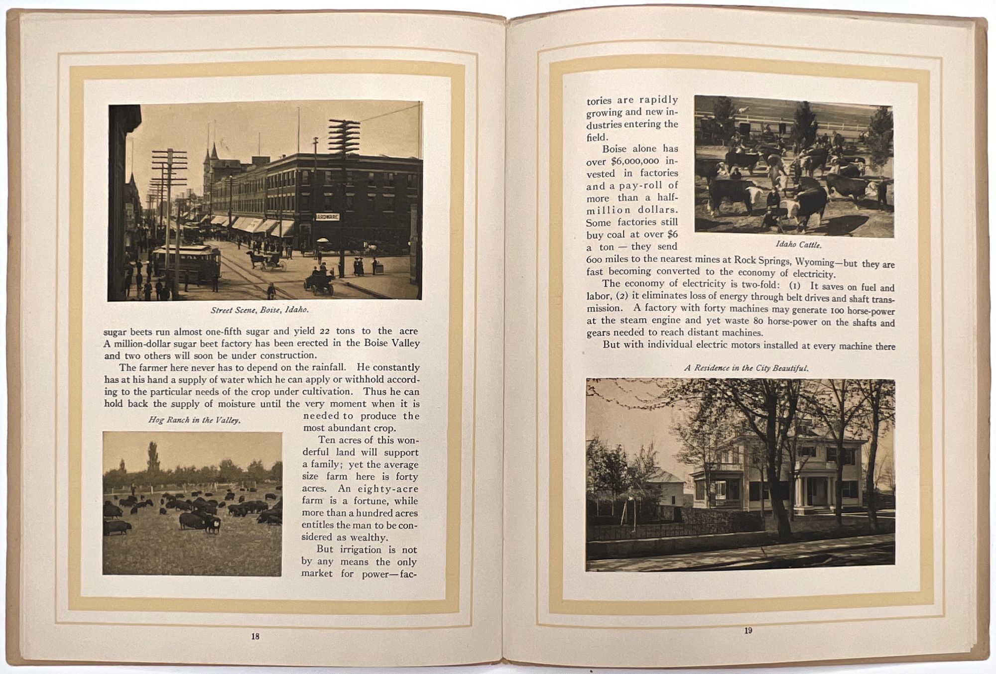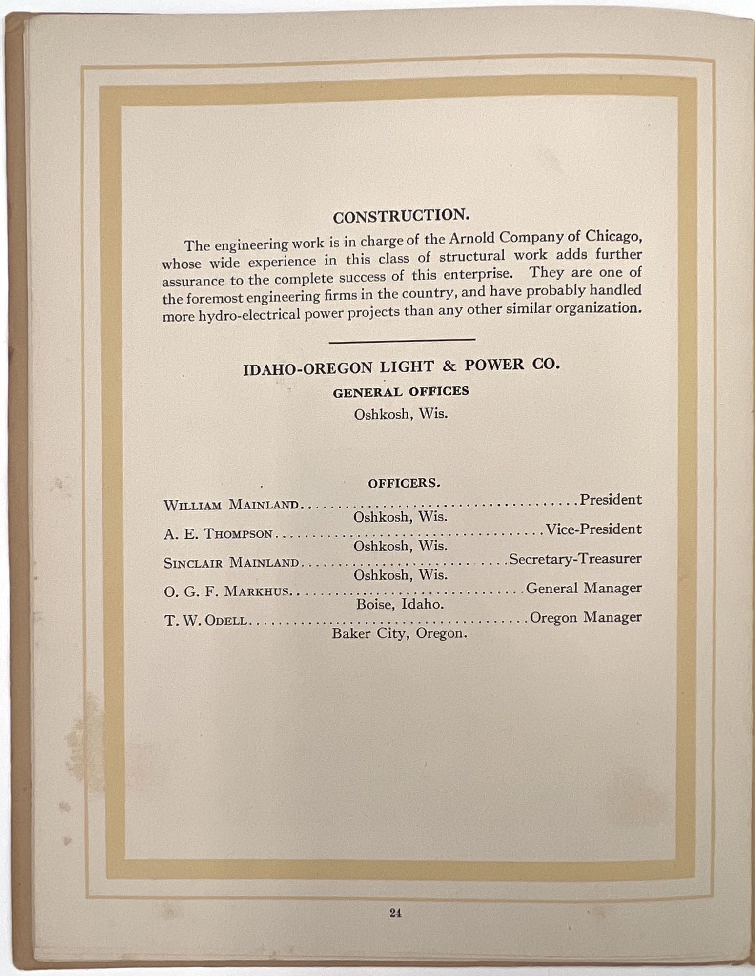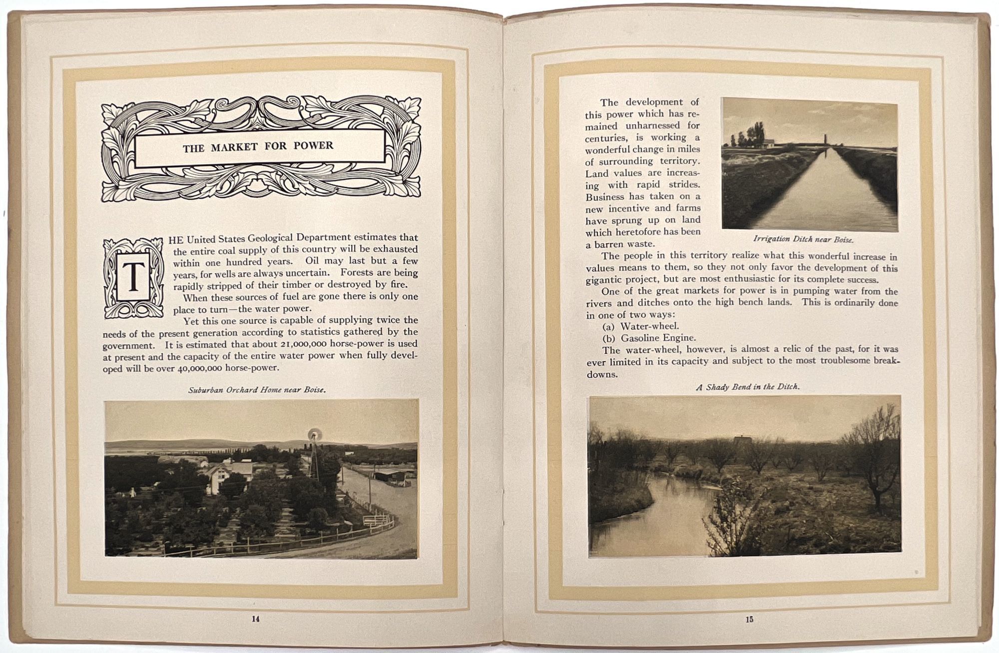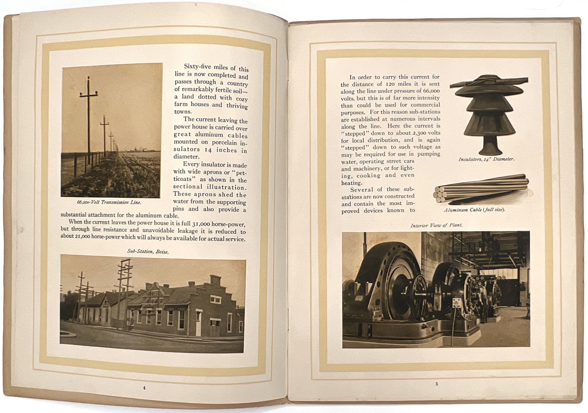 Oshkosh, Wisconsin: Idaho-Oregon Light & Power Co, 1909. Very good. Spotting.. A promotional booklet for the Idaho-Oregon Light & Power Co. highlighting their new hydroelectric project using currents "from Ox Bow Bend on the Snake River" on the border or Oregon and Idaho. Features an attractively designed wrapper with aerial view of the proposed site, and lines connected to two stylized electric torches on either side of the image. Includes photos and plans of the proposed site and construction, which is to be done by the Arnold Company of Chicago. Includes photos of the surrounding cities, highlighting the rapidly growing need for power. Single vol. (9.25" by 7"), pp. 24, illus., stapled in original illus. wrps.