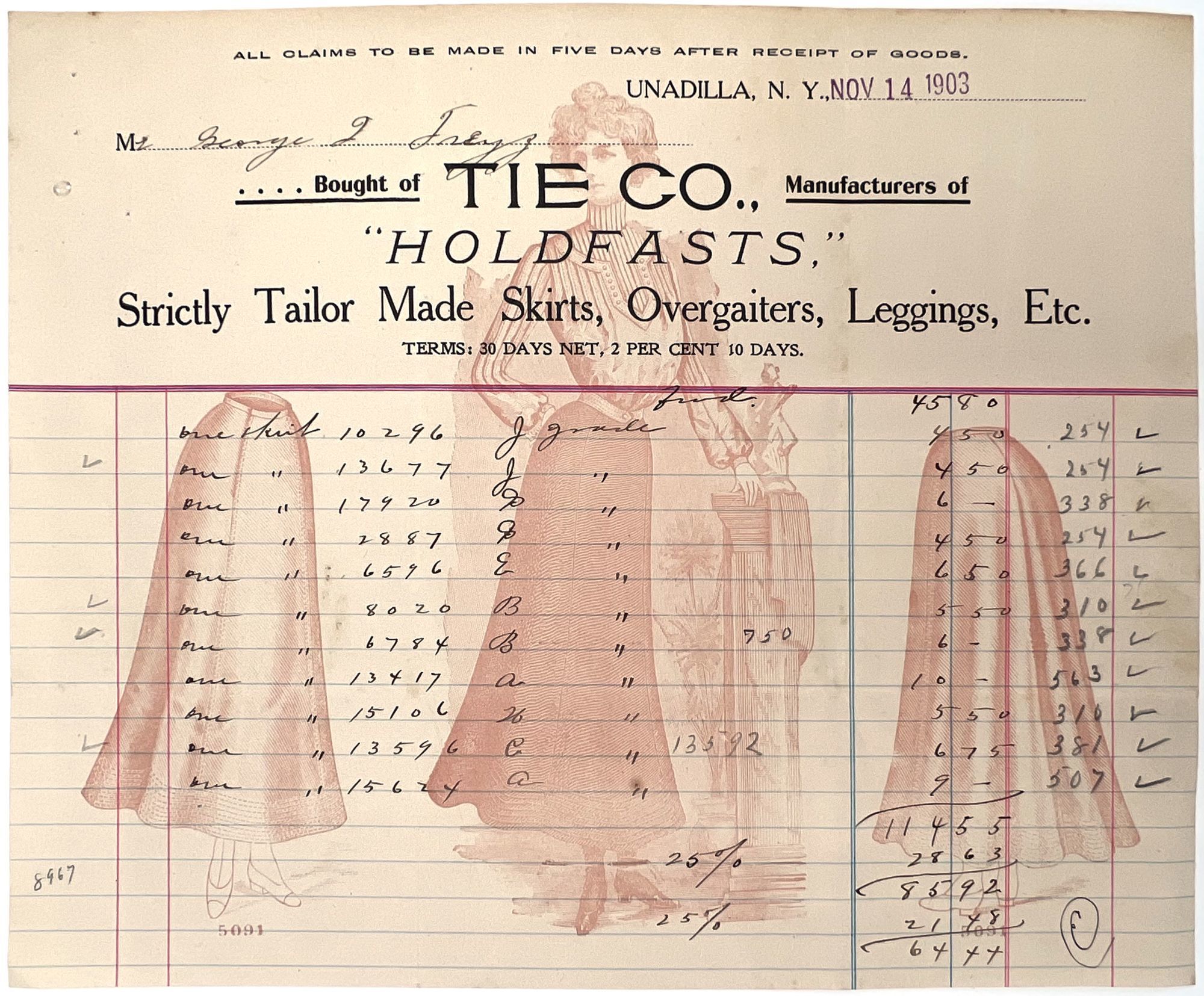 Unadilla, New York: Tie Co, 1903. Very good to near-fine. Minor toning, letter folds. A couple tiny pin pricks to paper.. Illustrated billhead for Tie Co., "manufacturers of 'Holdfasts,' Strictly Tailor Made Skirts, Overgaiters, Leggings, Etc.", finished in ink manuscript and dated November 14th, 1903. Made out to a Mr. George Q. Frenz(?), it records the sale of several skirts. The image in the background depicts a fashionable young woman styled in "Gibson Girl" hair and outfit with a skirt on either side of her. Measures approx. 7" by 8.5"), verso blank.