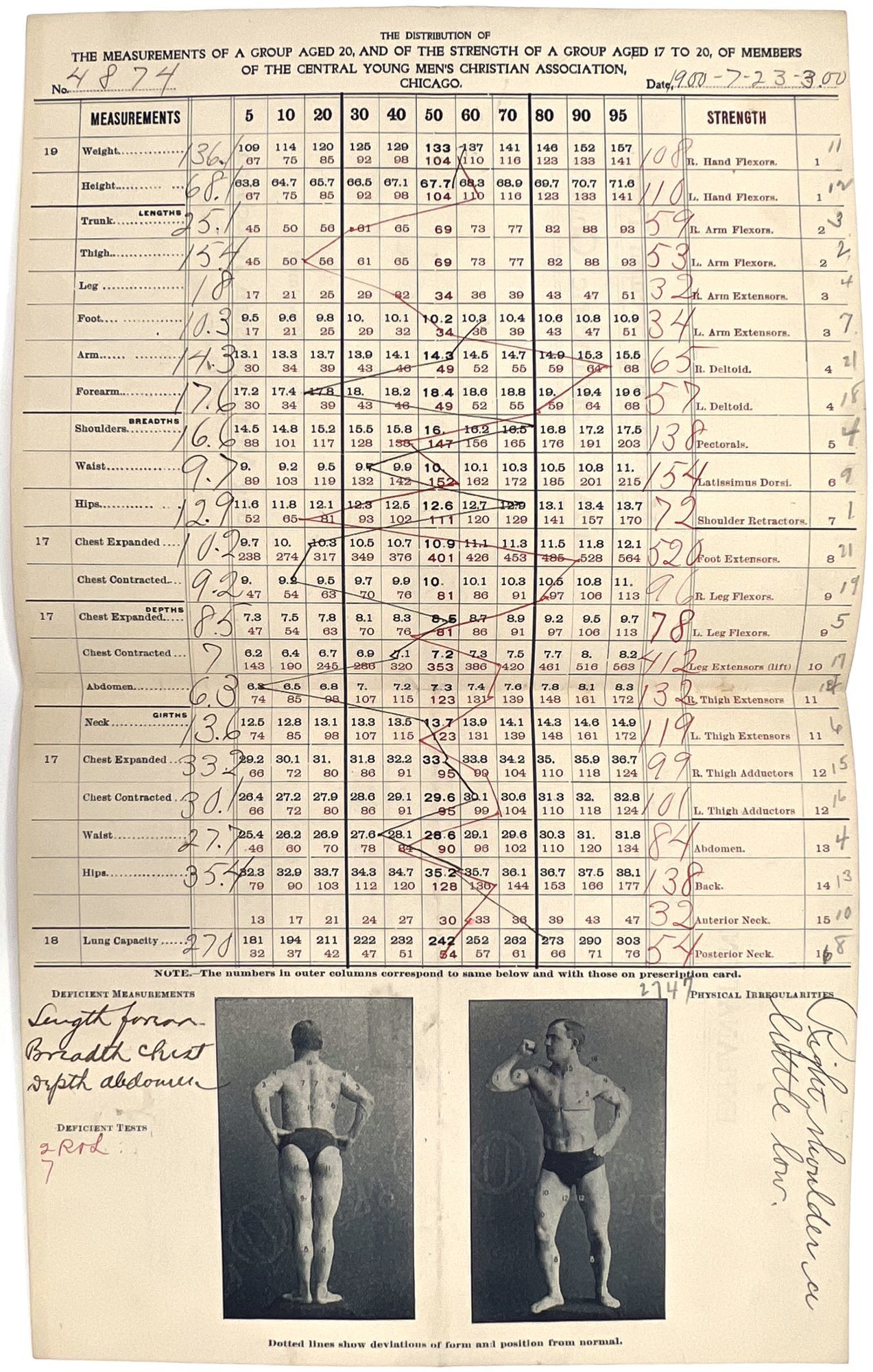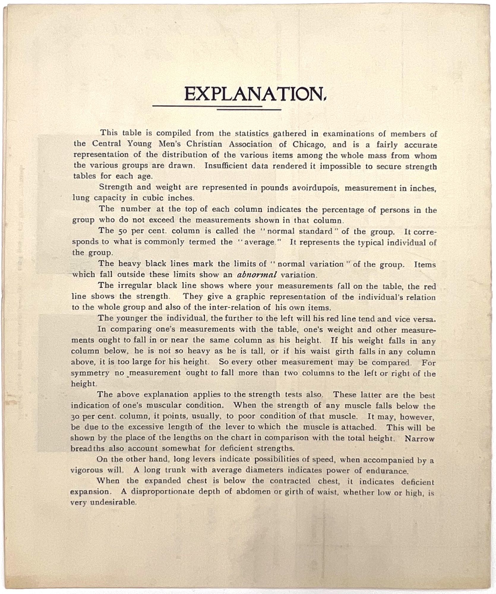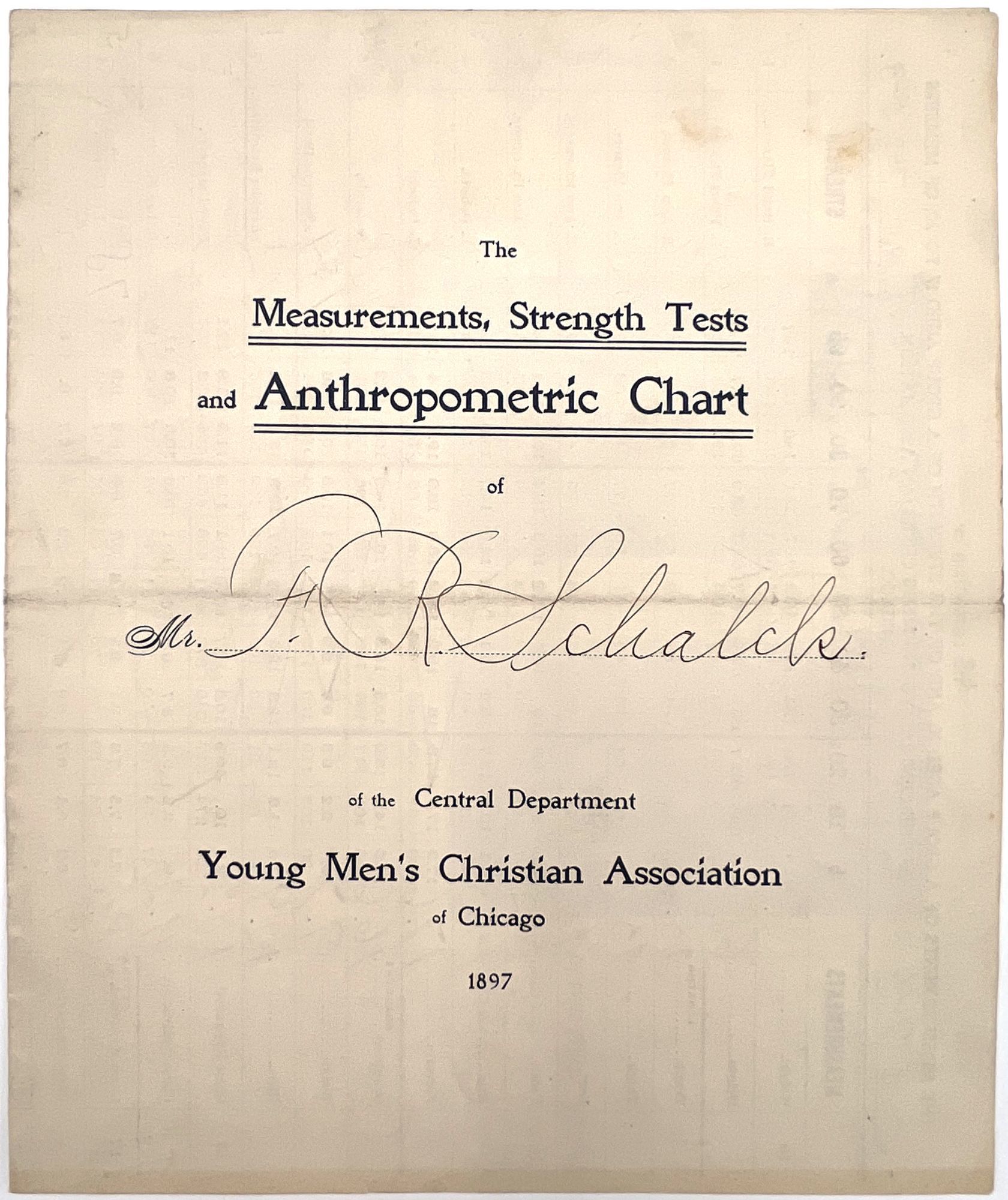 Chicago, Illinois: Young Men's Christian Association of Chicago, 1900. Near-fine. Some spotting, letter folds.. A custom physical fitness chart dated 1900 for a Mr. F.R. Schalck, filled out for him at the Young Men's Christian Association of Chicago. Data points include strength and size/measurements for different parts of the boy, height and weight. A photo of a body builder at the foot is labeled with each body part. Includes notes at the bottom for "physical irregularities" and "deficient measurements" and "tests". Methodology on back of bifolium. Bifolium measuring 7.5" by 6.25" folded.