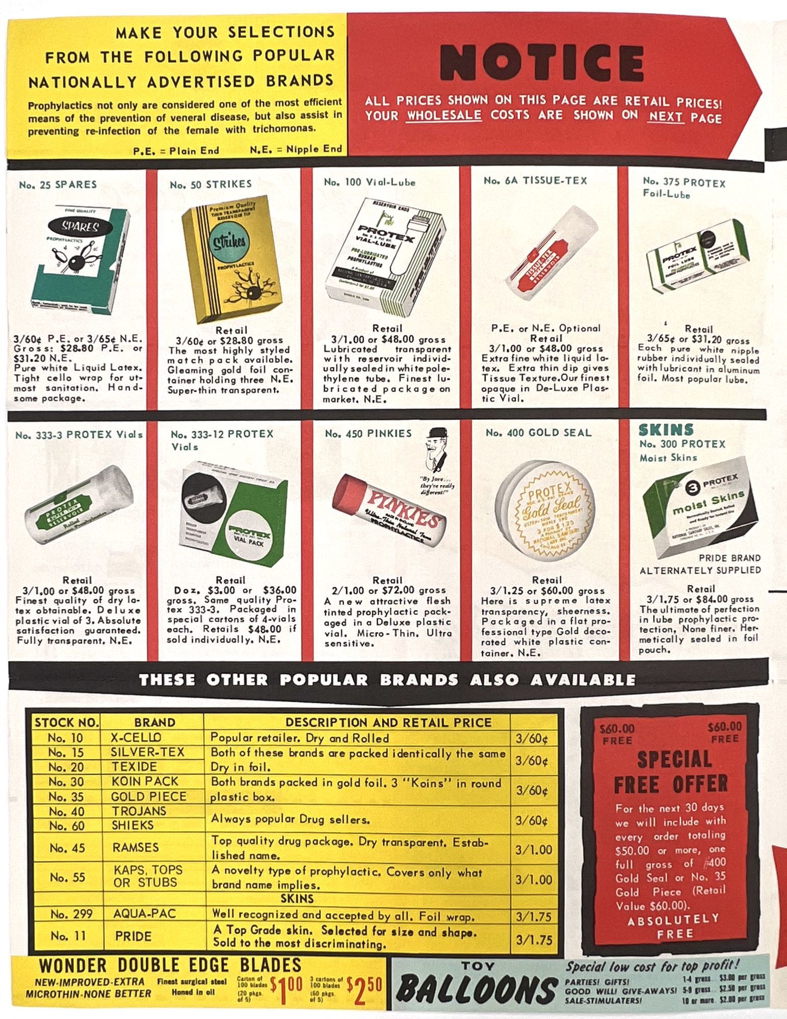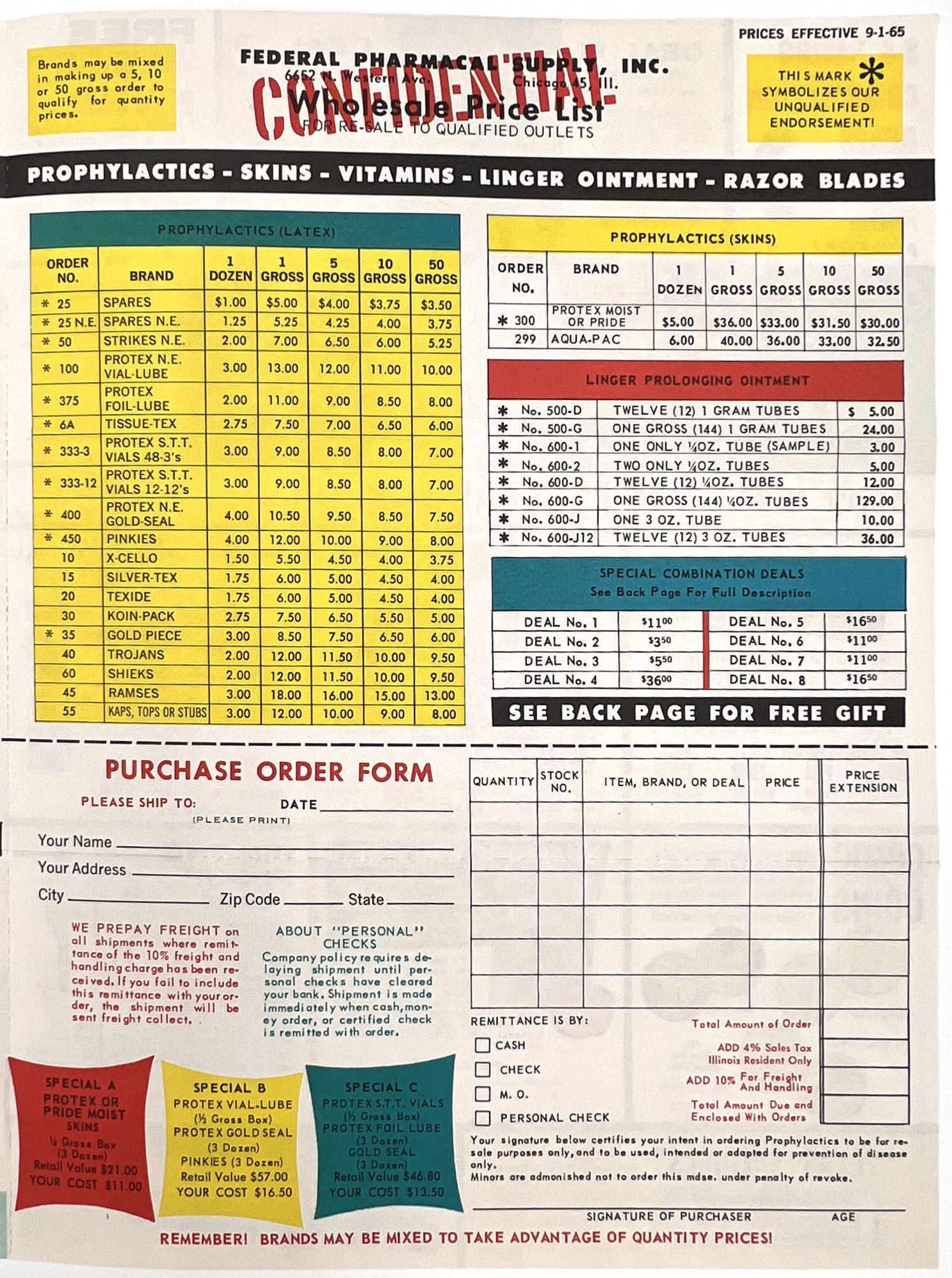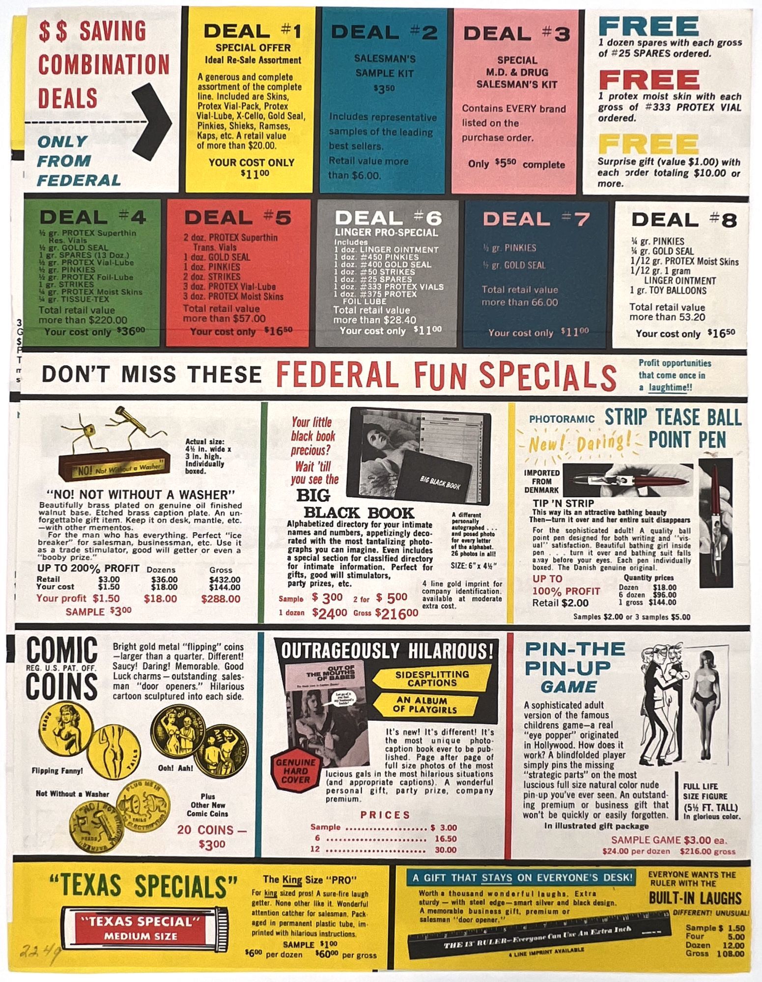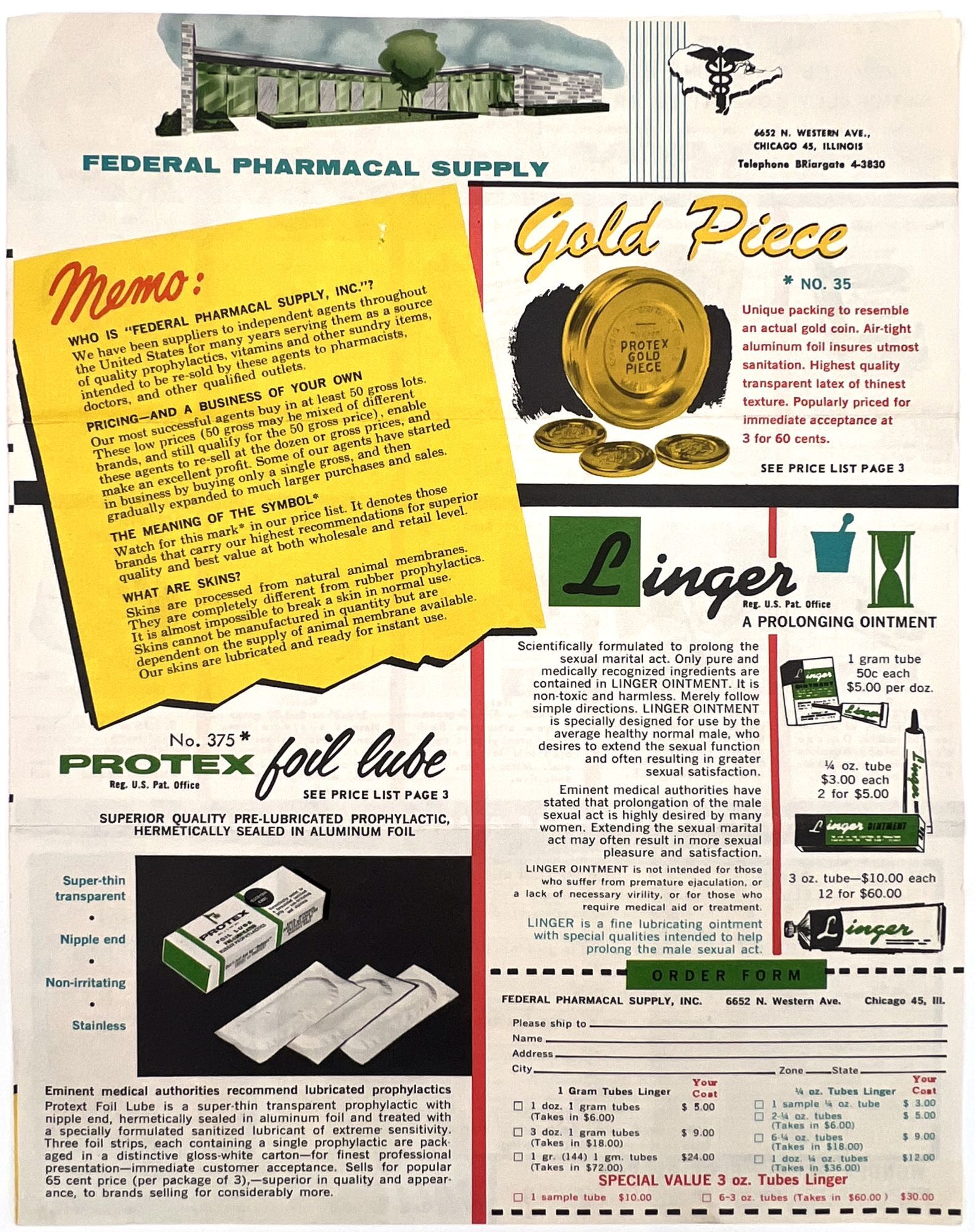 Chicago, Illinois: Federal Pharmacal Supply, Inc, 1965. Near-fine.. A brightly illustrated advertising leaflet for products by Federal Pharmacal Supply, Inc., with a focus on contraceptives. Includes several brands of prophylactics/condoms and a brand of numbing lubricant for men. Note the "Federal Fun Specials" on the back, which include novelty gifts such as: a strip tease ball point pen (the woman's clothes disappear when the pen is inverted); a pin-the-breasts on the blonde bimbo game; "comic coins" with breasts as the "heads" and a woman's rear as a "tails"; a "Big Black Book" for recording numbers and addresses of "intimate names"; and a comic photo book of "playgirls". As might be expected, the products are being marketed to single men. Includes order forms for businesses buying in bulk. Illus. bifolium (11" by 8.5") printed in color.