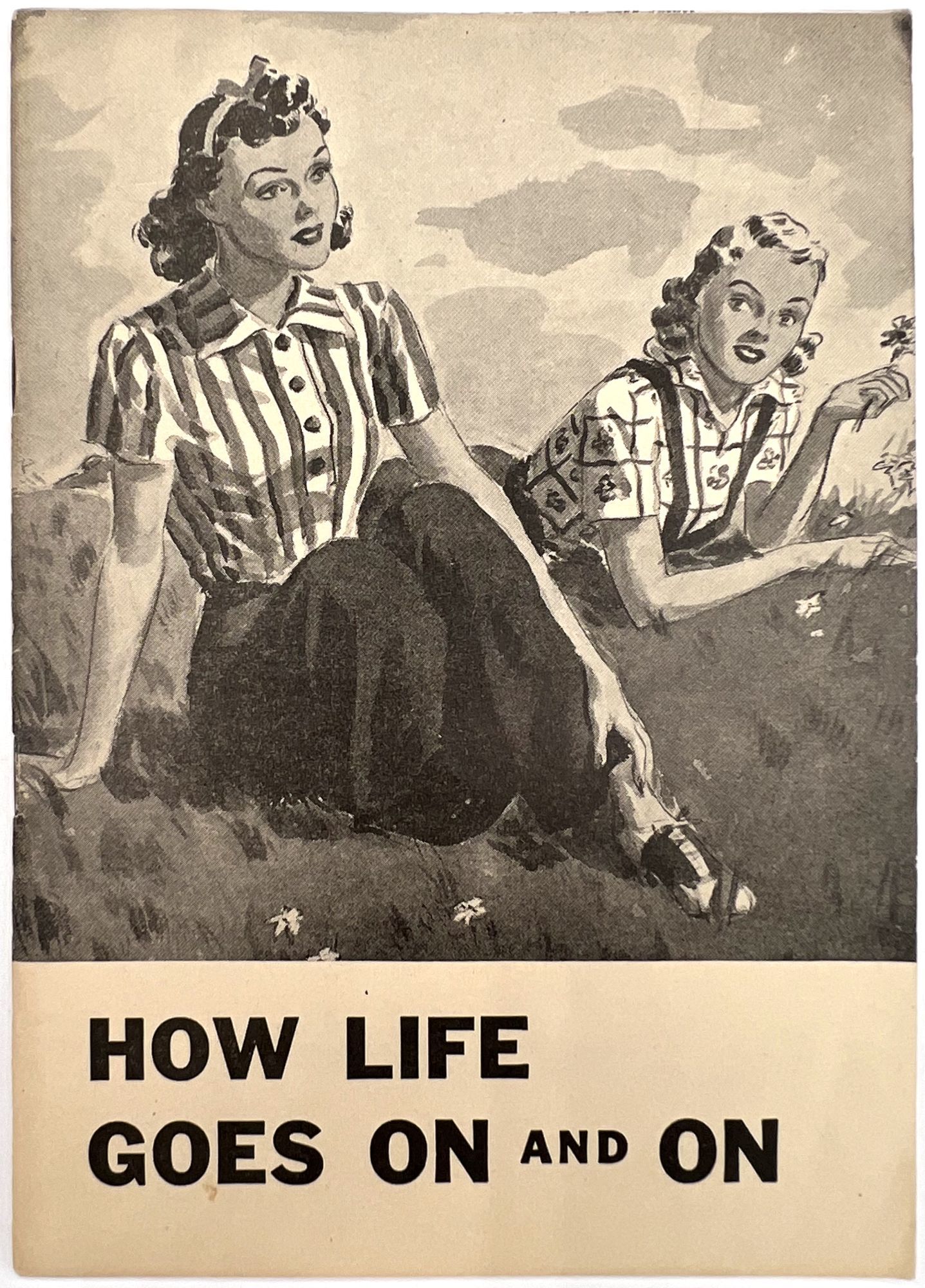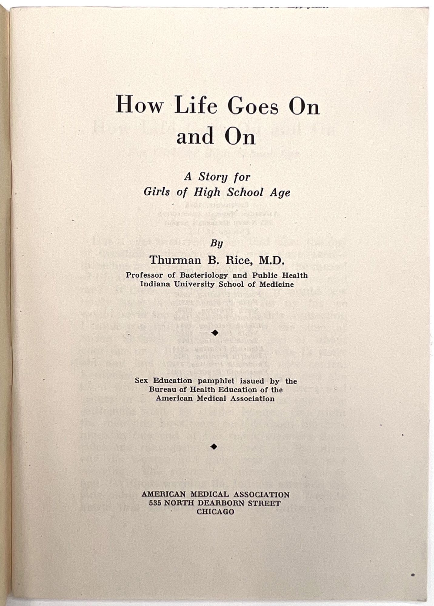 Thurman B. Rice, M.D. "How Life Goes on and On". Chicago, Illinois: American Medical Association, 1948. Single vol. (7.5" by 5.25"), pp. 44, stapled in original illus. wrappers with two teenage girls chatting on a meadow on upper cover. For teenage girls, offering sex education and advice on going steady.