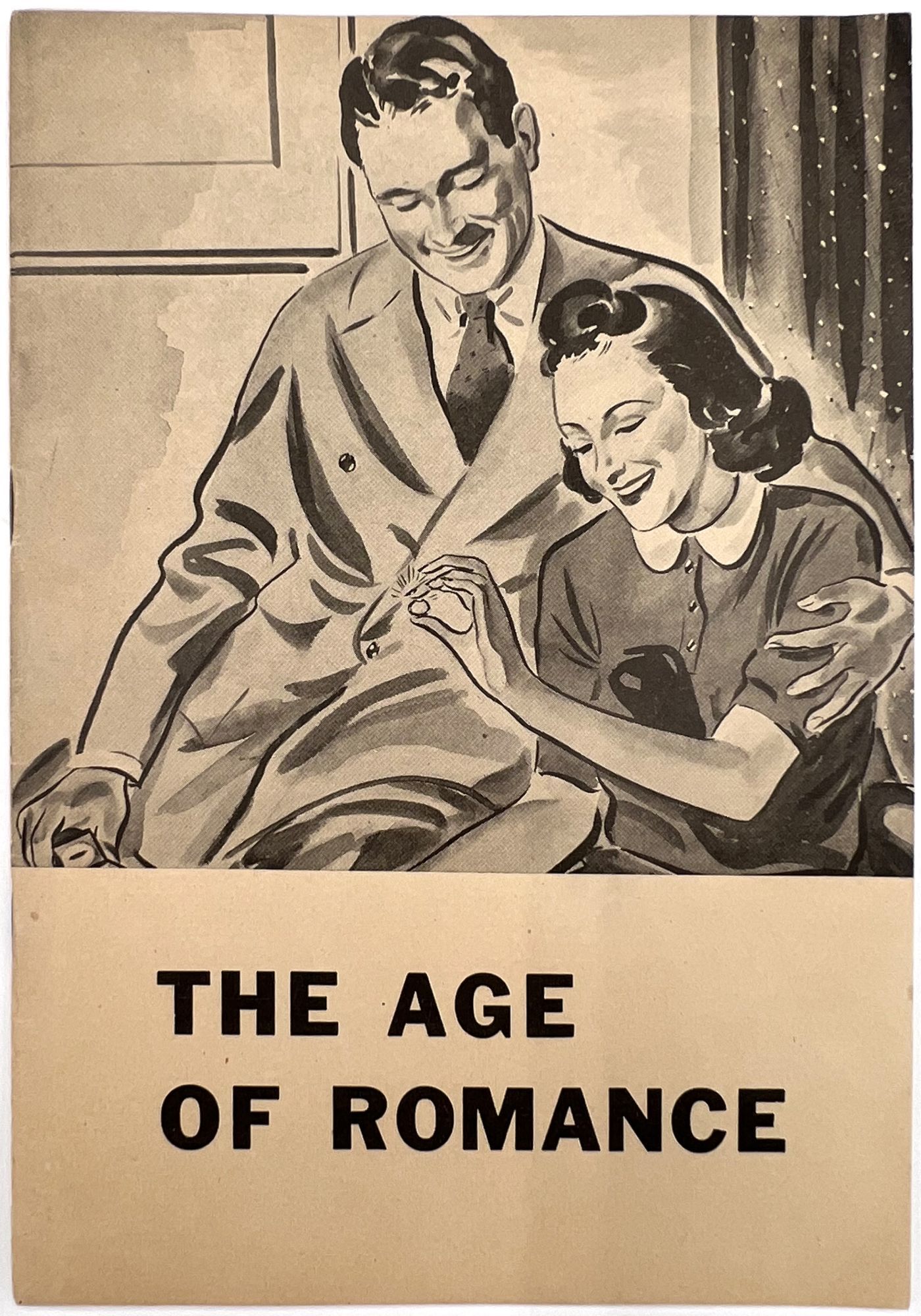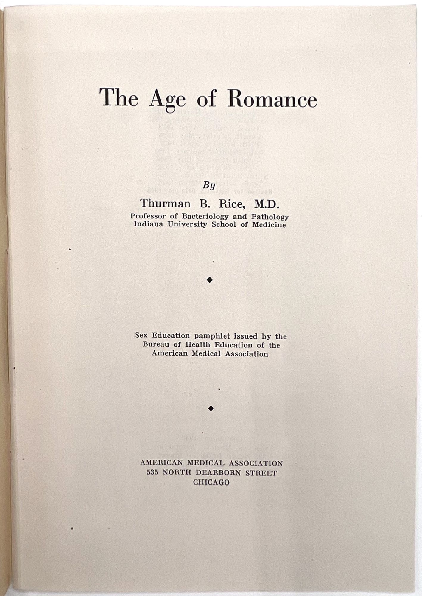 Thurman B. Rice, M.D. "The Age of Romance". Chicago, Illinois: American Medical Association, 1948. Single vol. (7.5" by 5.25"), pp. 43, [1], stapled in original illus. wrappers with a couple gazing at their engagement ring on the cover. Romance and sex education for engaged couples and newlyweds.