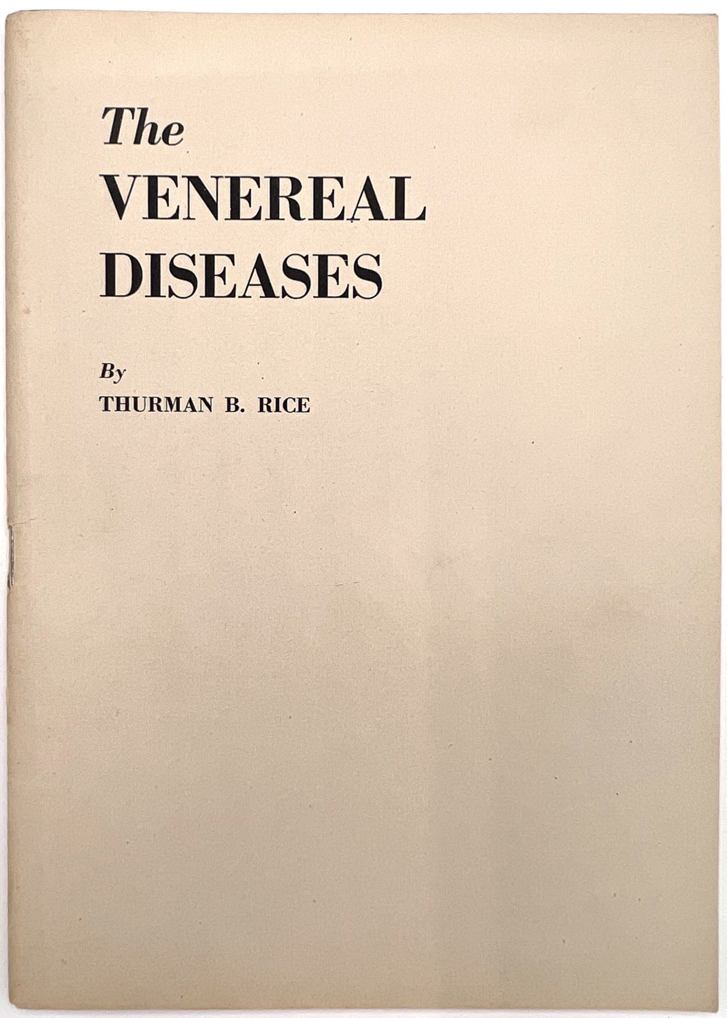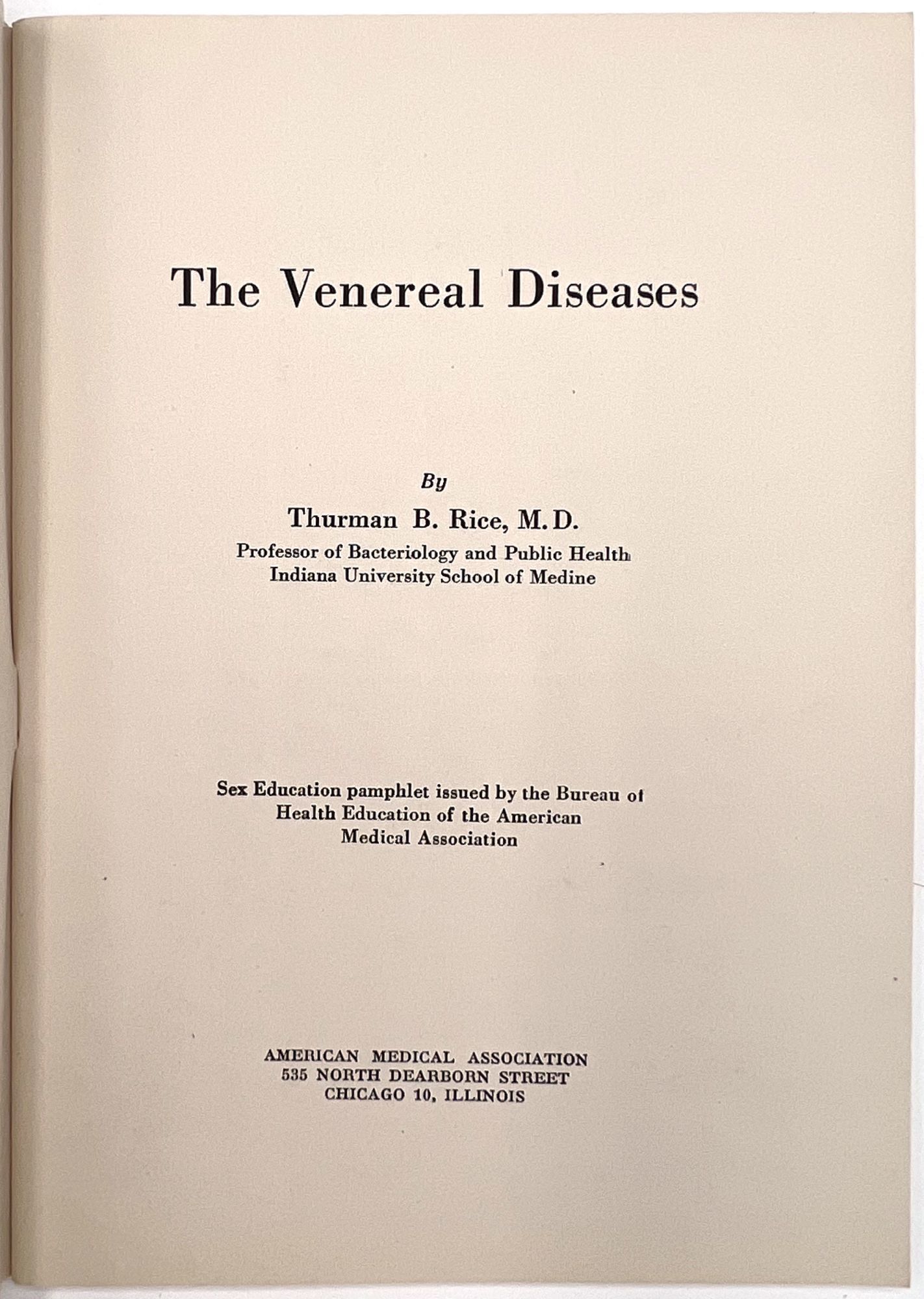 Thurman B. Rice, M.D. "The Venereal Diseases". Chicago, Illinois: American Medical Association, 1944. Single vol. (7.5" by 5.25"), pp. 46, [2], stapled in original printed wrps. For adults, warning about the dangers of venereal disease.
