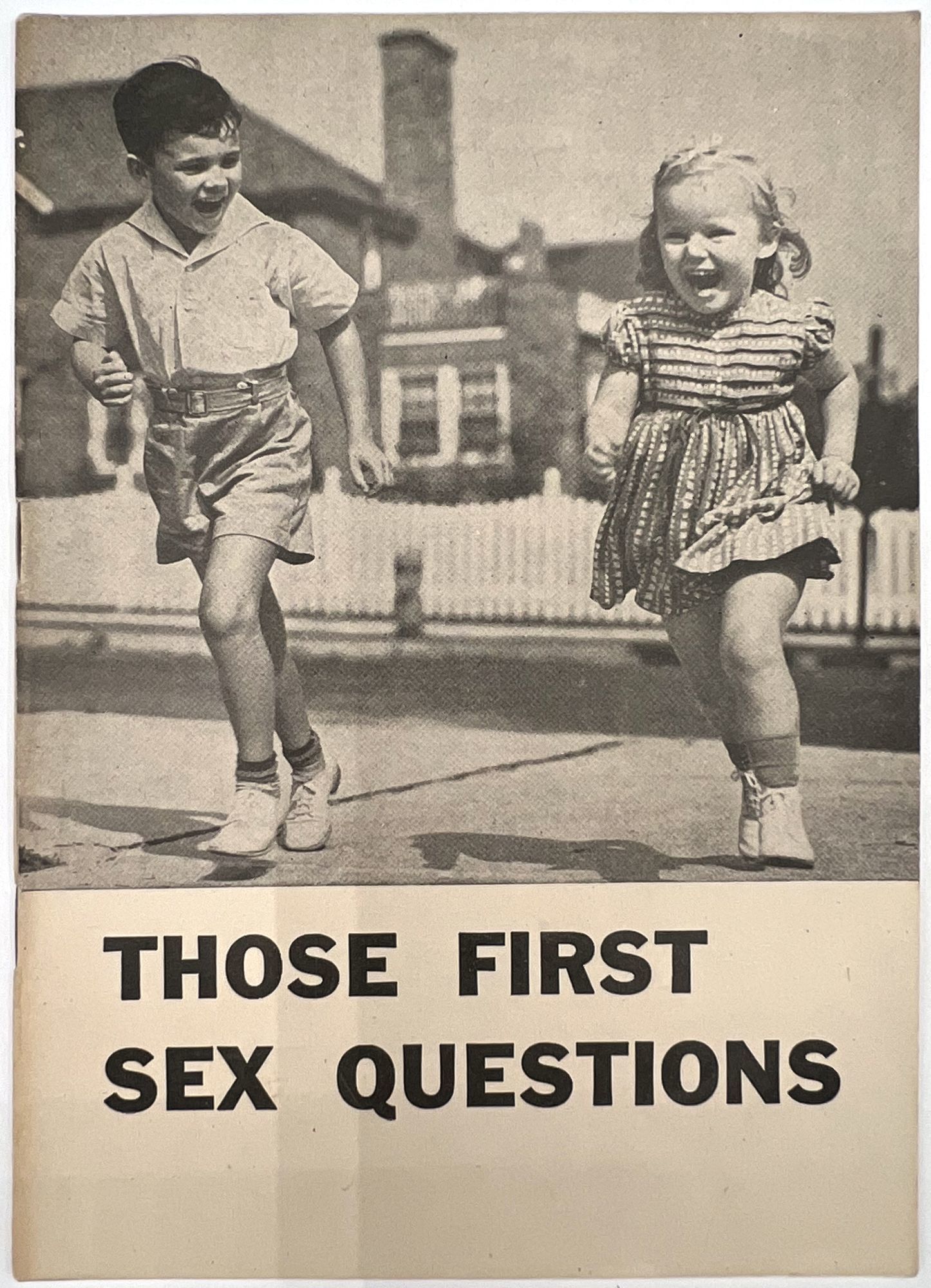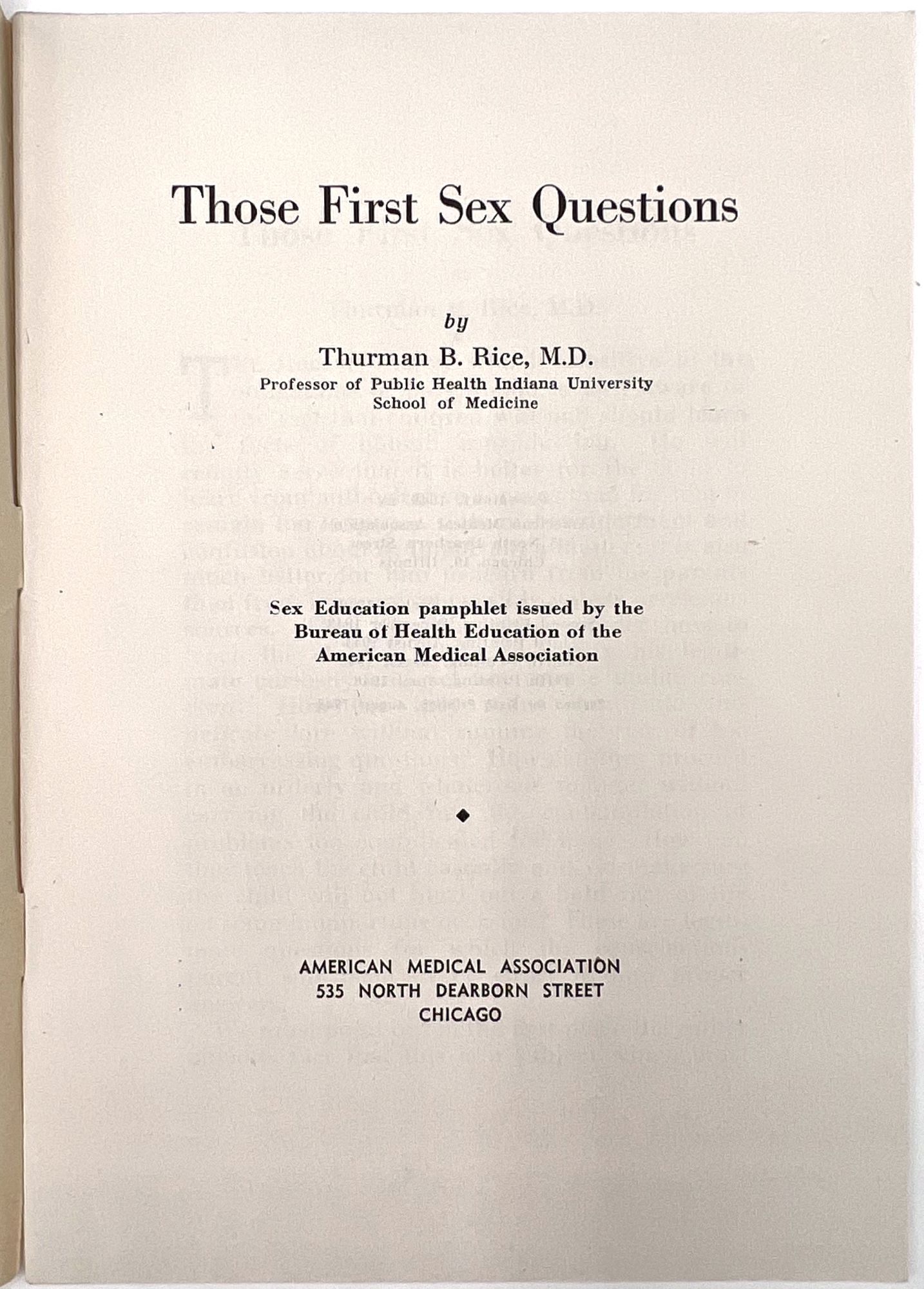Thurman B. Rice, M.D. "Those First Sex Questions". Chicago, Illinois: American Medical Association, 1948. Single vol. (7.5" by 5.25"), pp. 41, [1], stapled in original illus. wrappers with two small children playing on upper wrapper. A guide for parents on how to answer questions about sex posed by young children.