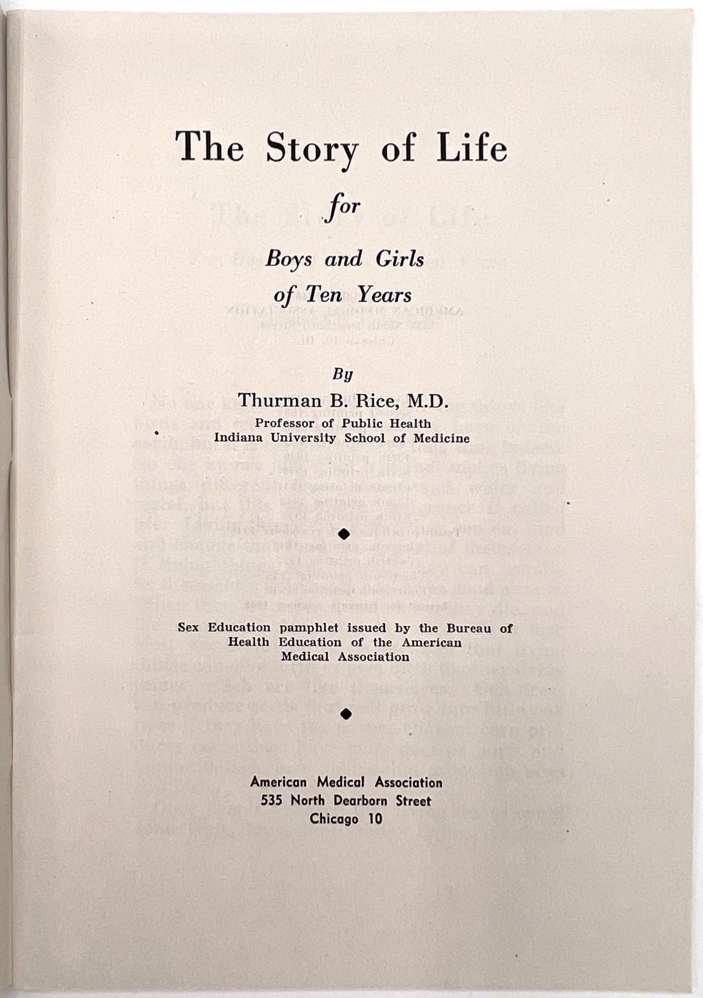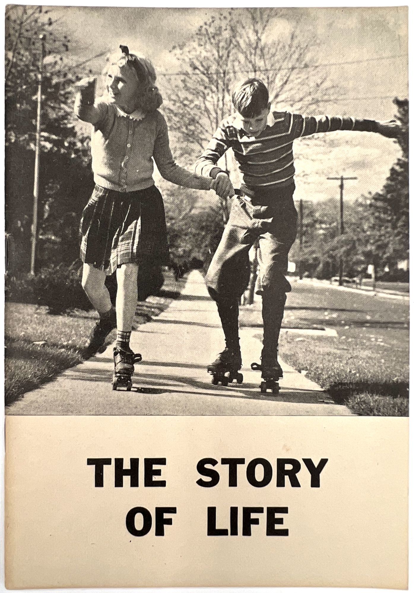 Thurman B. Rice, M.D. "The Story of Life". Chicago, Illinois: American Medical Association, 1948. Single vol. (7.5" by 5.25"), pp. 38, [2], stapled in original illus. wrappers with two children roller skating on upper wrapper. A booklet for ten-year-olds on human reproduction, relying heavily on nature and animal metaphors to explain the concepts.