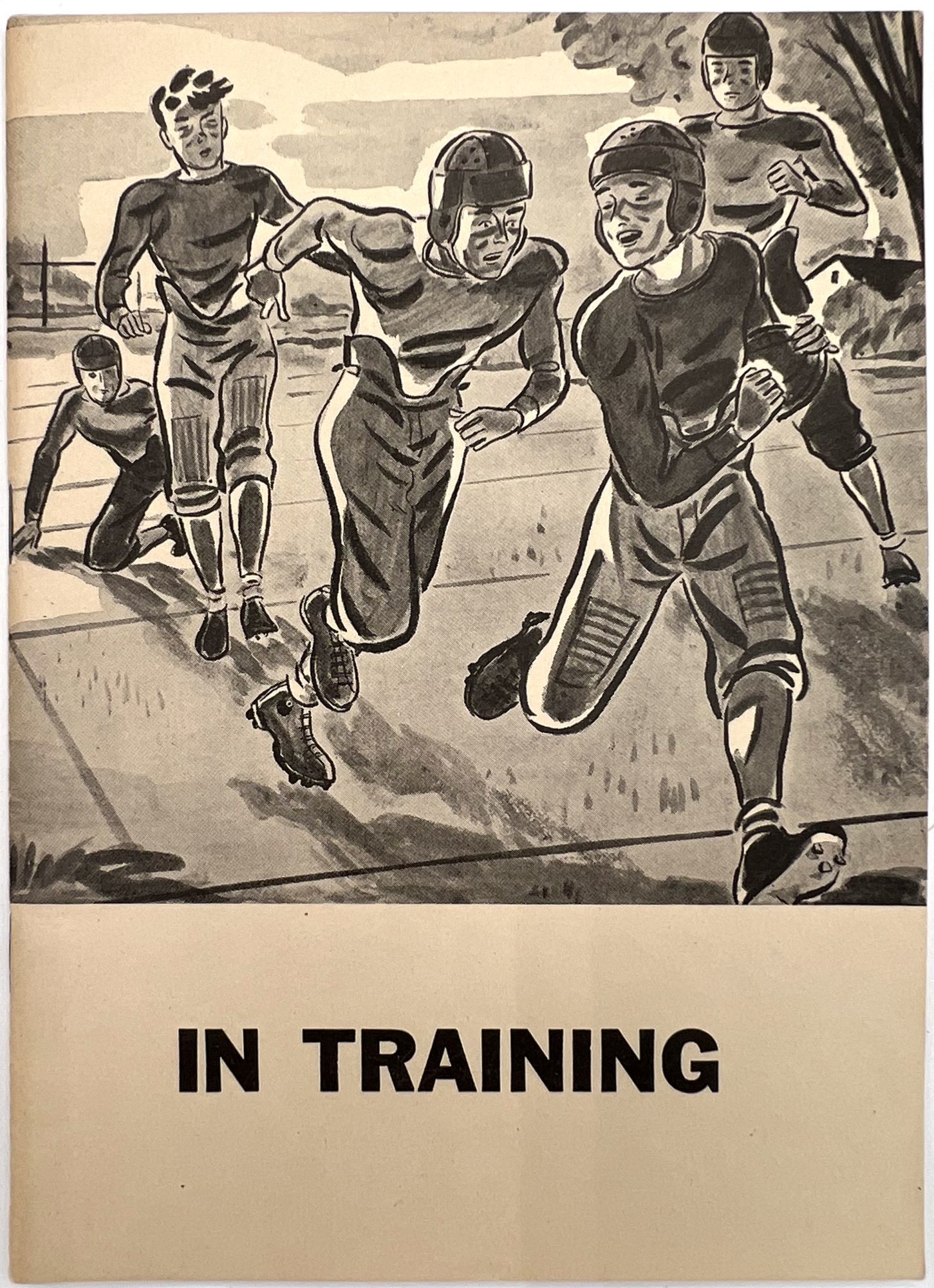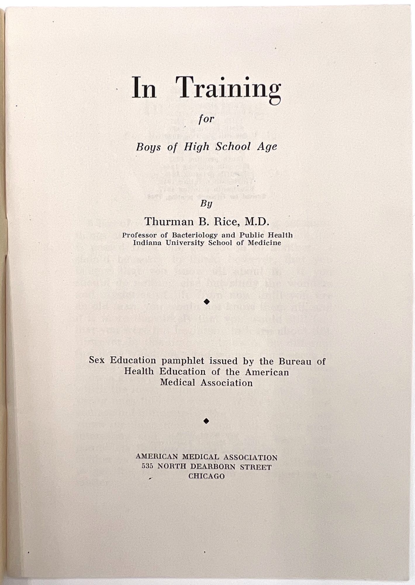 Thurman B. Rice, M.D. "In Training". Chicago, Illinois: American Medical Association, 1948. Single vol. (7.5" by 5.25"), pp. 49, [1], stapled in original illus. wrappers with boys playing football on upper wrapper. For boys in high school, including sex education.