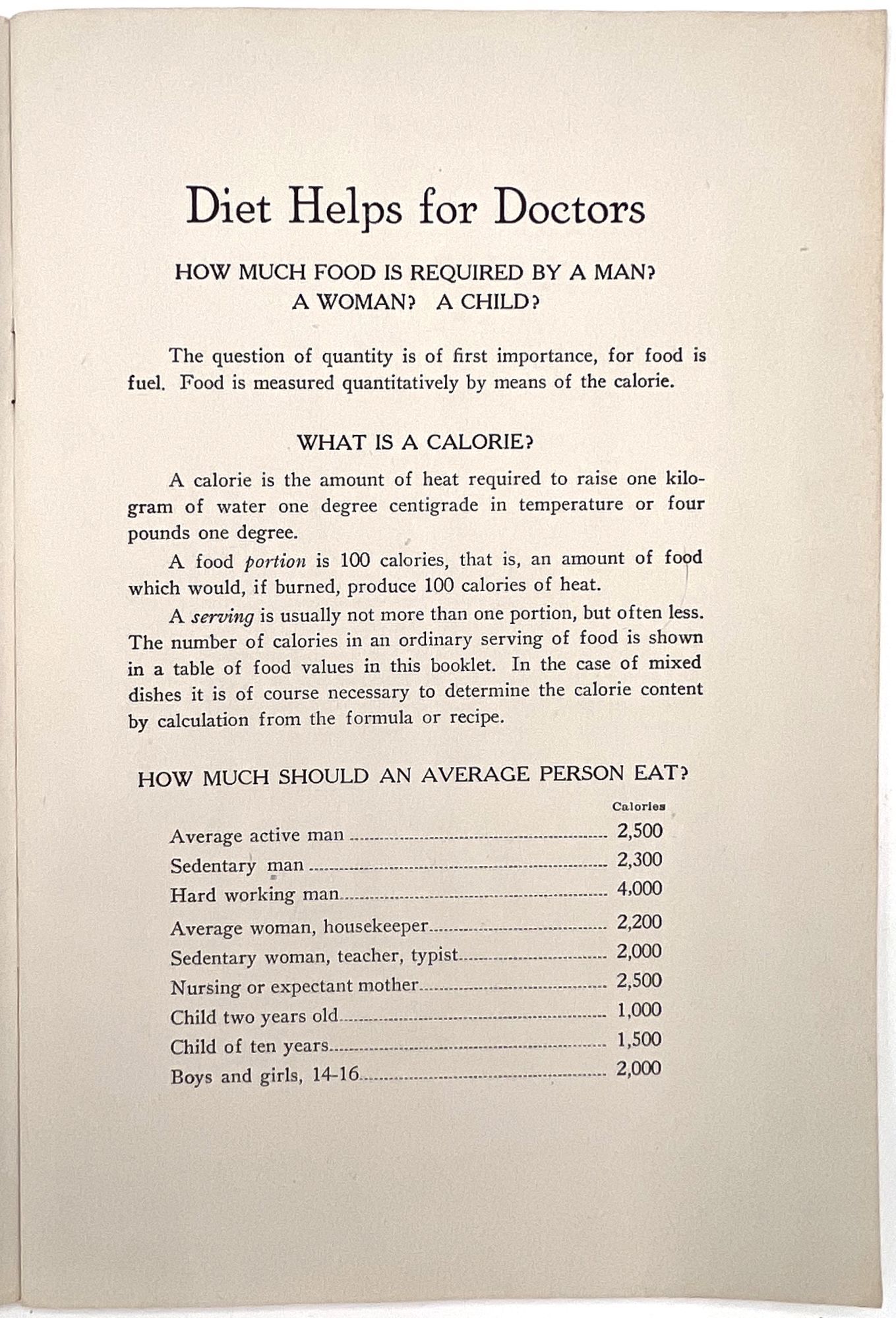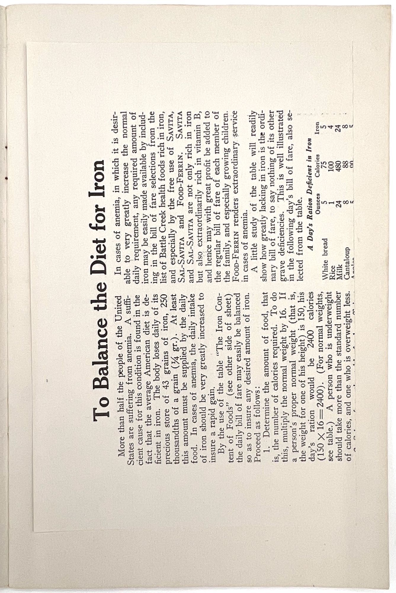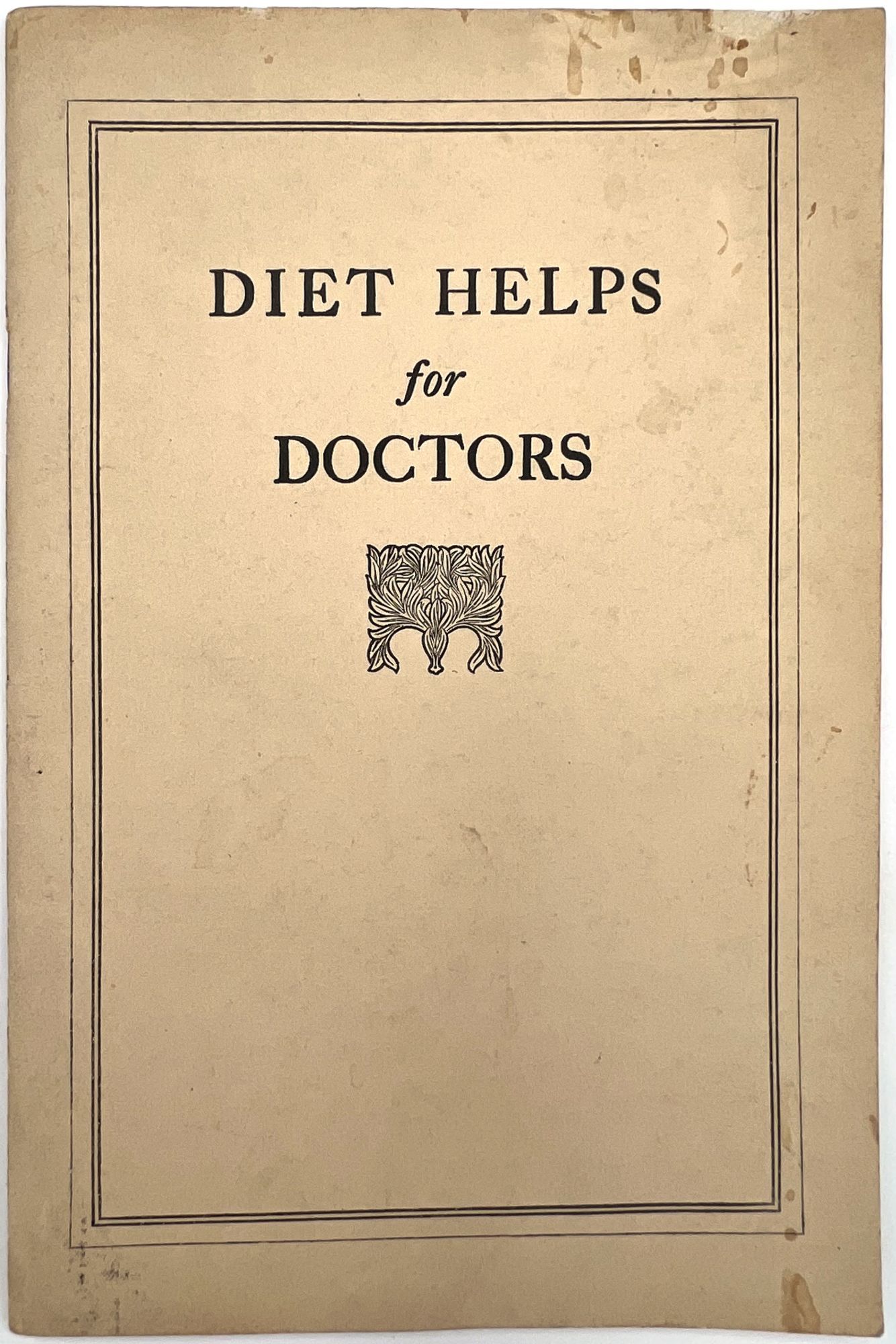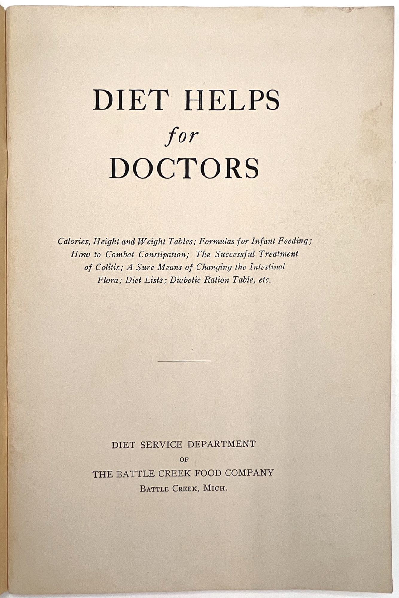 Battle Creek, Michigan: Battle Creek Food Company, 1928. Very good.. An interesting view into nutritional care in the late 1920s: a guide to building a better diet for family doctors and general practitioners, published by the makers of the laxative "Psylla" and the probiotic "Lacto-Dextrin". Includes information on a range of subjects, from ideal infant nutrition to foods for high blood pressure, weight loss or gain, diabetes, bone and blood "building", anemia, and even "Foods for persons sensitized to Animal Protein". Note the charts provided for ideal height and weight, infant feeding, caloric intake, and vitamin values for foods; there is also a chart of calories burned by profession, including "Office man", "Bookbinder", "Shoemaker", "Painter", and "Man Sawing Wood". Advertises the Company's products throughout, with additional advertisements in the rear. Single vol. (9" by 6"), pp. 43, [3], original printed wrps with floral motif on upper wrapper. The Battle Creek Food Company was a branch of, and eventual competitor to, the Kellogg Food Co. Each was owned by one of the Kellogg Brothers, and became competitors after a falling out.
