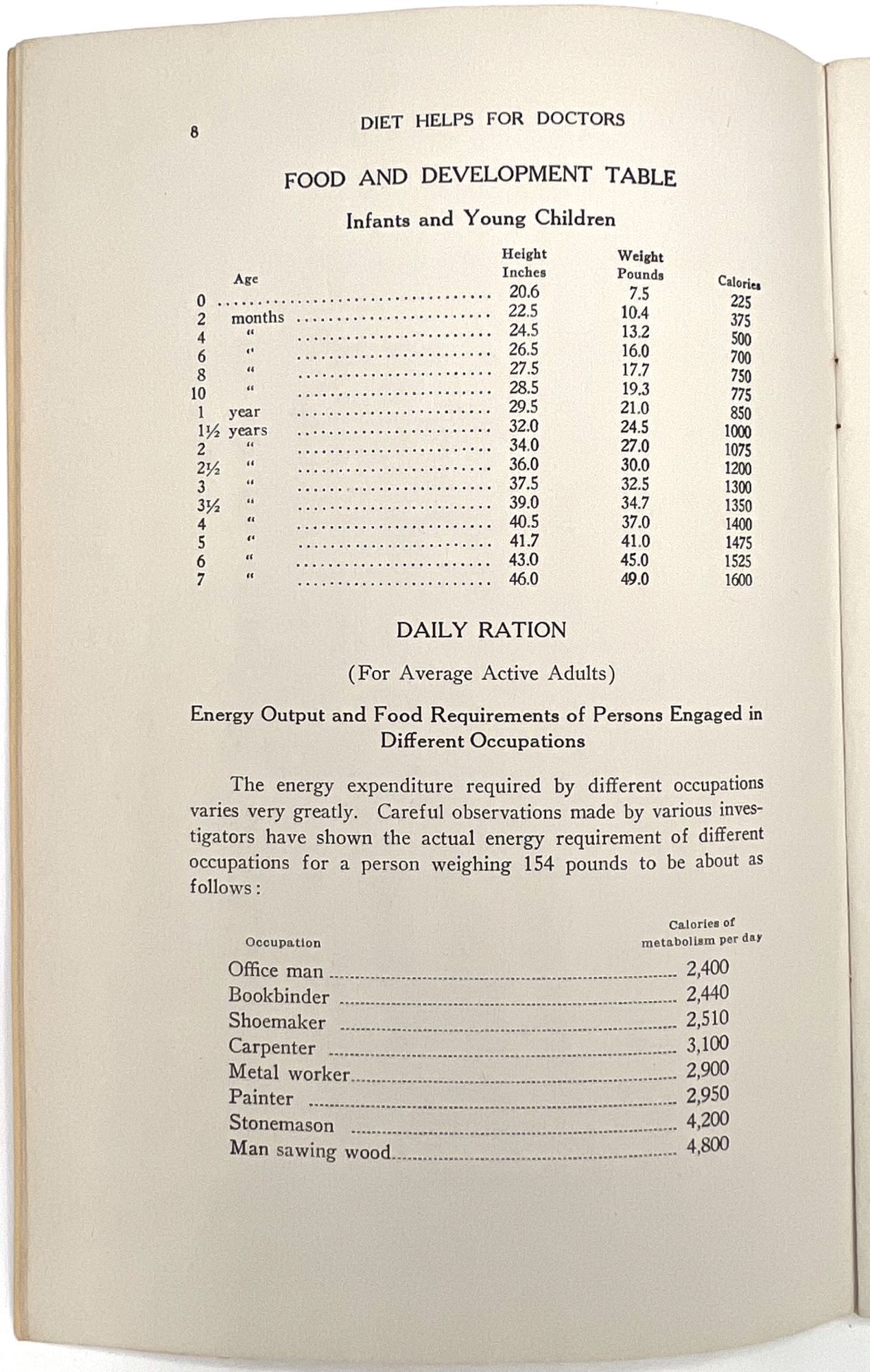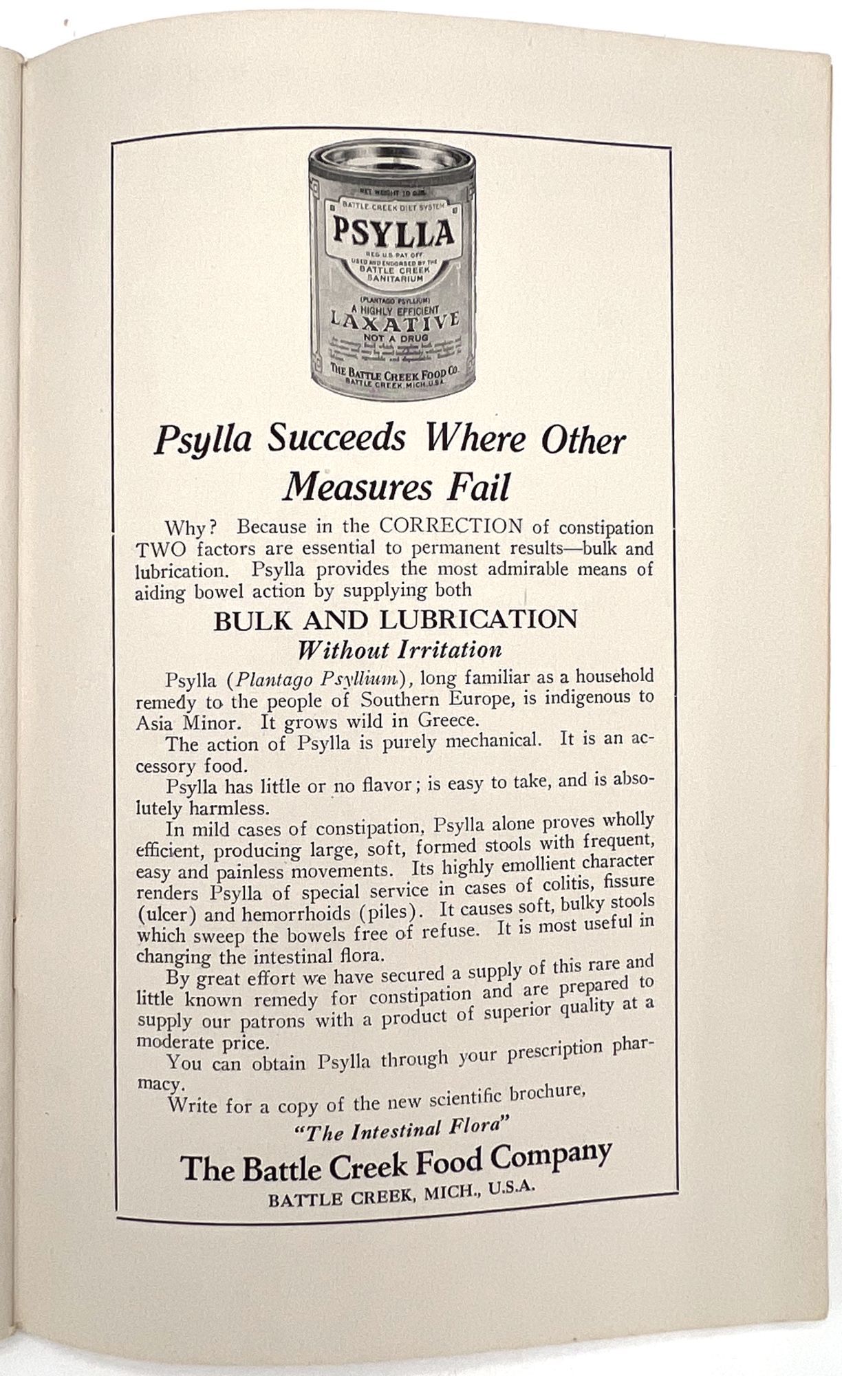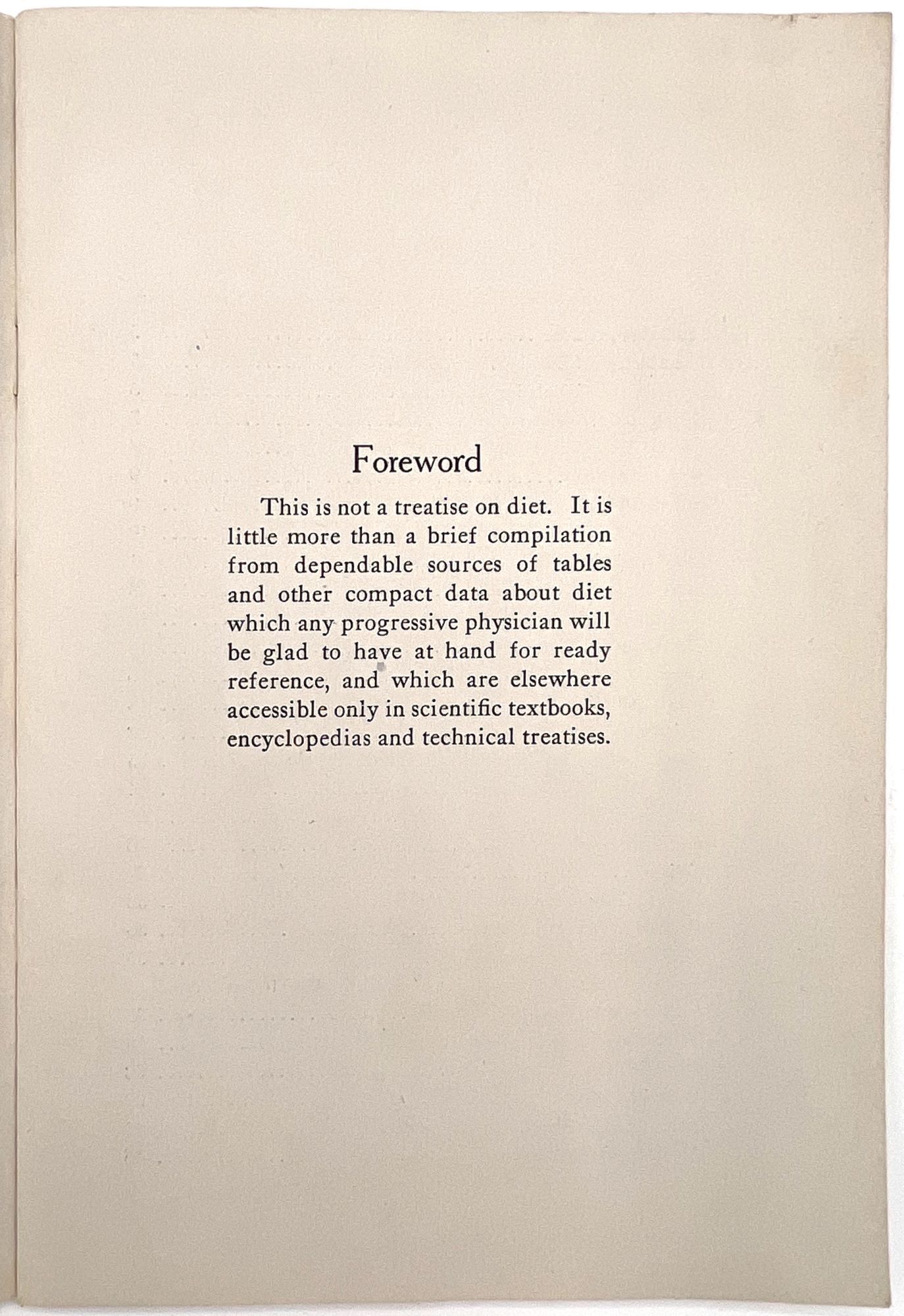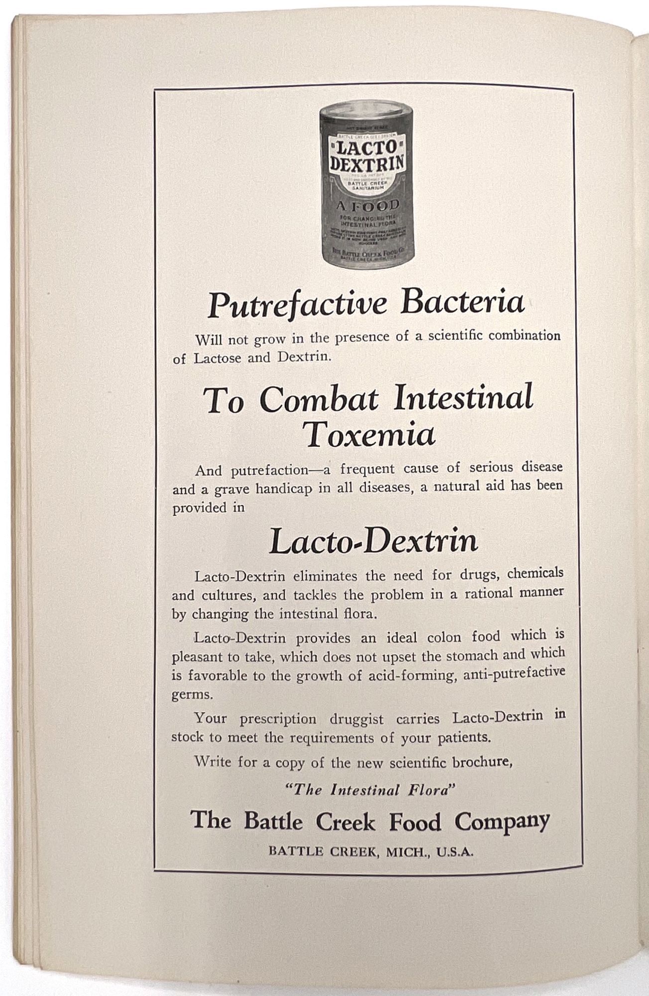 Battle Creek, Michigan: Battle Creek Food Company, 1928. Very good.. An interesting view into nutritional care in the late 1920s: a guide to building a better diet for family doctors and general practitioners, published by the makers of the laxative "Psylla" and the probiotic "Lacto-Dextrin". Includes information on a range of subjects, from ideal infant nutrition to foods for high blood pressure, weight loss or gain, diabetes, bone and blood "building", anemia, and even "Foods for persons sensitized to Animal Protein". Note the charts provided for ideal height and weight, infant feeding, caloric intake, and vitamin values for foods; there is also a chart of calories burned by profession, including "Office man", "Bookbinder", "Shoemaker", "Painter", and "Man Sawing Wood". Advertises the Company's products throughout, with additional advertisements in the rear. Single vol. (9" by 6"), pp. 43, [3], original printed wrps with floral motif on upper wrapper. The Battle Creek Food Company was a branch of, and eventual competitor to, the Kellogg Food Co. Each was owned by one of the Kellogg Brothers, and became competitors after a falling out.