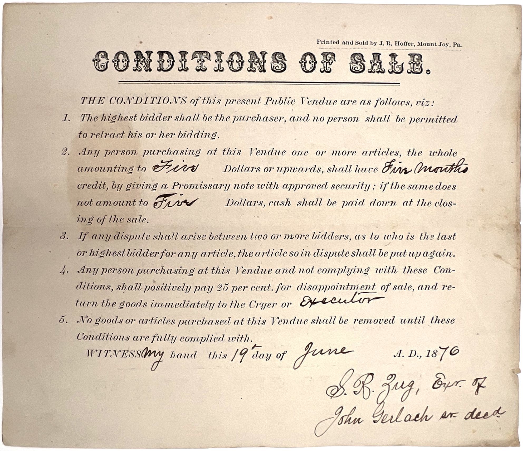 Mount Joy, Pennsylvania: J.R. Hoffer, 1876. Near-fine. Minor staining, a couple chips.. Lithographed legal agreement, finished in ink and dated June 19th, 1876, recording the conditions of sale for an upcoming auction of what appears to be the estate of a deceased man, John Gerlach. Signed by "S.R. Zug(?)", the executor of the estate. No location is recorded, but the document was lithographed by J.R. Hoffer of Mount Joy, Pennsylvania. Measures approx. 7" by 8.25", arithmetic in pencil on verso.