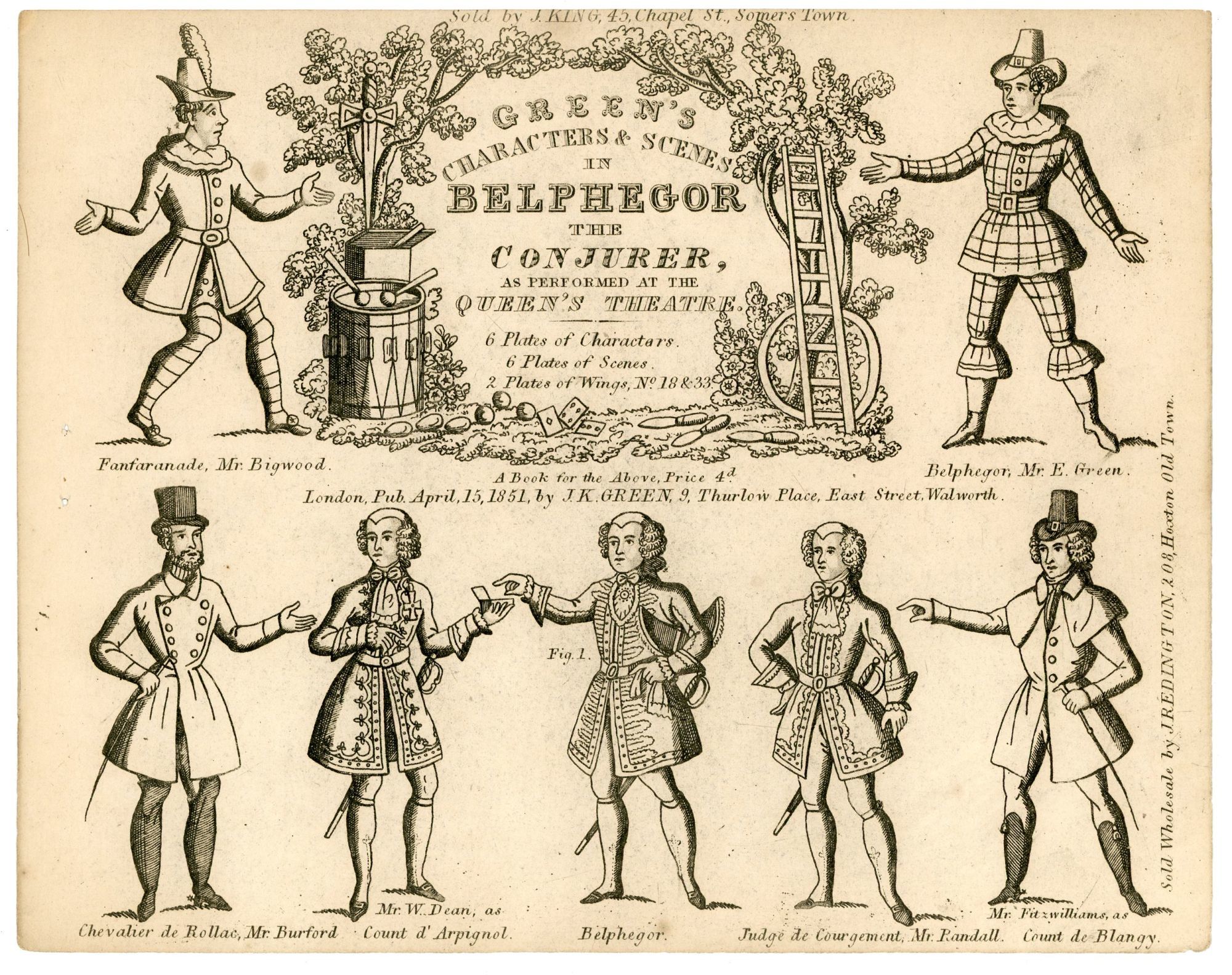 · A fanciful handbill for Jonathan King Sr. promoting Green’s Characters & Scenes in Belphegor the Conjurer