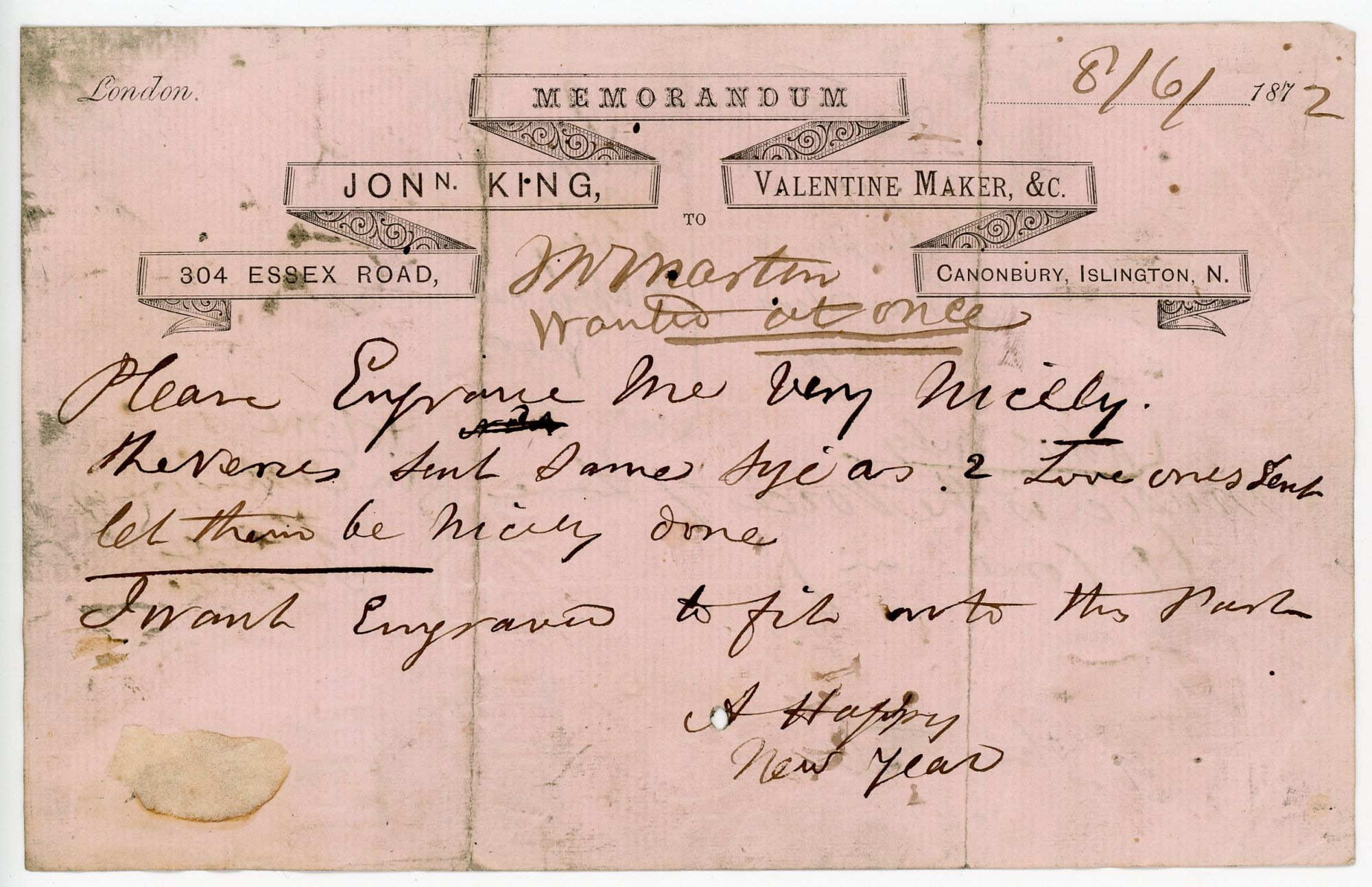 · Two (2) memorandum from King, 1872, requesting an engraving and acknowledging payment in full.