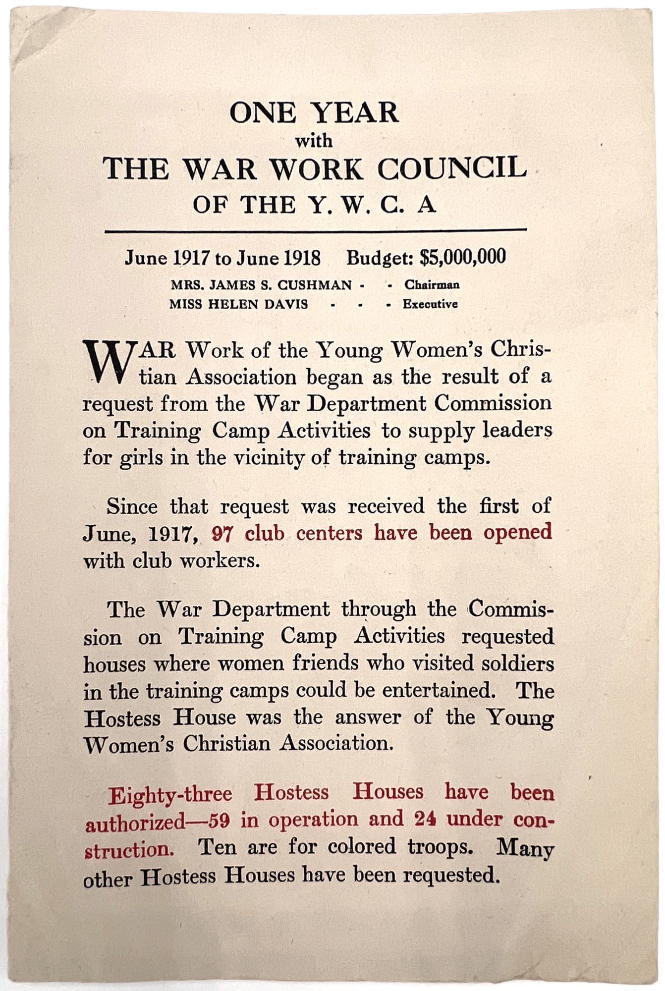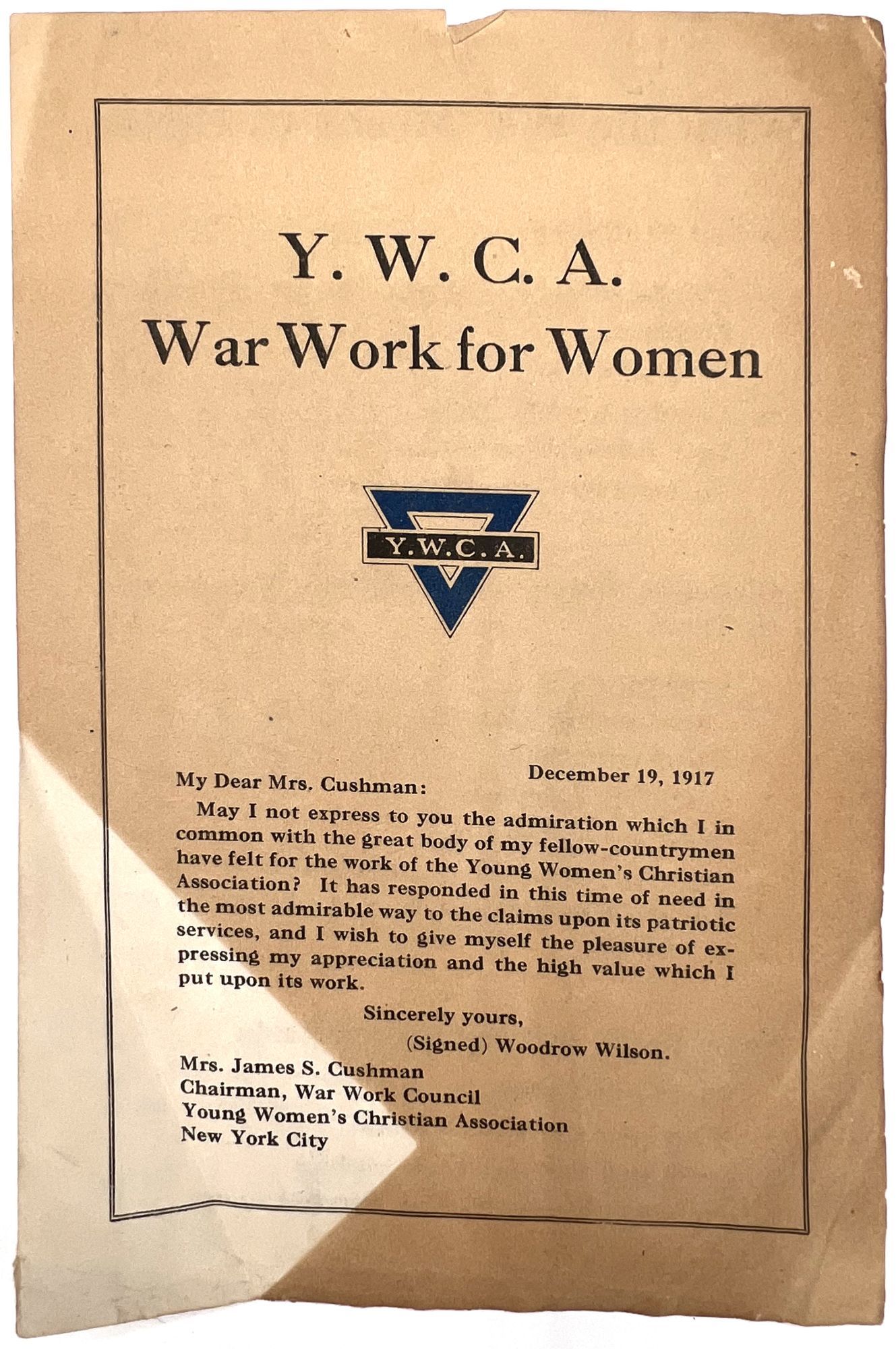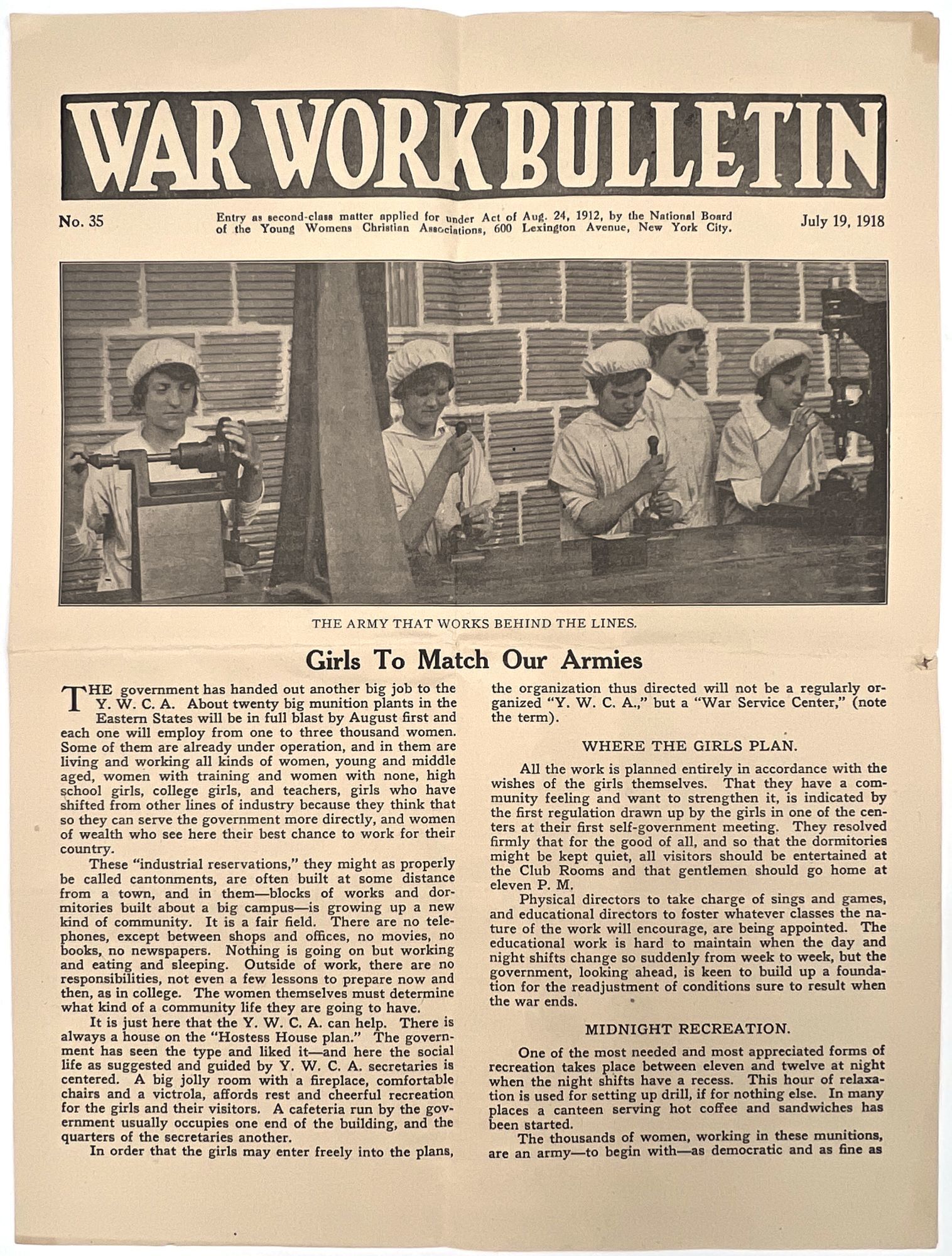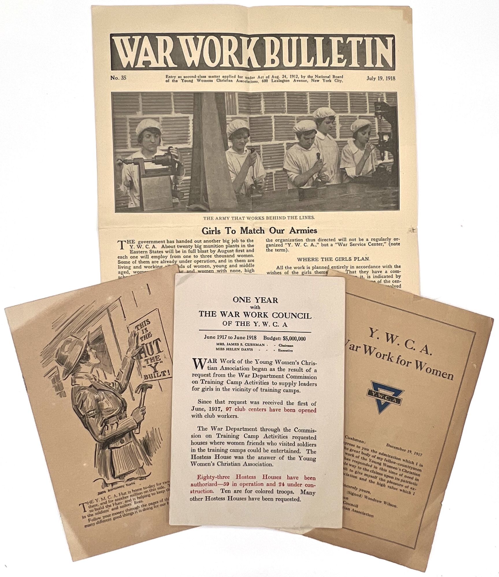 New York, New York: Y.W.C.A. War Work Council, 1918. Very good. Toning and sunning, minor creasing, short tears.. A grouping of four (4) items relating to the War Work Council of the Y.W.C.A in 1918, which was formed to disseminate important news about the Y.W.C.A.'s work at home and abroad to support the war effort-- specifically, the work done by women to help the war effort, and the work done to support girls and women affected by the war. The items include: issue No. 35 of the organization's "War Work Bulletin", offering news and opportunities for aid (e.g. a book drive for girls in the war industry centers); a promotional booklet for the Y.M.C.A. Hut and Y.W.C.A. Hostess Hut; one brief bifolium leaflet reporting the War Work Council's activities from June 1917 to June 1918; and a brief bifolium leaflet outlining the War Work Council's main aims. The Bulletin includes a photo of five young women working in a factory setting to help the war effort. The largest item measures approx. 12" by 9", and the smallest measures 7.5" by 5" "The War Work Council of the YWCA of the U.S.A. is the vehicle through which the YWCA of the U.S.A. organizes, administers and reports on its war work activities at home and abroad. The War Work Council is seen as an extension of the program and mission of the YWCA of the U.S.A. and is accomplished through cooperation with existing divisions of the organization. War relief services include expansion of activities where local associations exist, organizing