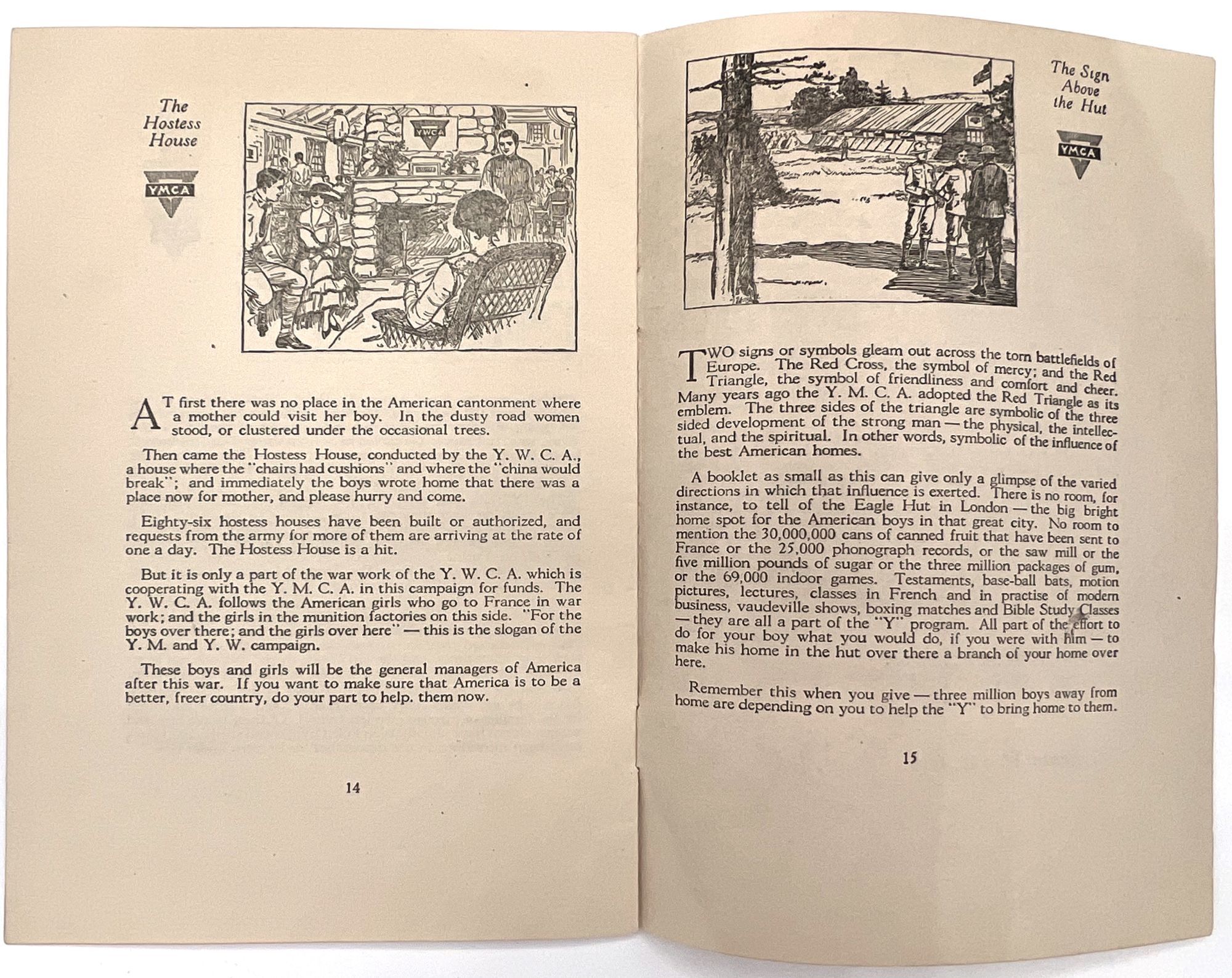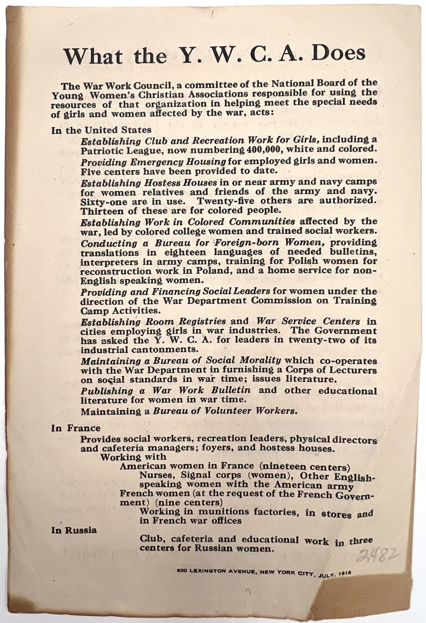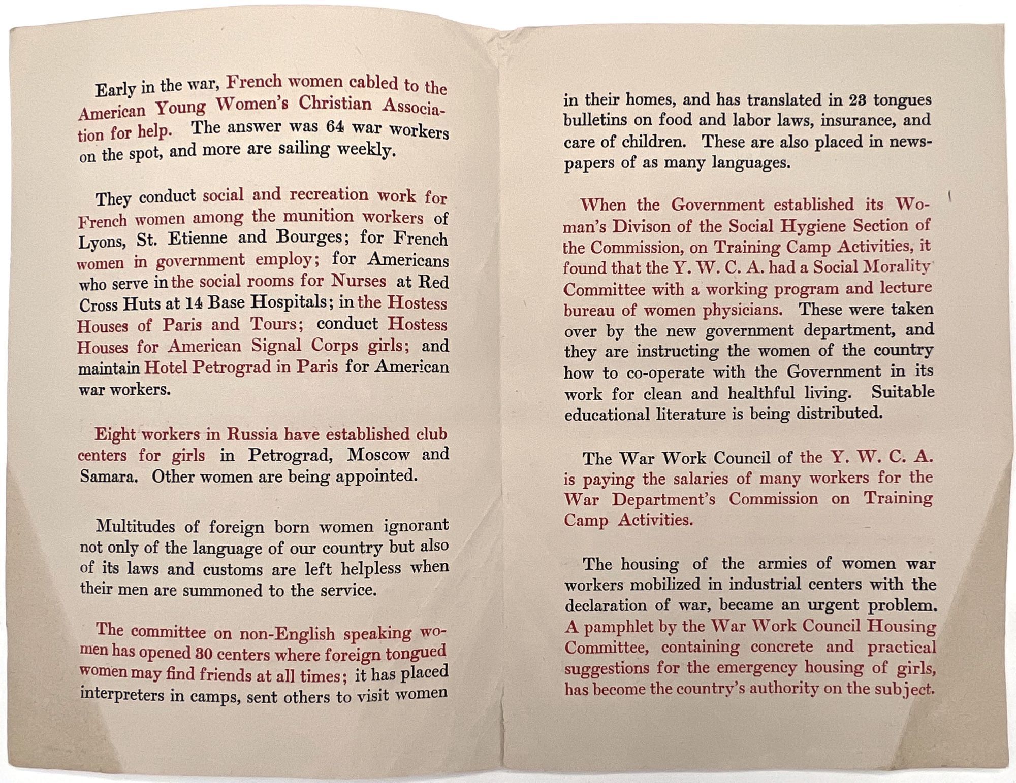 New York, New York: Y.W.C.A. War Work Council, 1918. Very good. Toning and sunning, minor creasing, short tears.. A grouping of four (4) items relating to the War Work Council of the Y.W.C.A in 1918, which was formed to disseminate important news about the Y.W.C.A.'s work at home and abroad to support the war effort-- specifically, the work done by women to help the war effort, and the work done to support girls and women affected by the war. The items include: issue No. 35 of the organization's "War Work Bulletin", offering news and opportunities for aid (e.g. a book drive for girls in the war industry centers); a promotional booklet for the Y.M.C.A. Hut and Y.W.C.A. Hostess Hut; one brief bifolium leaflet reporting the War Work Council's activities from June 1917 to June 1918; and a brief bifolium leaflet outlining the War Work Council's main aims. The Bulletin includes a photo of five young women working in a factory setting to help the war effort. The largest item measures approx. 12" by 9", and the smallest measures 7.5" by 5" "The War Work Council of the YWCA of the U.S.A. is the vehicle through which the YWCA of the U.S.A. organizes, administers and reports on its war work activities at home and abroad. The War Work Council is seen as an extension of the program and mission of the YWCA of the U.S.A. and is accomplished through cooperation with existing divisions of the organization. War relief services include expansion of activities where local associations exist, organizing