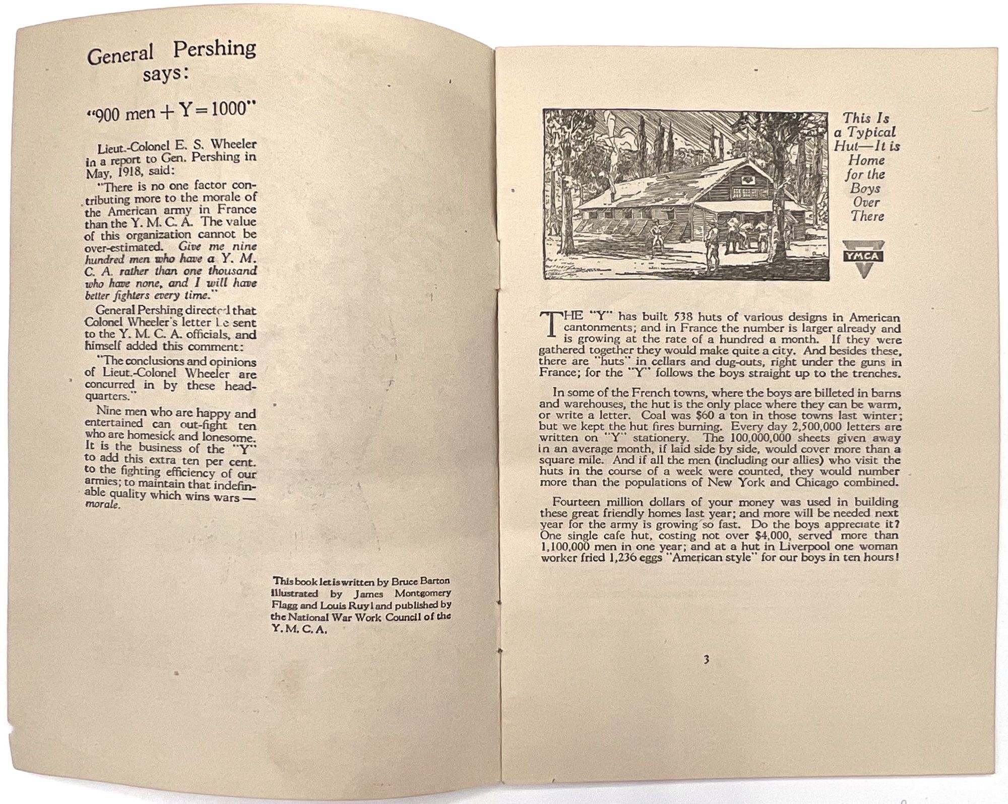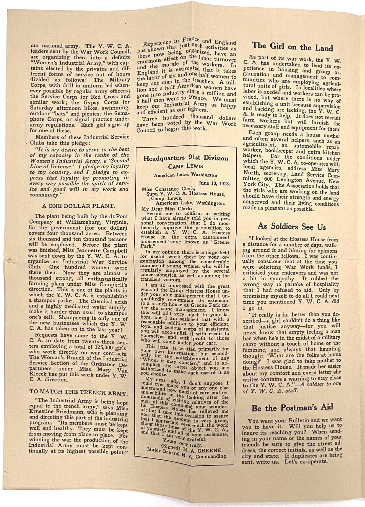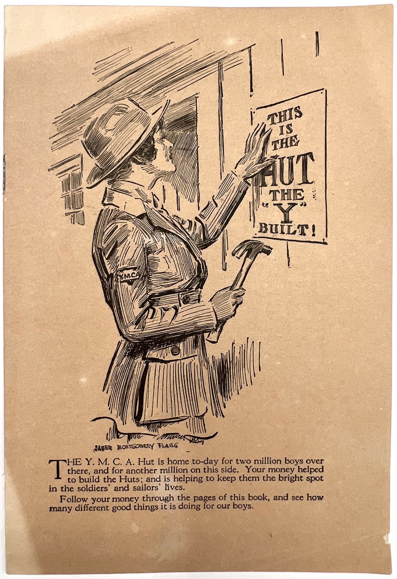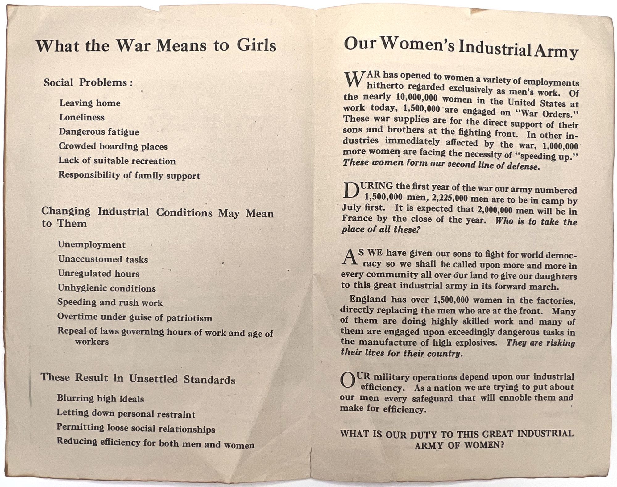 New York, New York: Y.W.C.A. War Work Council, 1918. Very good. Toning and sunning, minor creasing, short tears.. A grouping of four (4) items relating to the War Work Council of the Y.W.C.A in 1918, which was formed to disseminate important news about the Y.W.C.A.'s work at home and abroad to support the war effort-- specifically, the work done by women to help the war effort, and the work done to support girls and women affected by the war. The items include: issue No. 35 of the organization's "War Work Bulletin", offering news and opportunities for aid (e.g. a book drive for girls in the war industry centers); a promotional booklet for the Y.M.C.A. Hut and Y.W.C.A. Hostess Hut; one brief bifolium leaflet reporting the War Work Council's activities from June 1917 to June 1918; and a brief bifolium leaflet outlining the War Work Council's main aims. The Bulletin includes a photo of five young women working in a factory setting to help the war effort. The largest item measures approx. 12" by 9", and the smallest measures 7.5" by 5" "The War Work Council of the YWCA of the U.S.A. is the vehicle through which the YWCA of the U.S.A. organizes, administers and reports on its war work activities at home and abroad. The War Work Council is seen as an extension of the program and mission of the YWCA of the U.S.A. and is accomplished through cooperation with existing divisions of the organization. War relief services include expansion of activities where local associations exist, organizing