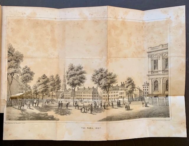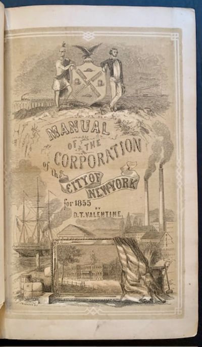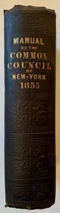 New York: D.T. Valentine (The Common Council of New York), 1855. Decorative Cloth. Very Good +. An impressive copy of the 1855 issue of Valentine's Manual of New York. Solid and VG+ in its chocolate-brown cloth, with decorative blindstamping and bright gilt-design and titling along the panels and spine. Small, neat 1914 inscription from a former owner to his father on the front free endpaper, otherwise very sharp internally, with light offsetting to a small number of the pages. Thick 12mo, 9 fold-out plates (as issued) plus a number of handsome chromolithographed plates.