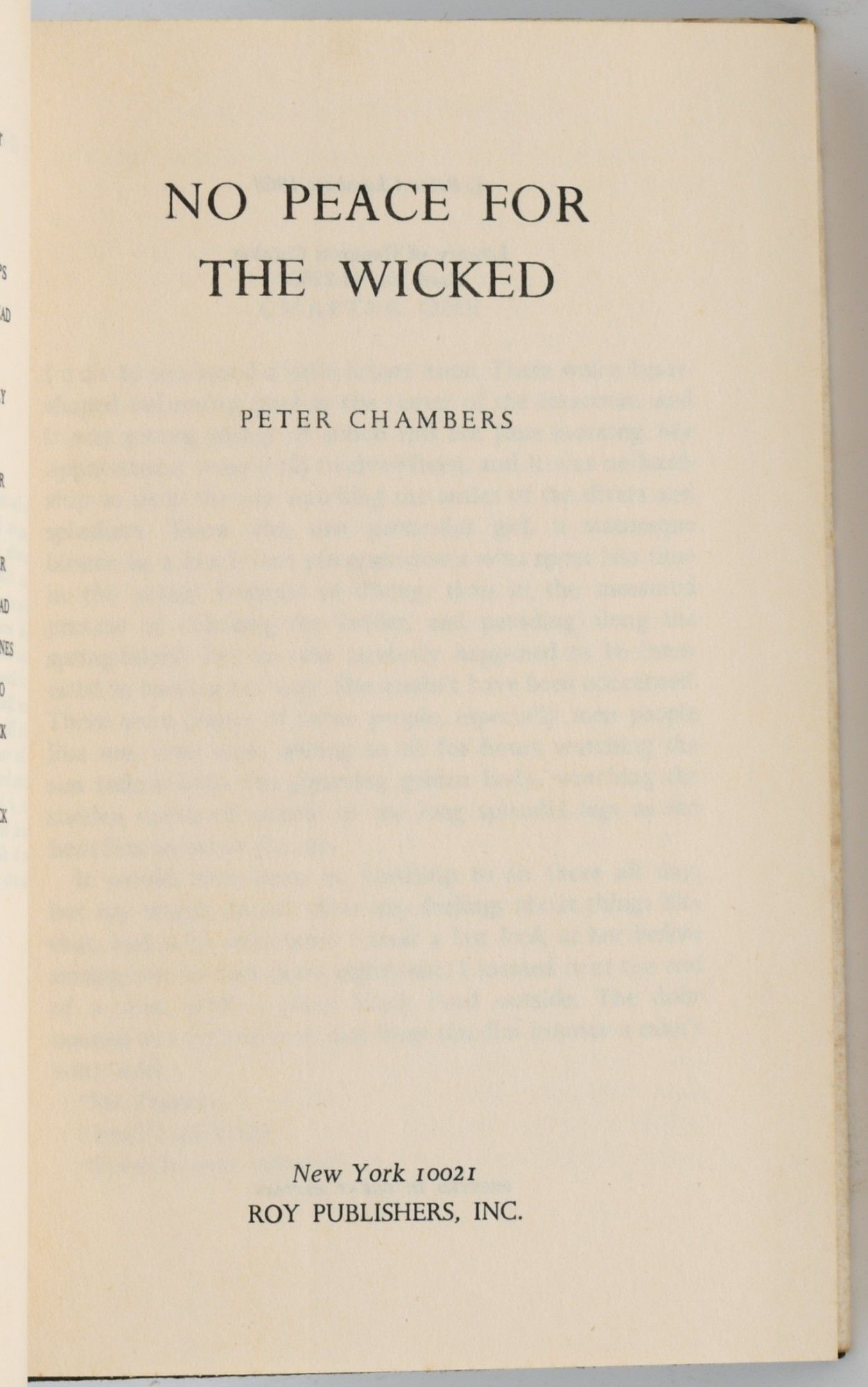 New York: Roy Publishers, Inc, 1968. First American Edition. Hard Cover. Very Good binding/Very Good dust jacket. 8vo.; black cloth binding, with dustjacket; [3], 4-189, pages; there is a small red "R" -- doubtlessly signifying "Remainder" -- stamped on the front endpaper (1/4")' there are no ownership marks of any kind in the book; the dusjtacket has wear to the extremities of the spine. including a 1" closed tear; the jacket has not been price-clipped.~~"Hard to find a concerned family's missing son, Mark Preston tried to avoid big troubles. Nevertheless he got slugged on the head, giving someone opportunity to stick a knife into gambler Marty Glazer. He fell for lovely Lois Carrington's chestnut hair, and had to chasing her missing pendant." And so on and so forth. Very Good binding / Very Good dust jacket.