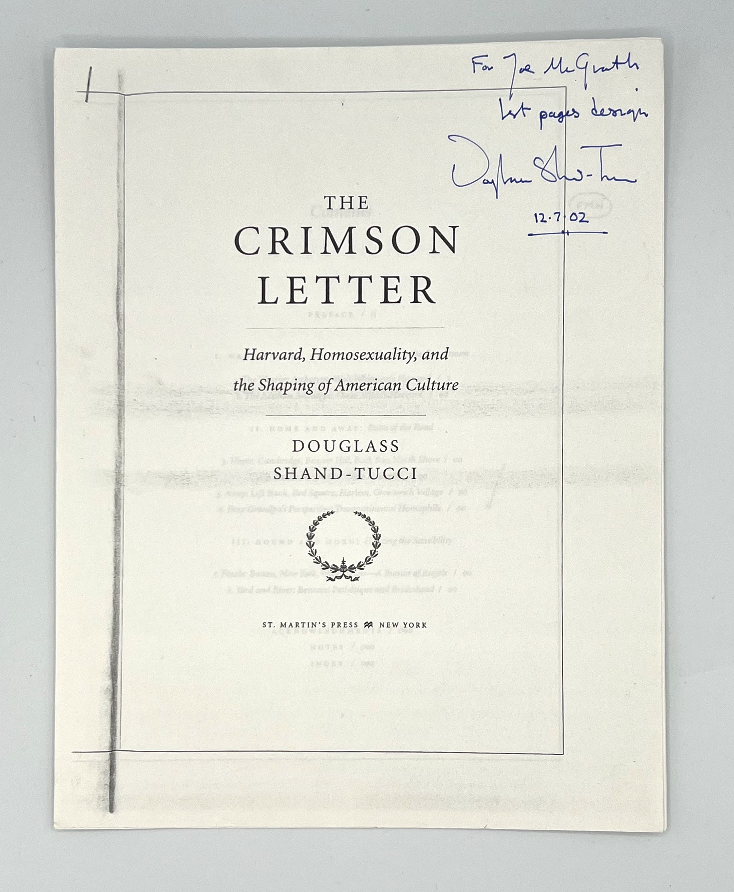 New York: St. Martin's Press, 2003. First Edition. Hardcover. Black boards. Fine, in near fine dust wrapper. 403 pages. 24 x 16.5 cm. Presentation copy - inscribed to Joe McGrath, a friend and longtime secretary to Prescott Townsend, a well known Boston Brahmin, also featured in this book. The author explores the nature and expression of sexual identity at America's oldest university during the years of its greatest influence. The Crimson Letter follows the gay experience at Harvard in the nineteenth and twentieth centuries, focusing upon students, faculty, alumni, and hangers-on who struggled to find their place within the confines of Harvard Yard and in the society outside. Laid in: 16 pages of photo copies with the author's annotations, a photo copy of the first page designs inscribed to Joe McGrath, copy of the cover art, and a photo copied review of the book from the Boston Globe. Presentation on the front free end paper: "For Joe McGrath, My old friend from Tindal Place! With the best wishes of the author and many thanks for your help in remembering - Douglas Shand-Tucci, 03 - 05 - 03."
