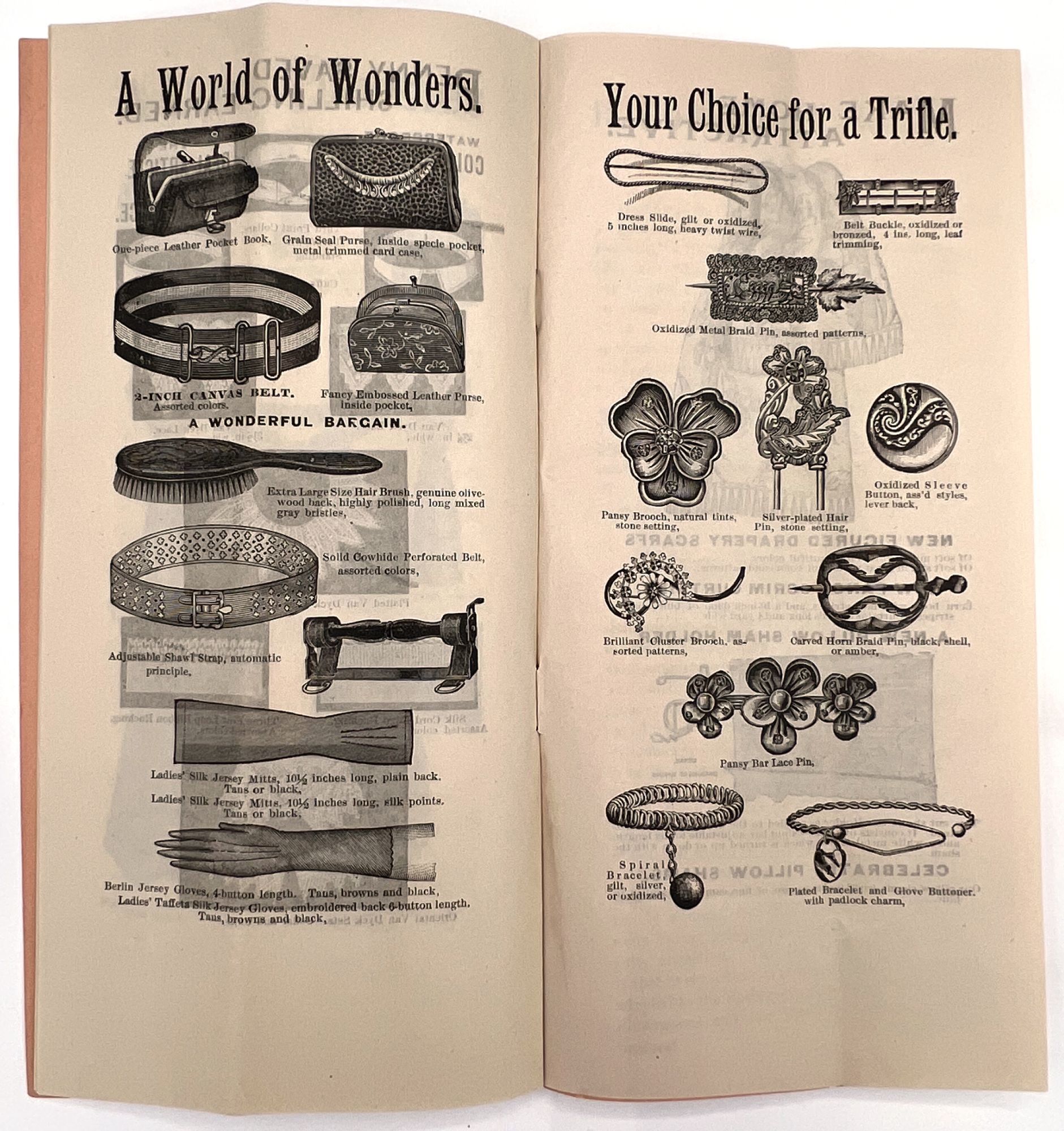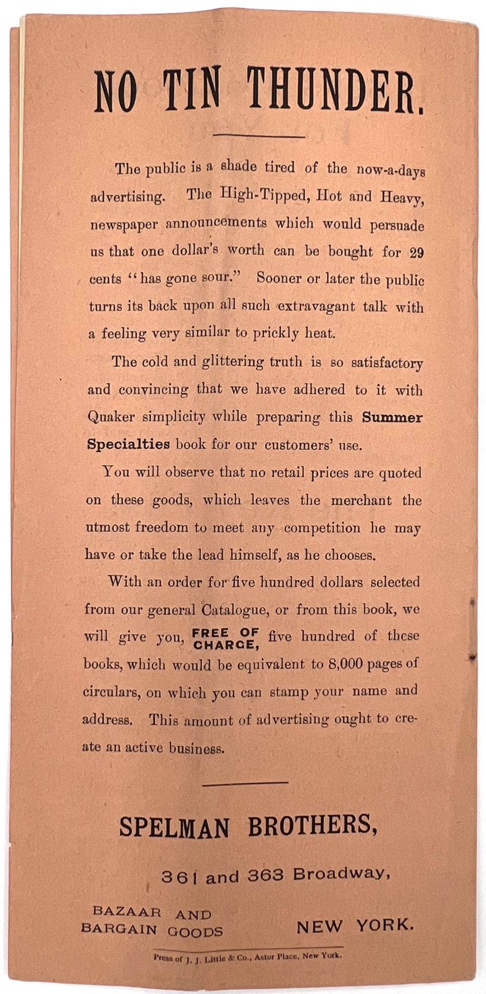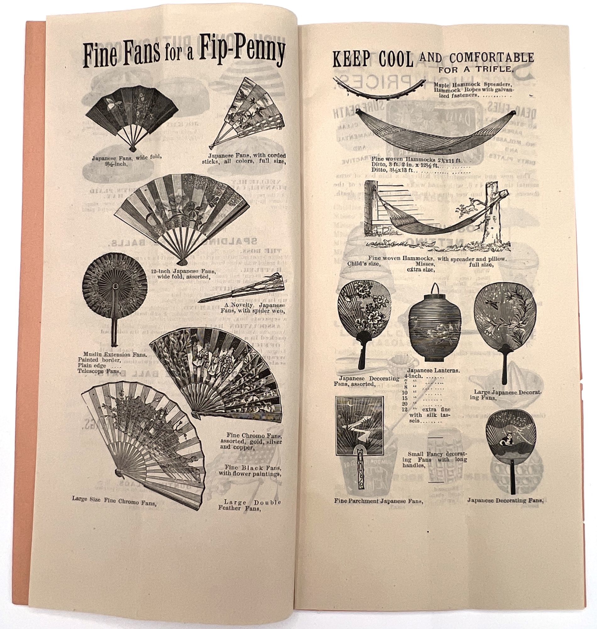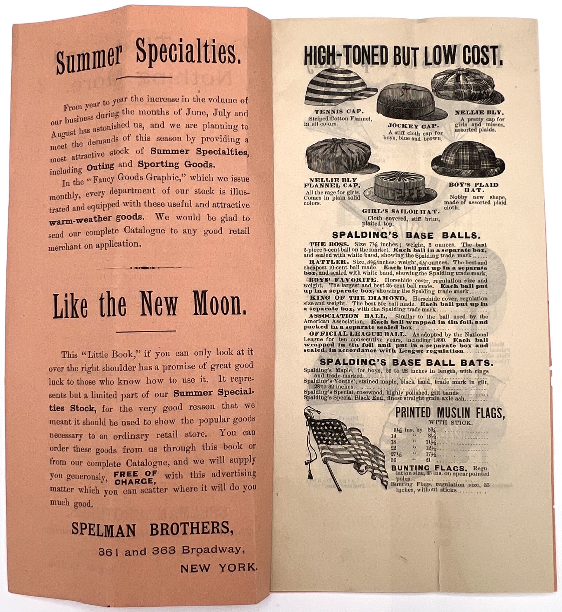 New York, New York: Spelman Brothers, 1905. Very good. Vertical crease, minor dust soiling.. Illustrated trade catalogue for Spelman Brothers, a New York-based shop of eclectic "Bazaar and Bargain Goods". Offers deals on items ranging from clothing, flags, and base balls to fans, handkerchiefs, lace collars, and brooches. Spelman Brothers was most active between the 1880s and the early 1900s. A window into bargain hunting and popular aesthetic trends c.1905. Single vol. (9" by 4.5"), pp. [16], illus., stapled in original printed peach-colored wrps.