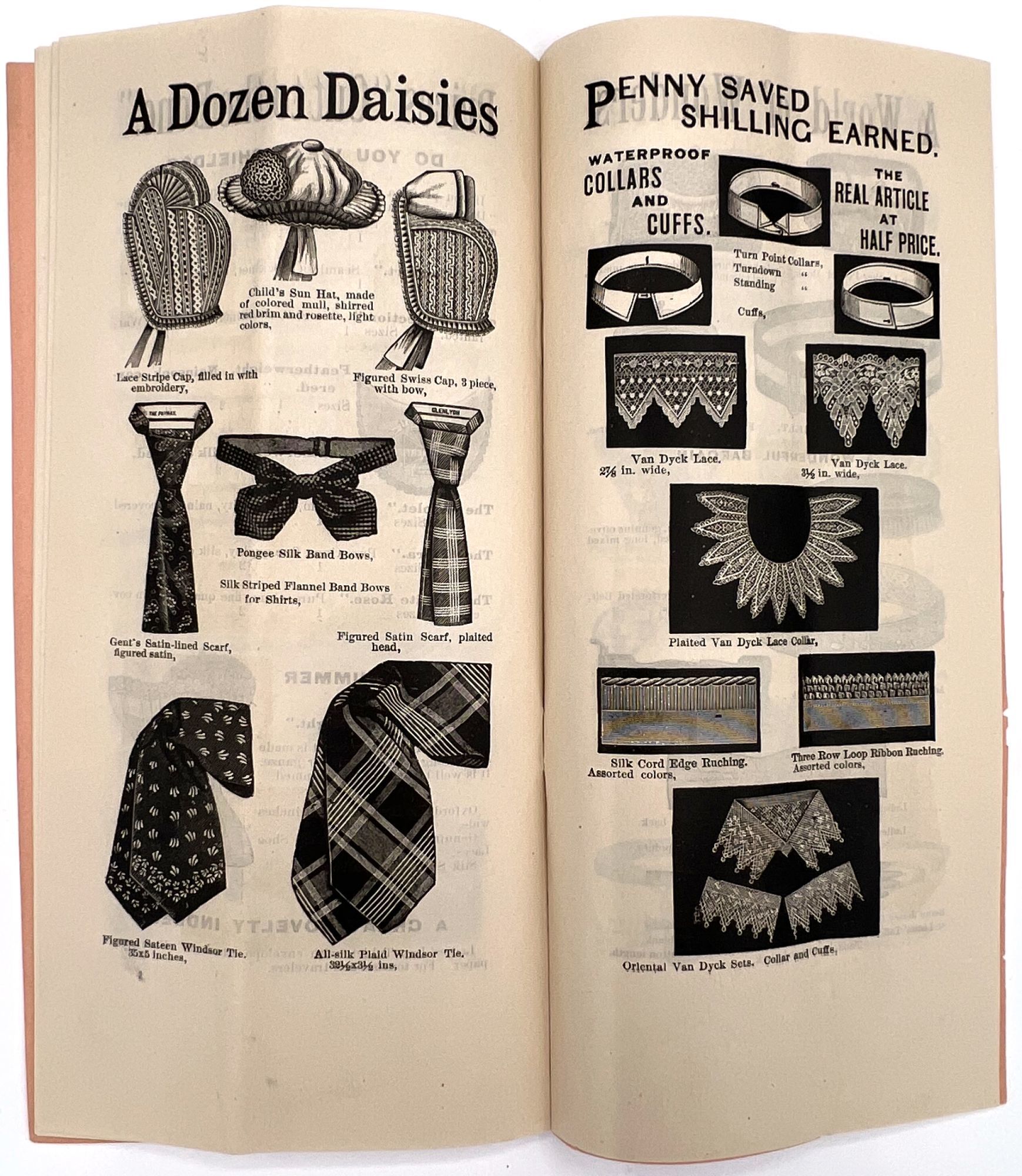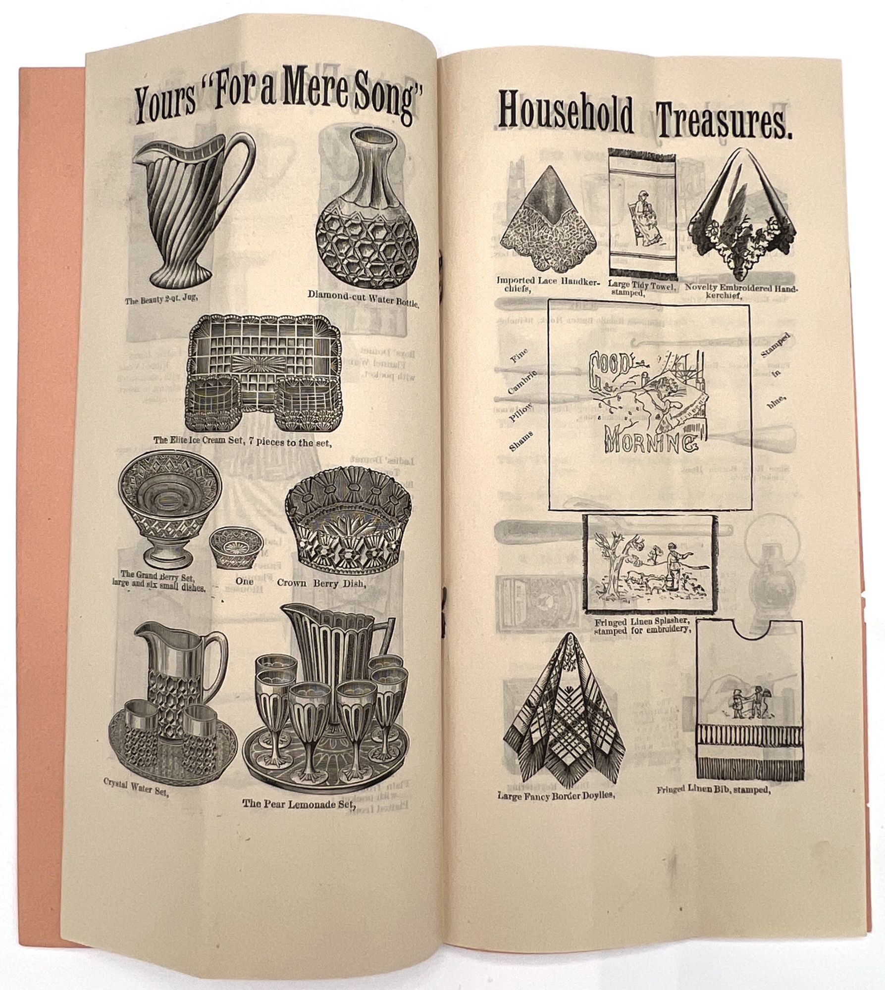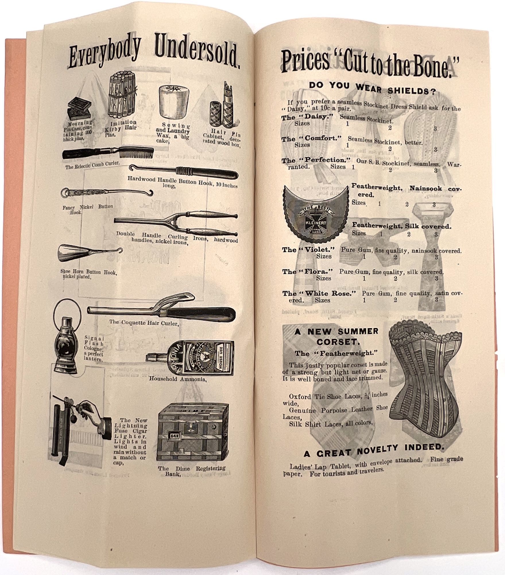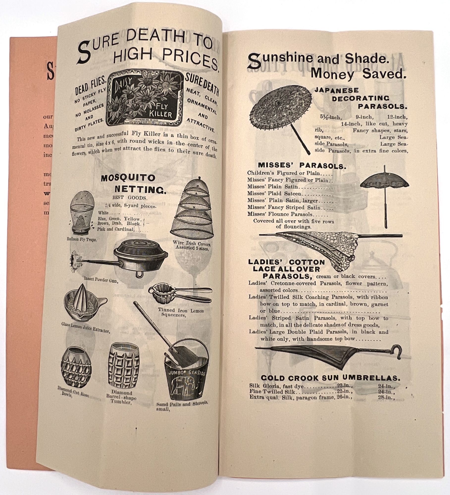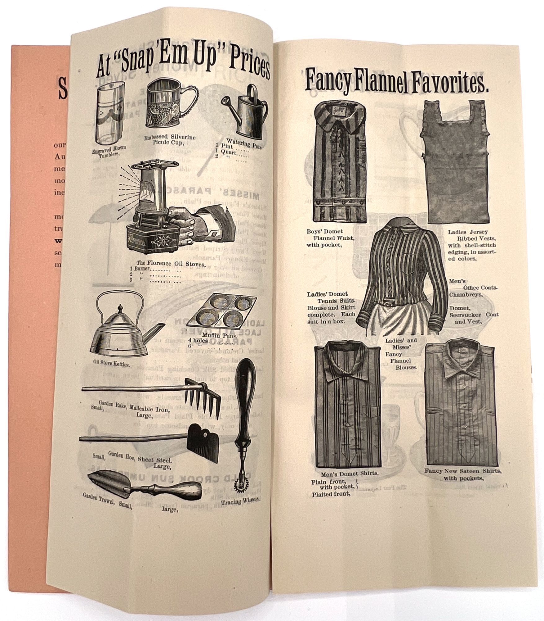 New York, New York: Spelman Brothers, 1905. Very good. Vertical crease, minor dust soiling.. Illustrated trade catalogue for Spelman Brothers, a New York-based shop of eclectic "Bazaar and Bargain Goods". Offers deals on items ranging from clothing, flags, and base balls to fans, handkerchiefs, lace collars, and brooches. Spelman Brothers was most active between the 1880s and the early 1900s. A window into bargain hunting and popular aesthetic trends c.1905. Single vol. (9" by 4.5"), pp. [16], illus., stapled in original printed peach-colored wrps.