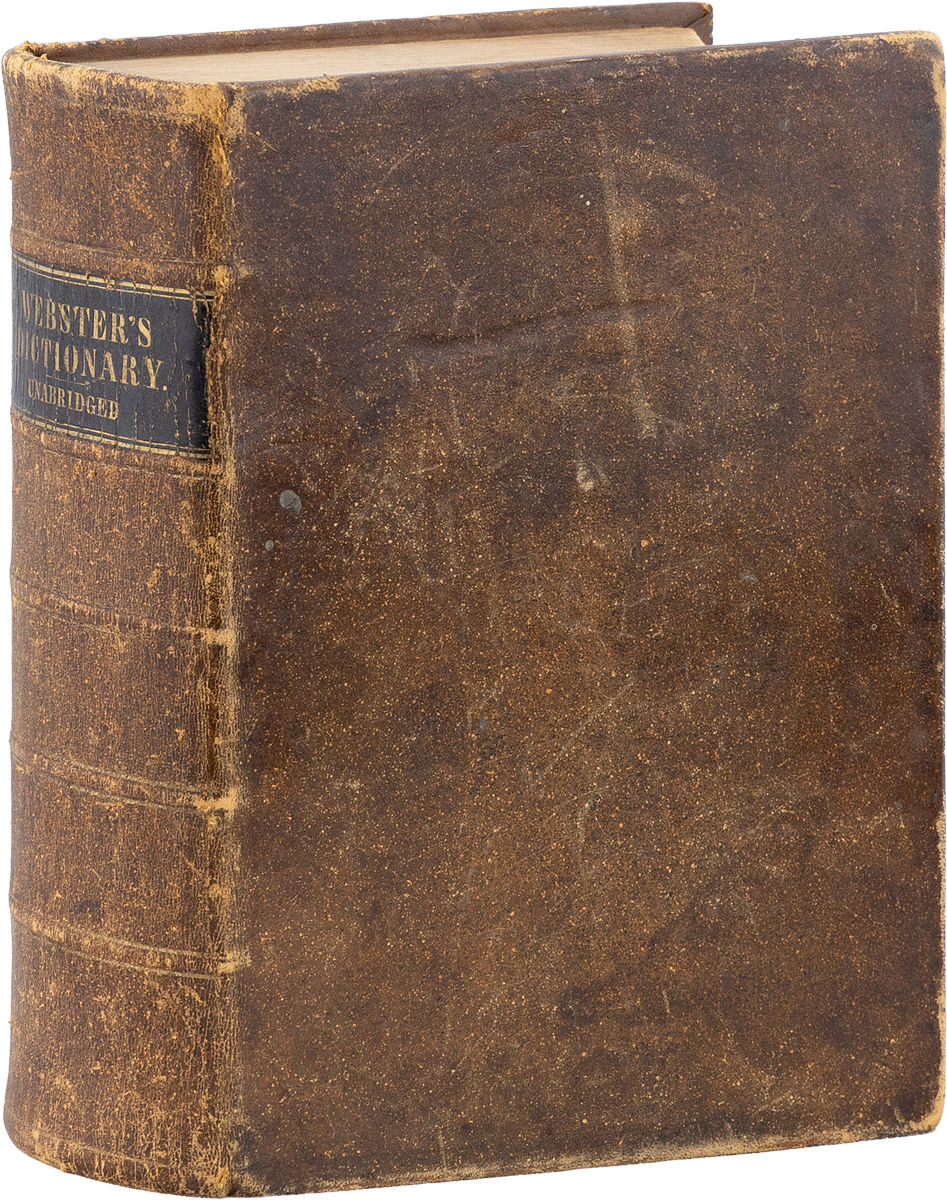 Springfield: George and Charles Merriam, 1854. Thick, heavy quarto. Original full sheep with morocco spine labels; pink printed endpapers; lxxxiv,1366,(1)pp; engraved frontispiece portrait. Text in triple column. The endpapers are printed with testimonials and adverts for Webster's works. Slight overall rubbing, but no structural damage, to the binding; occasional foxing within; old damp-stain with mild rippling to final three leaves; early, decorative hand-colored illustration laid down to verso of front endpaper; in all, a sound and attractive copy in the original binding, Very Good. Later bookplate of James G. Mead to front flyleaf.