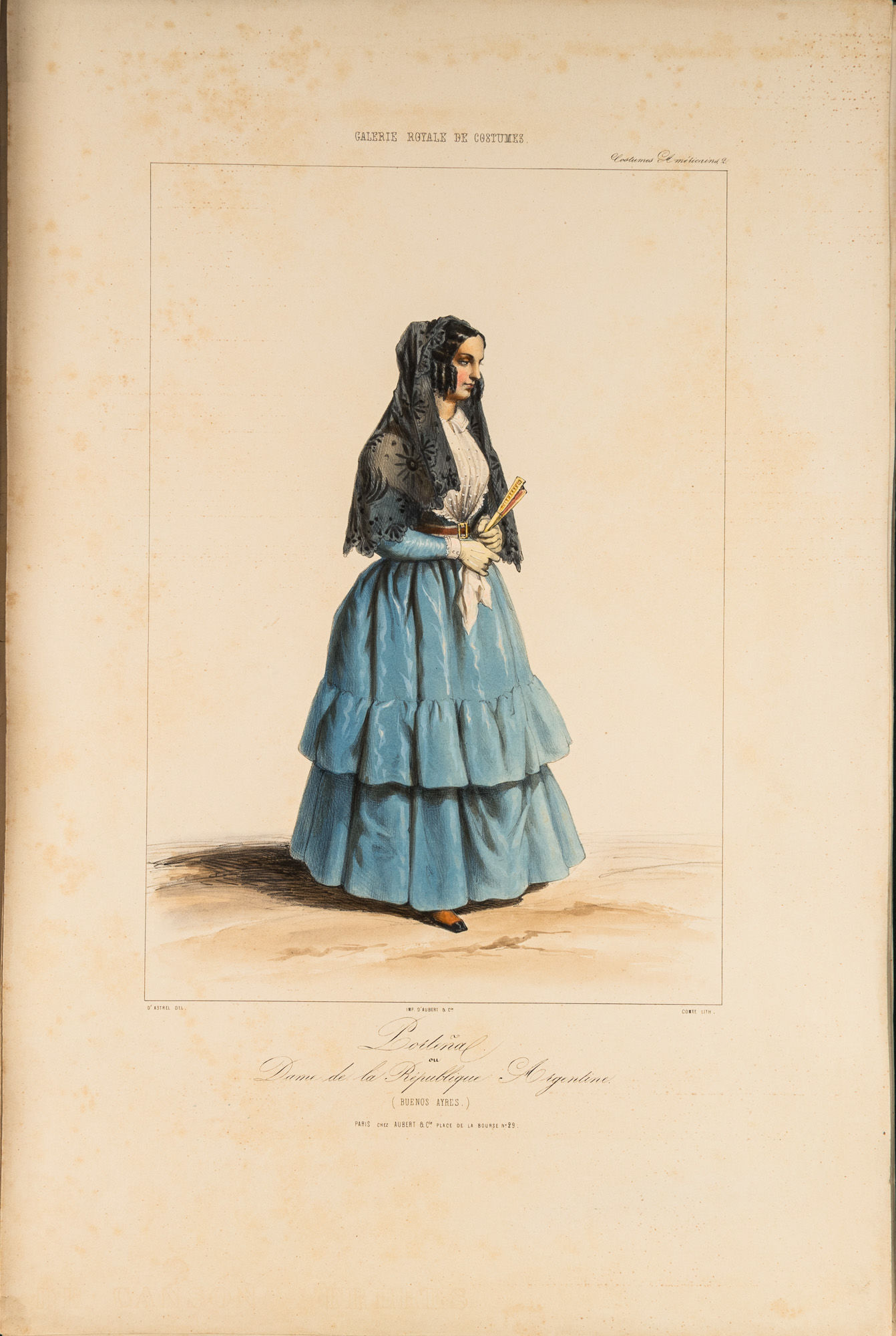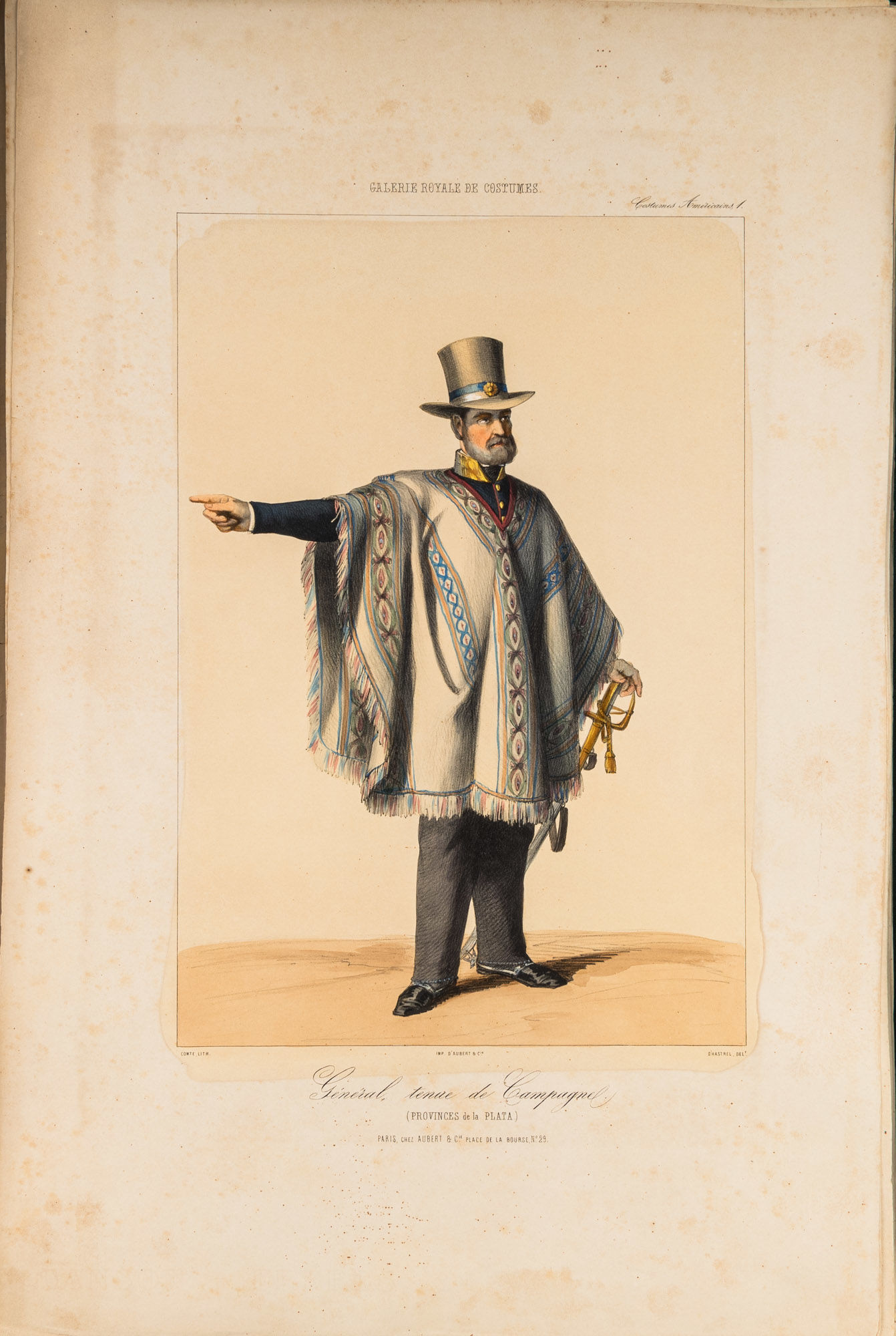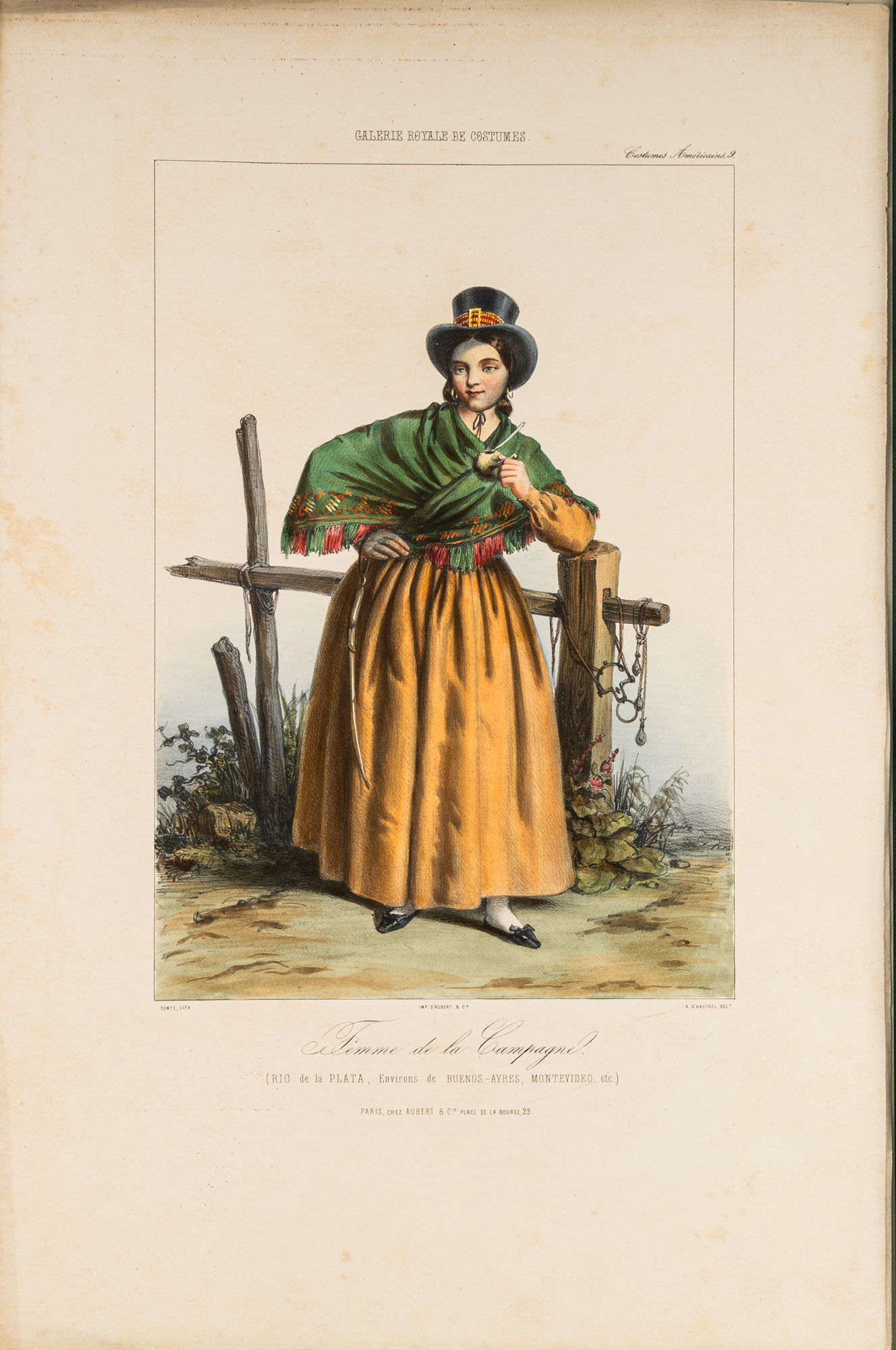 1848. Paris: Chez Aubert, c.1842-1848. 10 lithographed. Paris: Chez Aubert, c.1842-1848. 10 lithographed. [Costume. Americas]. Caption title: "Costumes Americains." From: Galerie Royale de Costumes. Paris: Chez Aubert, c.1842-1848. 10 lithographed plates with hand-coloring. One part only (of 14), folio (549 x 360 mm). 10 lithographed plates with hand-coloring by Comte after drawings b A. d'Hastrel. (5 sheets with toning to over plate and in margin showing through on verso, some mostly marginal spotting, a few tiny chips to extremities.) Loose as issued in original wrappers (some soft creasing and very slight chipping); cloth folding case. $2,500. * The complete series of the Americas plates from the Galerie Royale de Costumes, which in total comprised 14 parts each devoted to a different region, most depicting various places in Europe and the Middle East. The American plates depict mid-19th century costumes from around the Rio de la Plata, including Buenos Aires and Montevideo.