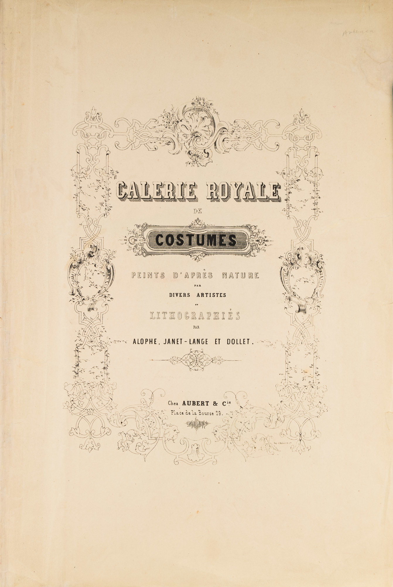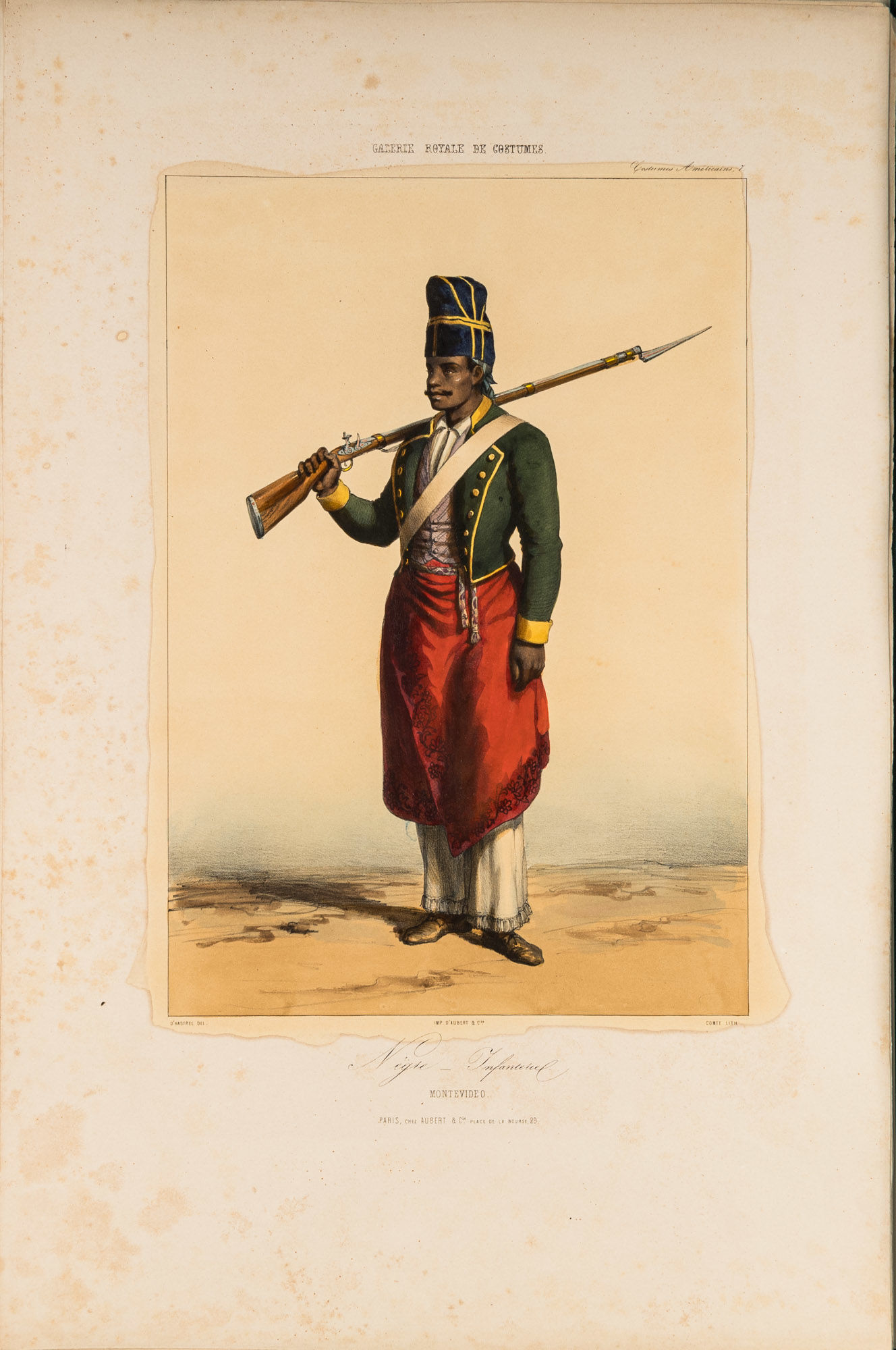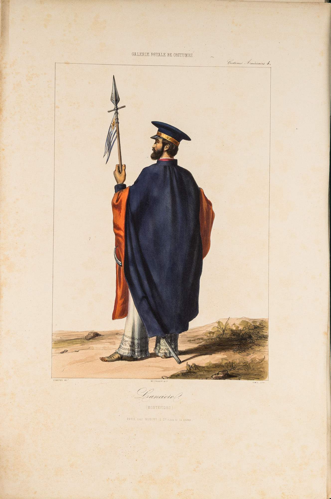 1848. Paris: Chez Aubert, c.1842-1848. 10 lithographed. Paris: Chez Aubert, c.1842-1848. 10 lithographed. [Costume. Americas]. Caption title: "Costumes Americains." From: Galerie Royale de Costumes. Paris: Chez Aubert, c.1842-1848. 10 lithographed plates with hand-coloring. One part only (of 14), folio (549 x 360 mm). 10 lithographed plates with hand-coloring by Comte after drawings b A. d'Hastrel. (5 sheets with toning to over plate and in margin showing through on verso, some mostly marginal spotting, a few tiny chips to extremities.) Loose as issued in original wrappers (some soft creasing and very slight chipping); cloth folding case. $2,500. * The complete series of the Americas plates from the Galerie Royale de Costumes, which in total comprised 14 parts each devoted to a different region, most depicting various places in Europe and the Middle East. The American plates depict mid-19th century costumes from around the Rio de la Plata, including Buenos Aires and Montevideo.