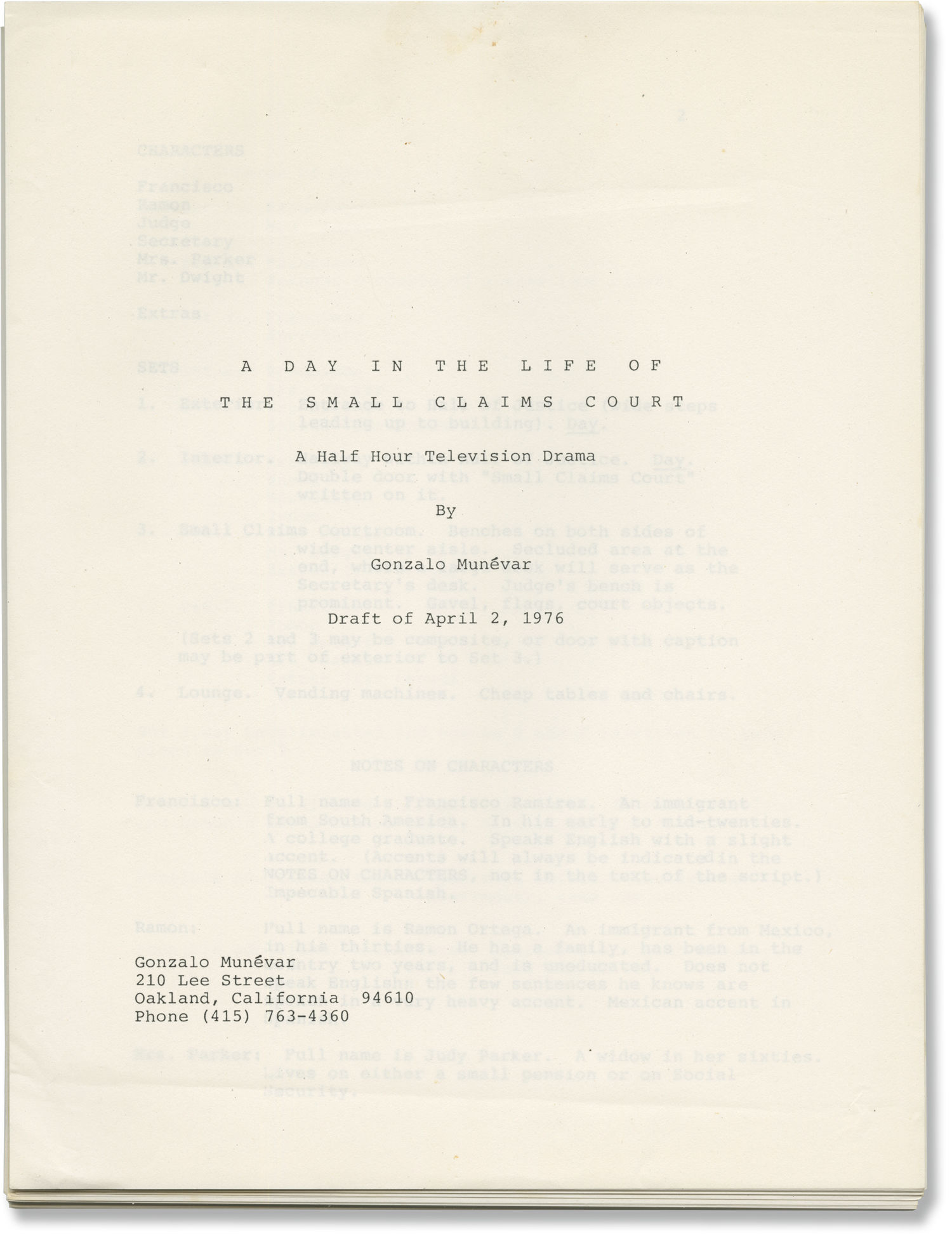 Lacking wrappers. Title page present, dated April 2, 1976, with credits for screenwriter Gonzalo Munevar. 49 leaves, with last page of text numbered 49. Xerographic duplication, rectos only. Pages Near Fine, unbound.
