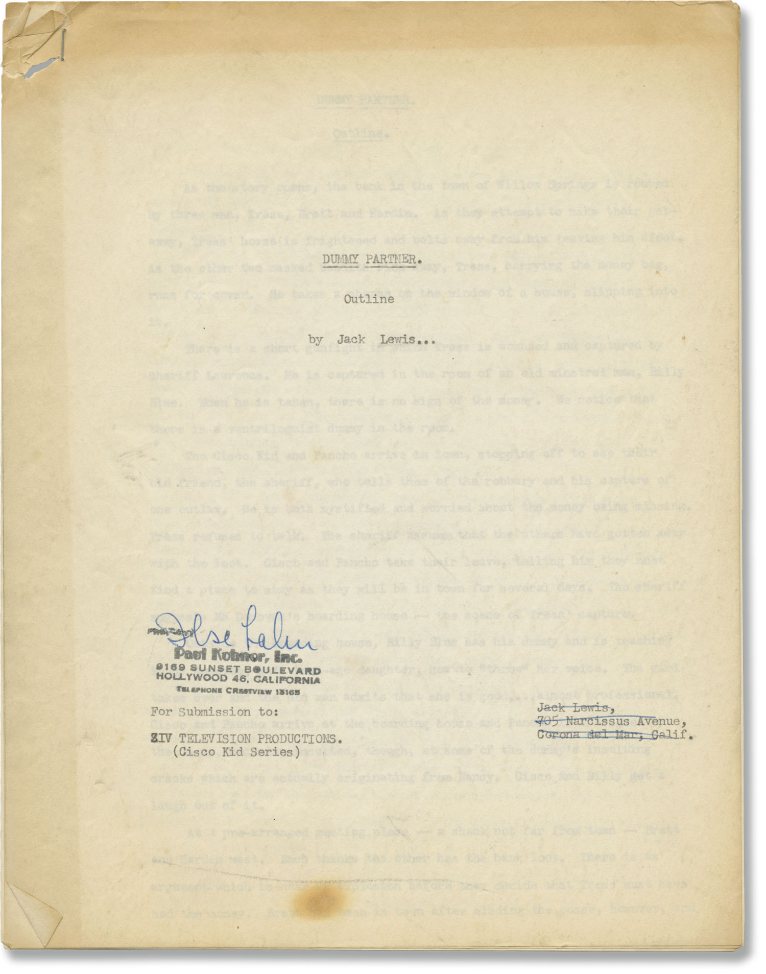 Lacking wrappers. Title page present, with credit for screenwriter Jack Lewis. Six leaves, with last page of text numbered five. Mimeograph duplication, rectos only. Pages Very Good plus, bound with a staple.