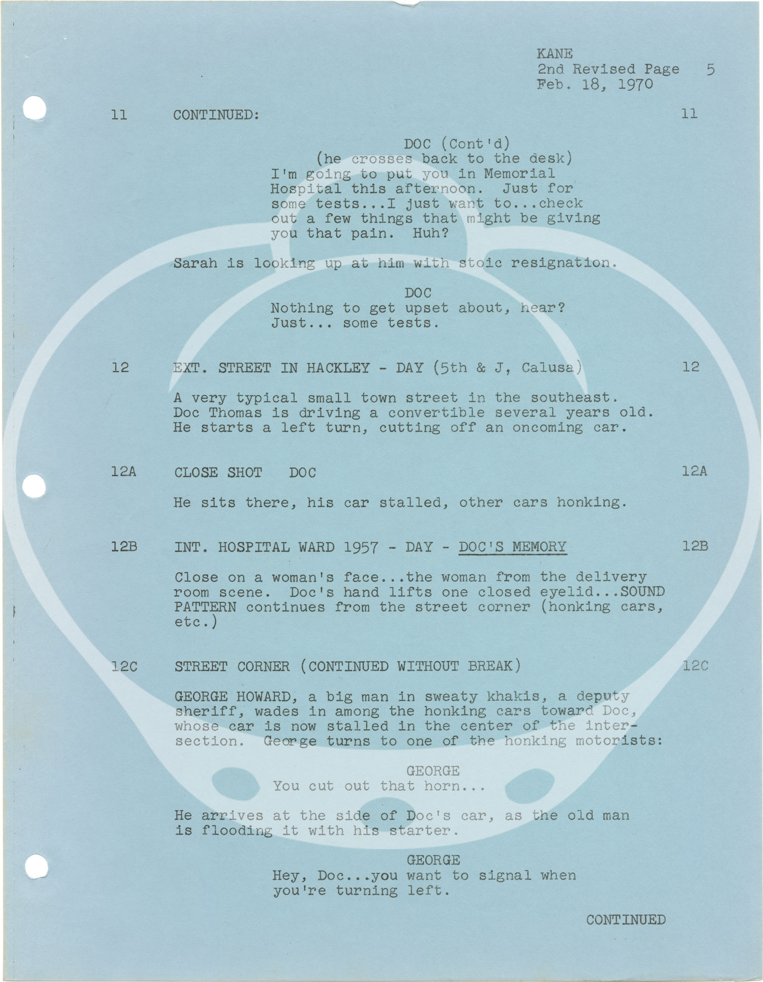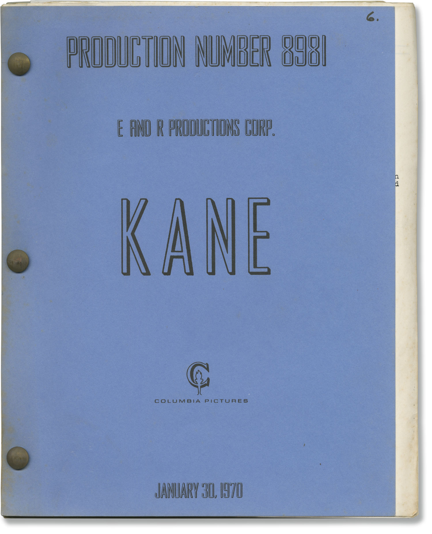 Blue titled wrappers, dated January 30, 1970, noted as production No. 8981. Title page present, dated January 30, 1970, with credits for director James Goldstone and screenwriter Ernest Kinoy. 141 leaves, with last page of text numbered 140. Mimeograph duplication on eye-rest green stock, rectos only, with rainbow revision pages throughout, dated variously between February 11, 1970 and March 4, 1970. Pages and wrapper Near Fine, bound with two gold brads.