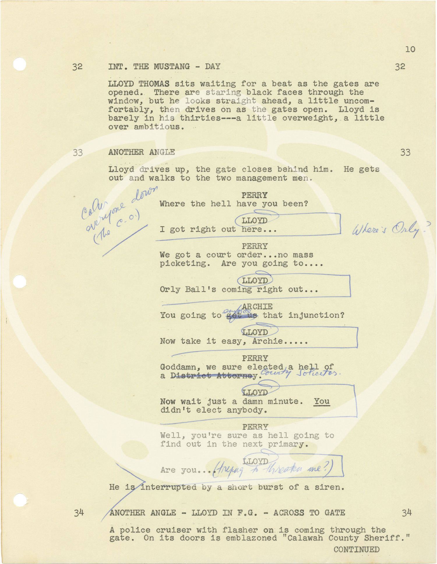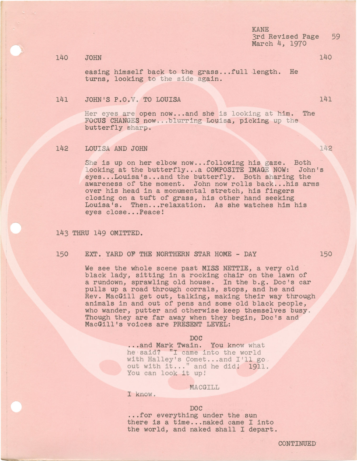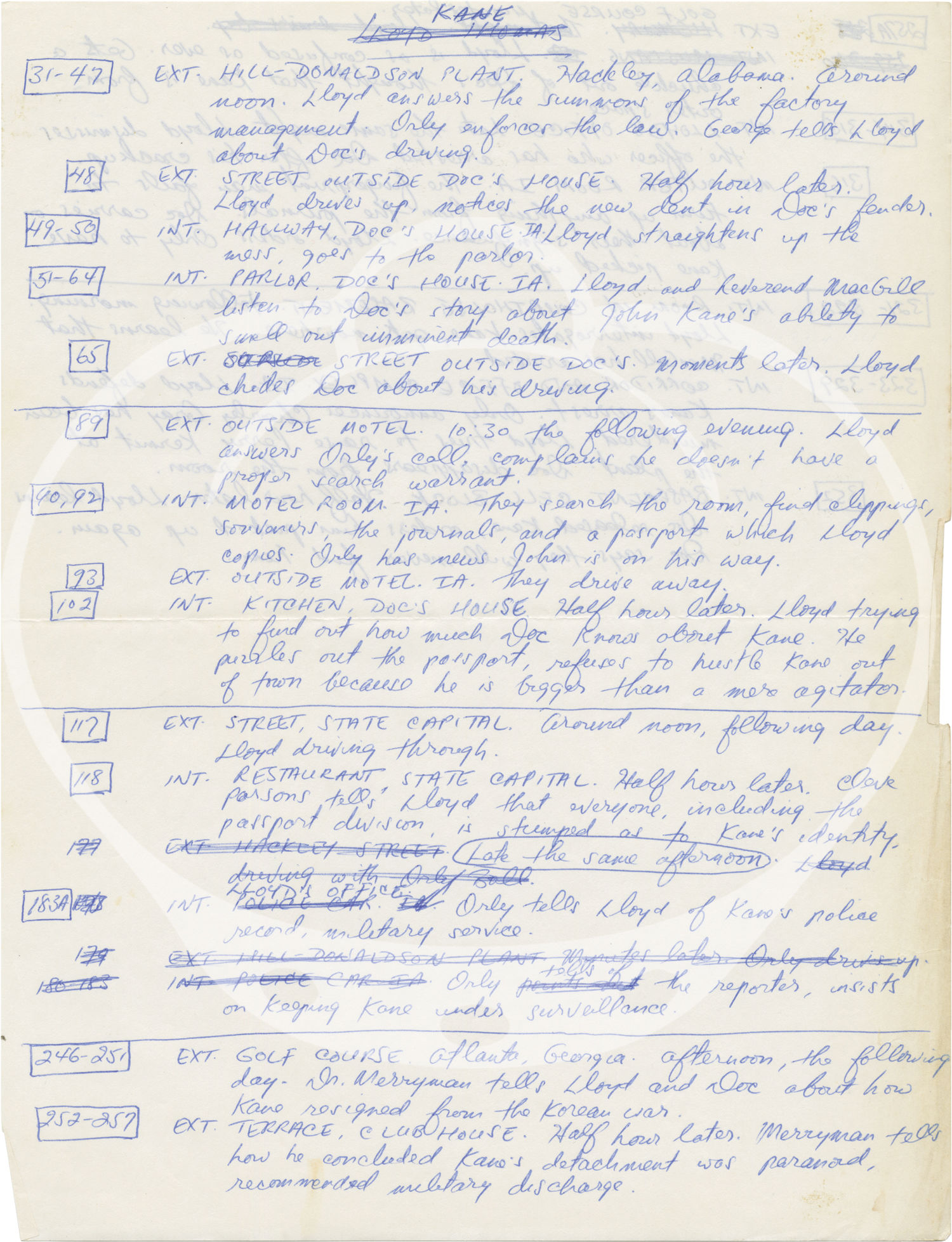 Culver City, CA: Columbia Pictures, 1970. Draft script for the 1971 film, here under the working title "Kane." Copy belonging to actor Bradford Dillman, with his stamp to the title page, and his manuscript ink annotations throughout. Laid in with the script are two manuscript pages with Dillman's notes on blocking for various scenes, and two gatherings of cast and crew contact information.