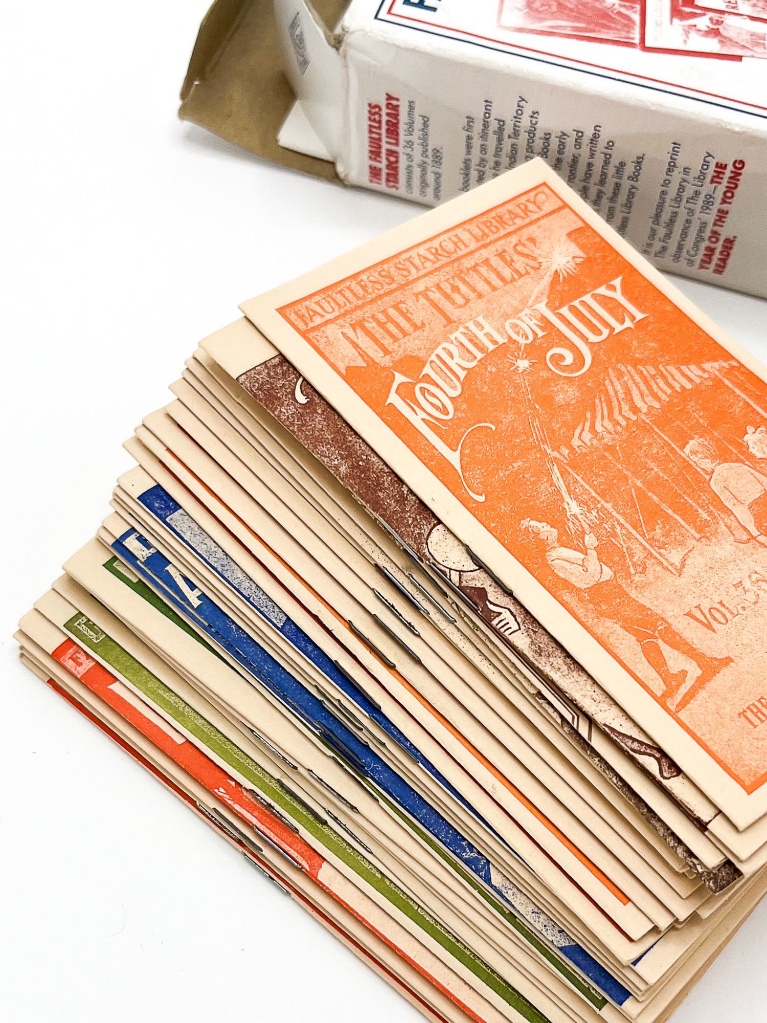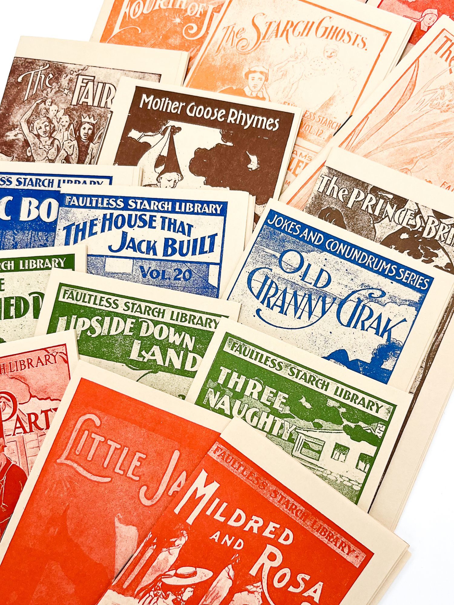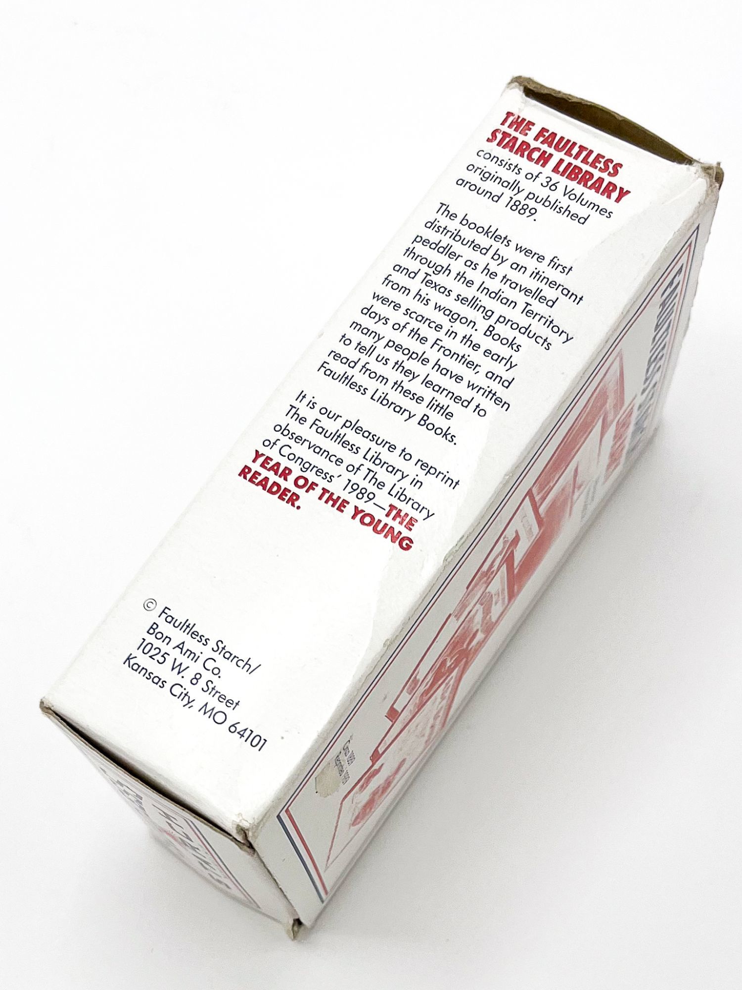 Kansas City, MO: The Faultless Starch Co, 1989. Fine in near fine box.. Modern facsimile edition of this collection of the 36 little promotional titles published by the Kansas City-based Faultless Starch Company, first published in 1889, an example of popular literacy tools in early Oklahoma and Texas. From classics such as "The Owl and the Pussycat" to original titles like "The Starch Ghosts," the 36-volume FAULTLESS STARCH LIBRARY had something for every young reader. In under-served regions like rural Texas and Oklahoma, these little books – which often incorporated plot points about the importance of using Faultless Starch – were not just delightful freebies for the young, but important literacy tools: "People have written us over the years saying they learned to read" with these books, notes Faultless on their order form for this facsimile edition. This collection was published to commemorate the 1989 Year of the Young Reader and the Oklahoma Land Run Centennial. A delightful recreation of the books that were so important to so many American children. 36 volumes. 5'' x 3''. Original pictorial wrappers, saddle-stapled. Illustrated and printed in single colors: brown, red, orange, blue, green, and pink. Each with 16 pages. With original order form for the facsimiles laid in. In original blue and red cardboard box, in the style of a Faultless Starch box. Box with a bit of bumping to corners. Booklets tight and clean.