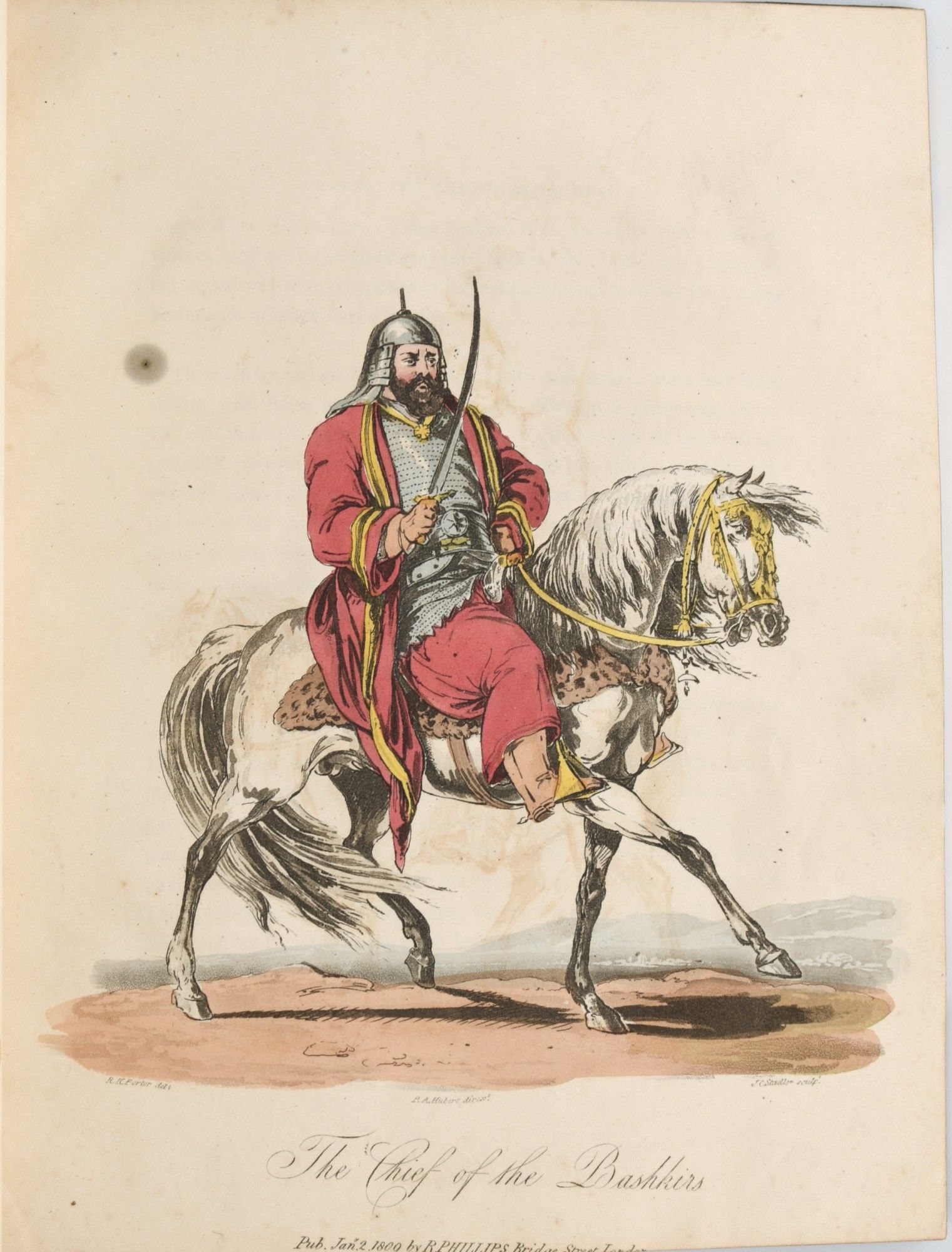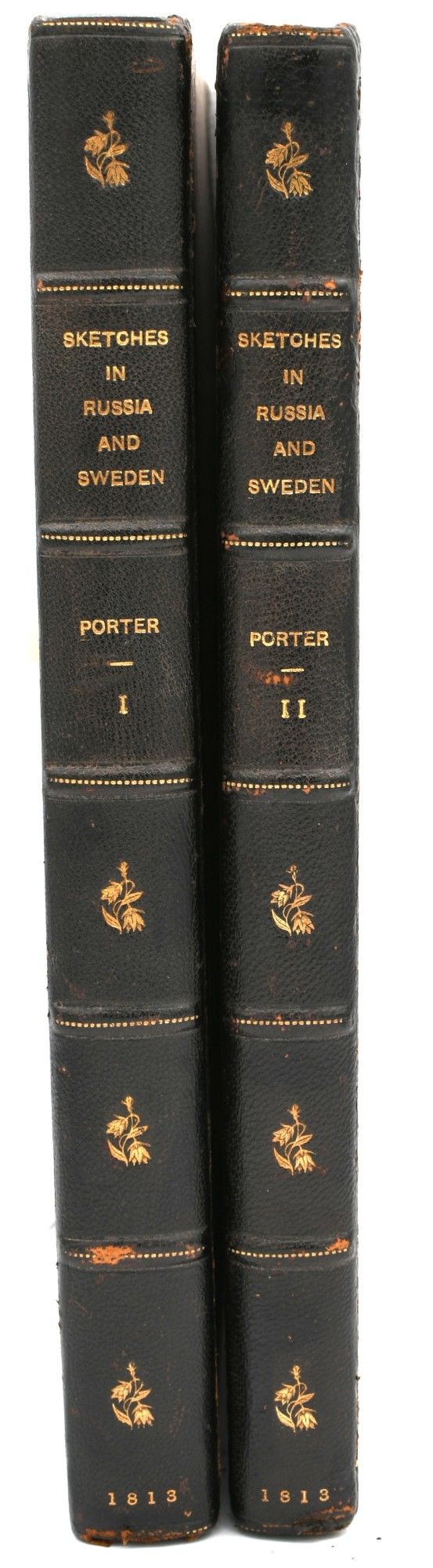 London: John Stockdale, 1813. Second Edition. Half Leather. Very Good binding. Two quarto bindings; in later blue morrocco over grey|blue cloth, with raised bands with decorations and lettering in gilt; Volumes One with title page, Volume Two with title page and half-title; the volumes have 40 plates (2 folding colored plates, 1 folding sepia plate; 26 full page colored plates; 11 full page sepia plates, and I plain (uncolored) engraving; [NOTE: This copy appears to be lacking a single color plate of a Russian Nurse].~~There is next to no foxing, though 2 or 3 plates have several quite small spots.~~The author and artist, Sir Robert Ker Porter; was appointed historical painted to Tsar Alexander I. Very Good binding.