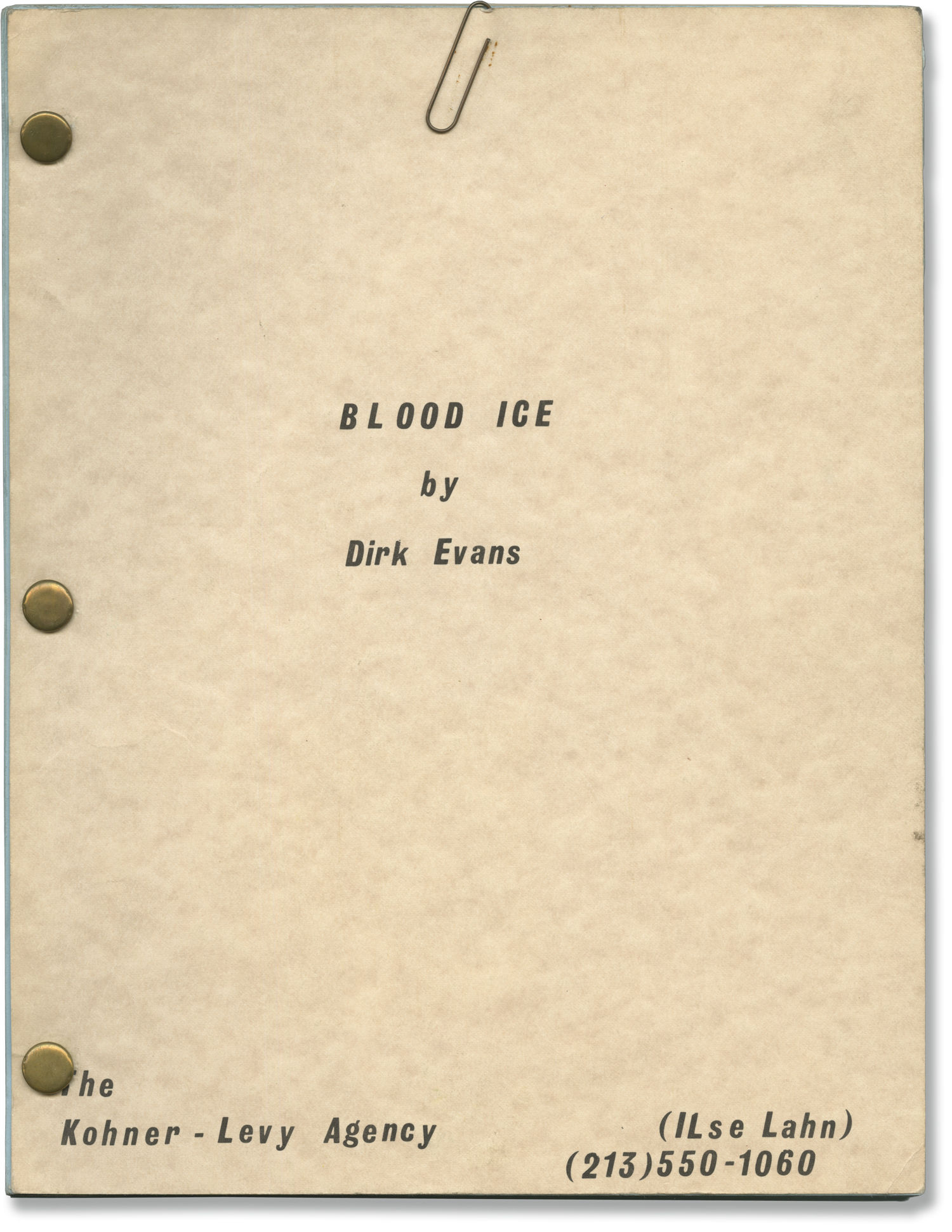 Off-white titled wrappers, with credit for screenwriter Dirk Evans. Title page present, with credit for screenwriter Dirk Evans. 142 leaves, with last page of text numbered 141. Xerographically duplicated, rectos only. Pages Near Fine, wrapper Near Fine, bound with three gold brads.