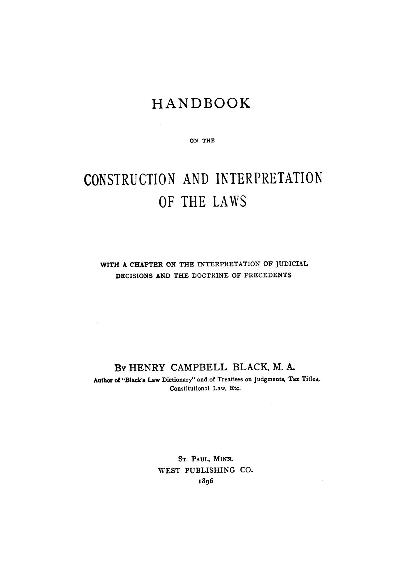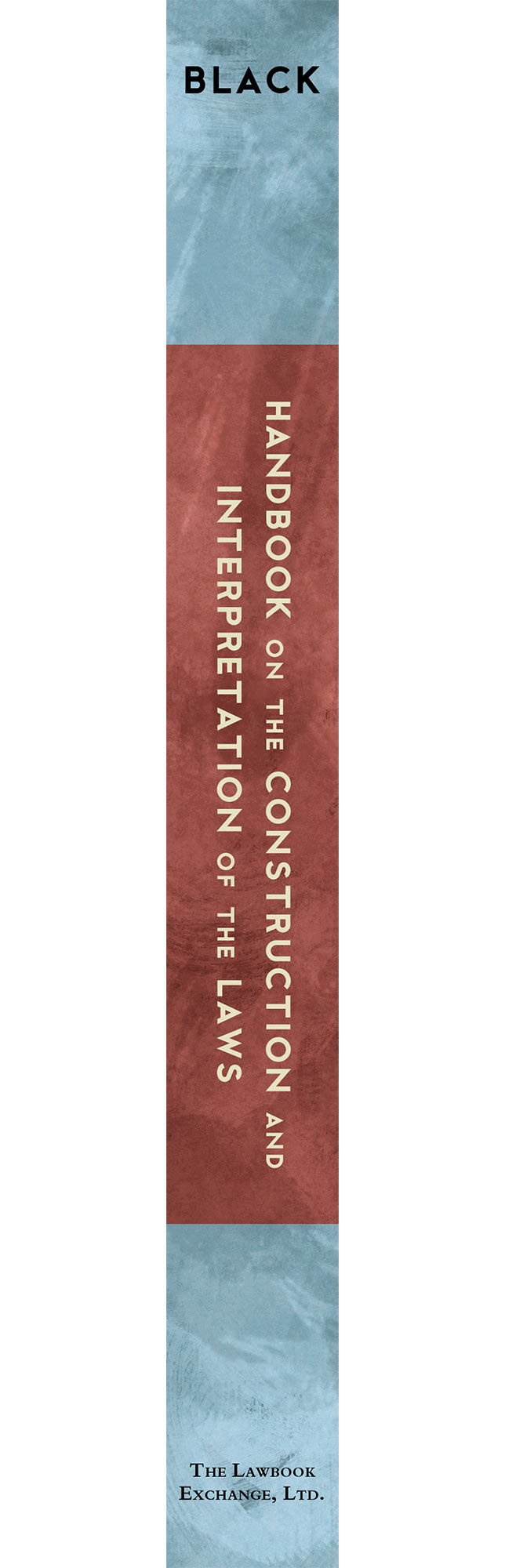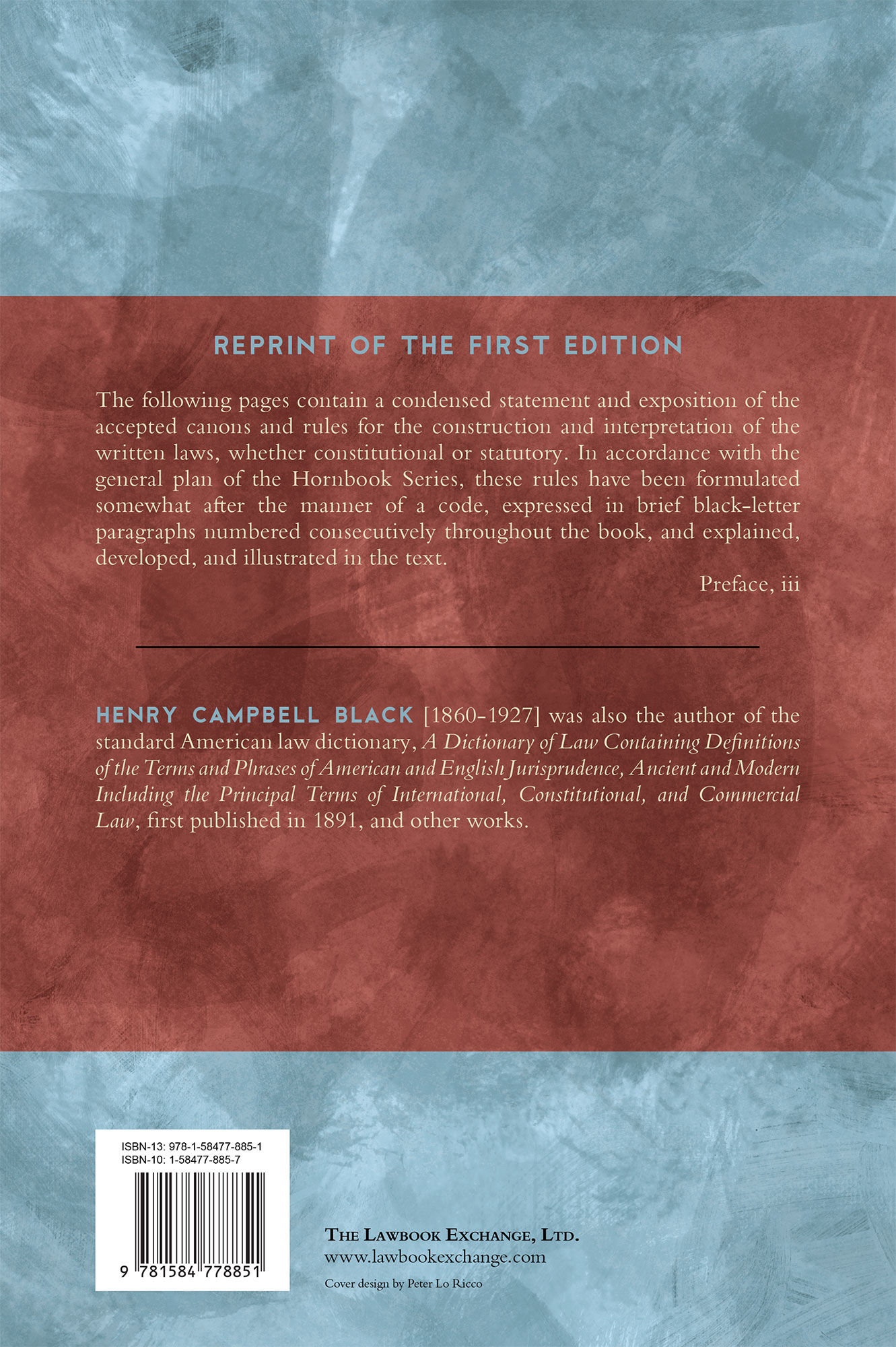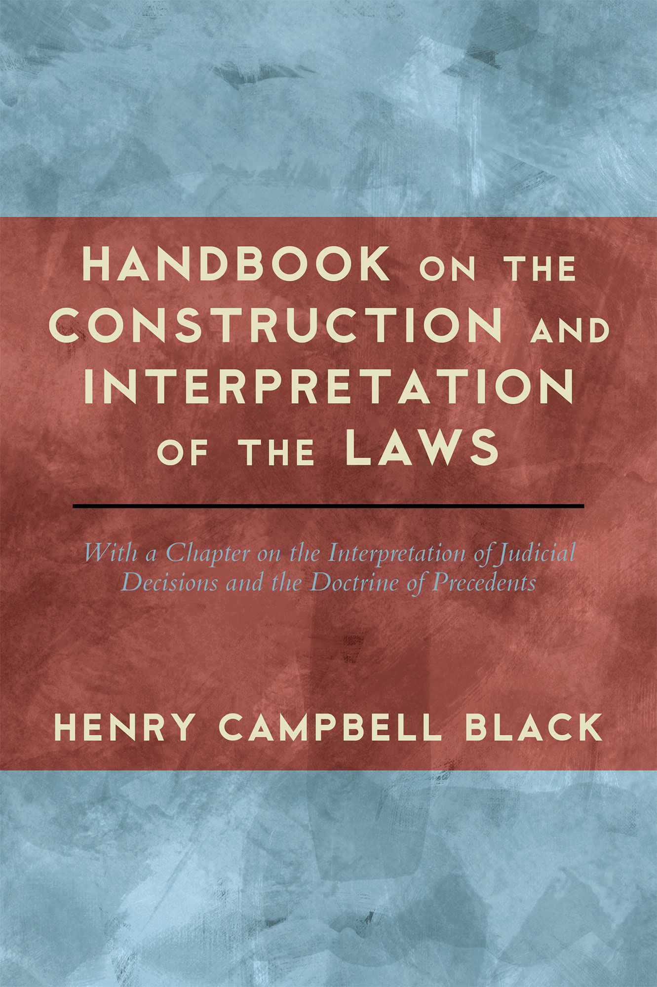 2008. ISBN-13: 9781584778851; ISBN-10: 1584778857. Black on Legal Construction and Interpretation Black, Henry Campbell. Handbook on the Construction and Interpretation of the Laws: With a Chapter on the Interpretation of Judicial Decisions and the Doctrine of Precedents. Originally published: St. Paul: West Publishing Co., 1896. xi, 499, [32] pp. Reprinted 2008, 2011 by The Lawbook Exchange, Ltd. ISBN-13: 9781584778851; ISBN-10: 1584778857. Hardcover. New. $39.95 * Reprint of the first edition. "The following pages contain a condensed statement and exposition of the accepted canons and rules for the construction and interpretation of the written laws, whether constitutional or statutory. In accordance with the general plan of the Hornbook Series, these rules have been formulated somewhat after the manner of a code, expressed in brief black-letter paragraphs numbered consecutively throughout the book, and explained, developed, and illustrated in the text" (Preface, iii). Henry Campbell Black [1860-1927] was also the author of the standard American law dictionary, A Dictionary of Law Containing Definitions of the Terms and Phrases of American and English Jurisprudence, Ancient and Modern Including the Principal Terms of International, Constitutional, and Commercial Law, first published in 1891 and now in its 9th edition, and other works.