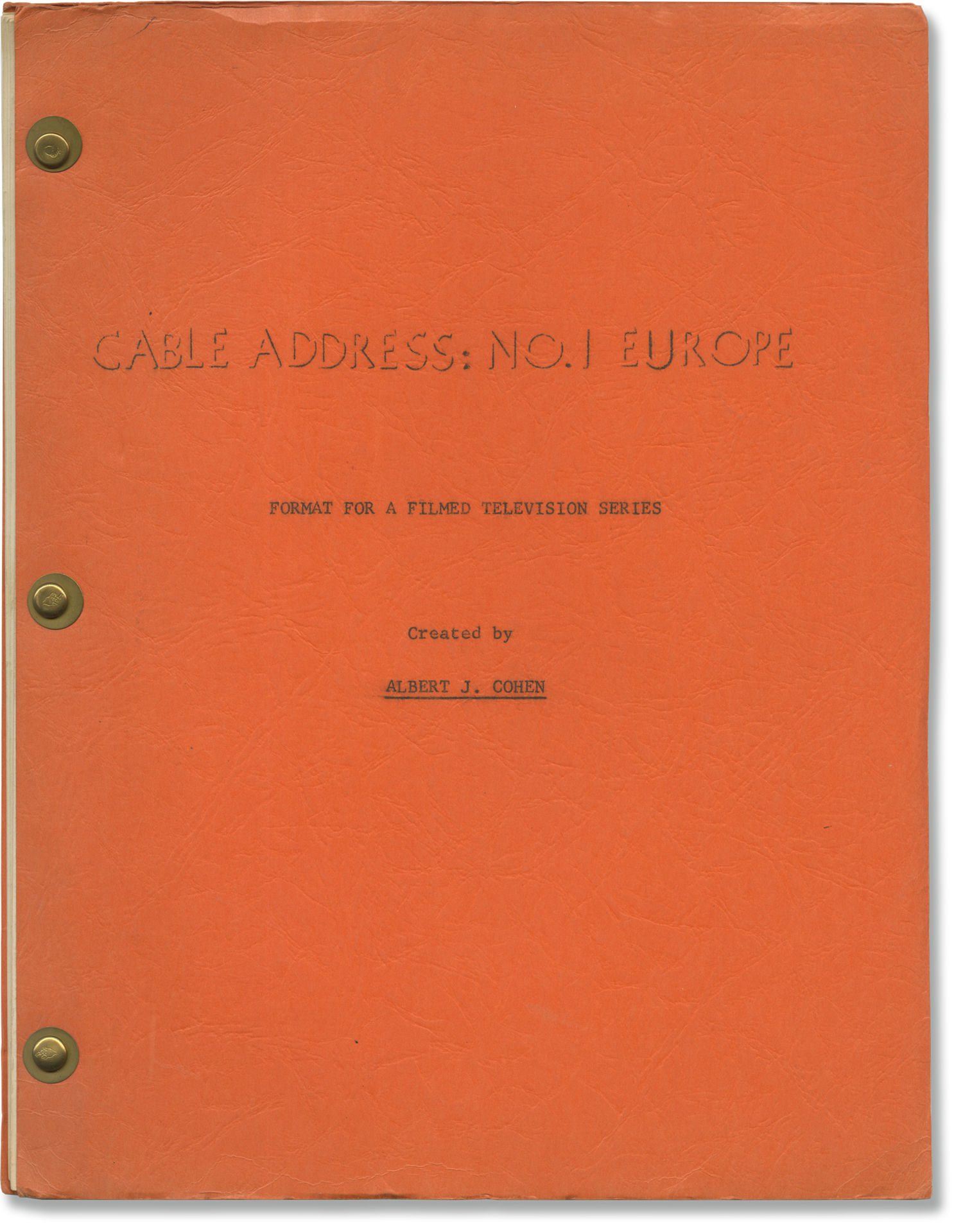 Orange titled wrappers, with credit for screenwriter Albert J. Cohen. Title page present, with credit for screenwriter Albert J. Cohen. 14 leaves, with last leaf of text numbered twelve. Xerographic duplication, rectos only. Pages Near Fine, wrapper Near Fine, bound with three gold brads.