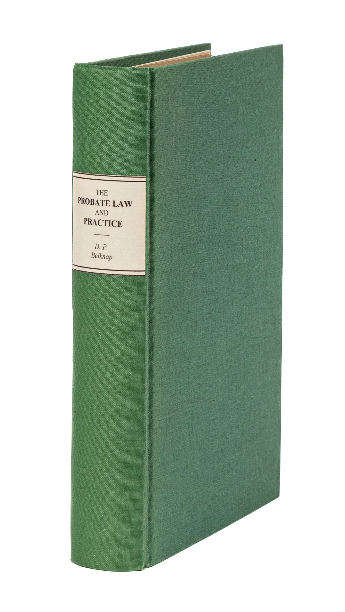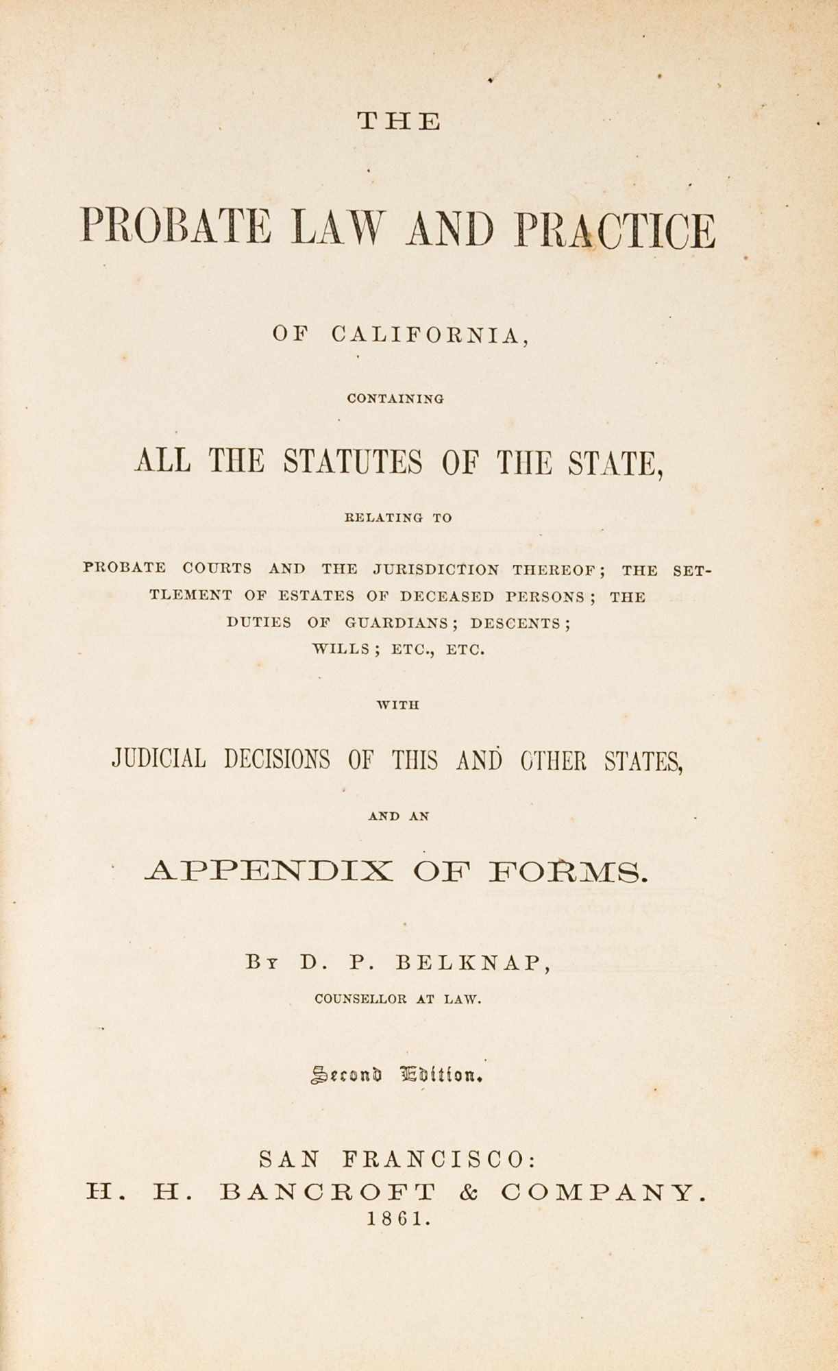 1861. Pre-Fire San Francisco Imprint Belknap, D[avid]. P[rice]. The Probate Law and Practice of California, Containing All the Statutes of the State, Relating to Probate Courts and the Jurisdiction Thereof; The Settlement of Estates of Deceased Persons; The Duties of Guardians; Descents; Wills; Etc., Etc. With Judicial Decisions of This and Other States, And an Appendix of Forms. San Francisco: H.H. Bancroft & Company, 1861. xvi, 241, cclxix pp. Cancel slips tipped in periodically. Octavo (8-1/2" x 5-1/4"). Recent cloth, printed label to spine, endpapers renewed. Moderate toning to interior, occasional light foxing, a few partial cracks to text block, all leaves secure, faint stains (adhesive from cancel slips?) to a few leaves. $250. * Second edition. First published in 1858 under the title California Probate Law and Practice, this treatise provides a thorough guide to probate and estate management for executors, administrators and guardians and includes an appendix of forms. The tipped-in slips list relevant amendments and changes through 1868. Catalogue of the Library of the Harvard Law School (1909) I:143.