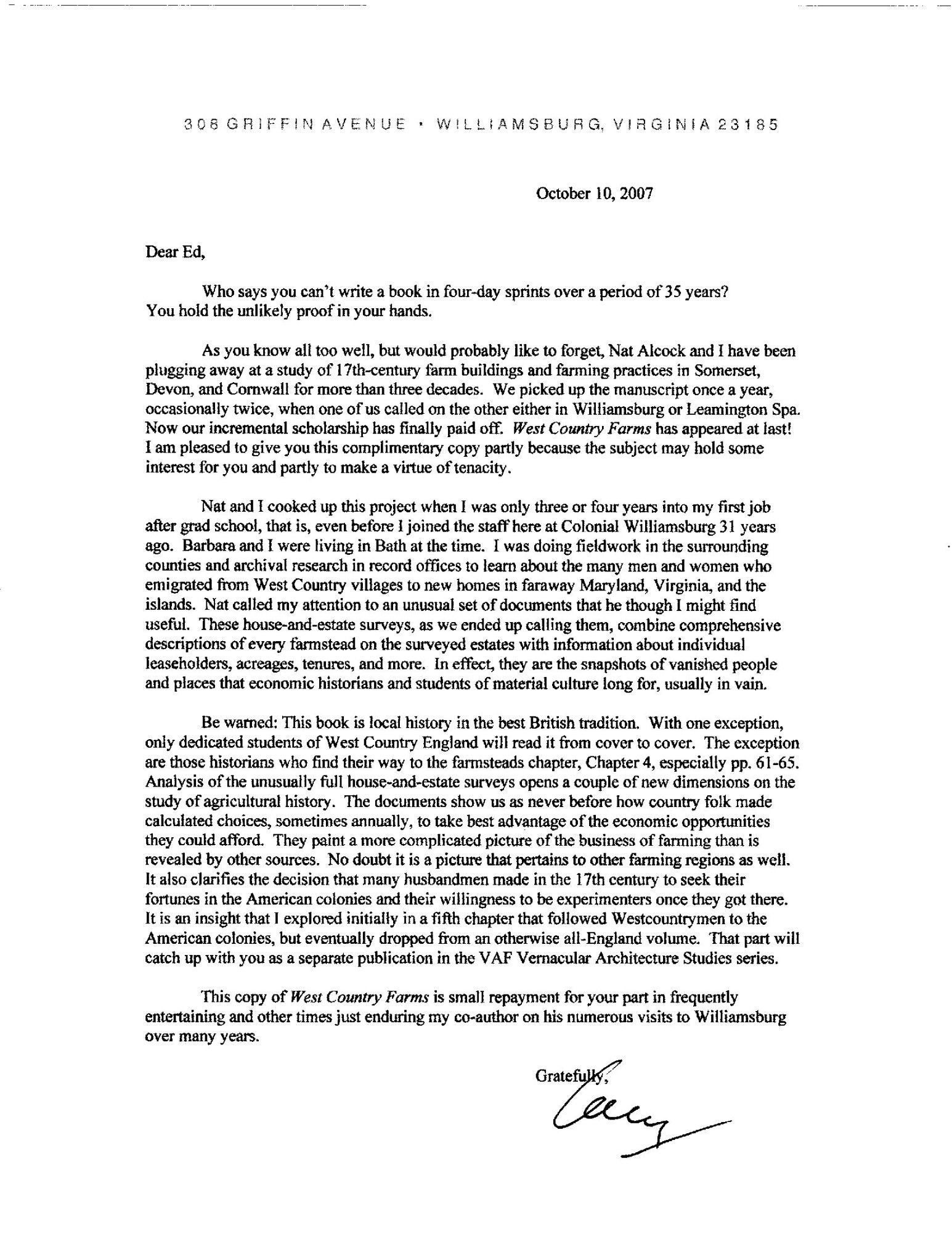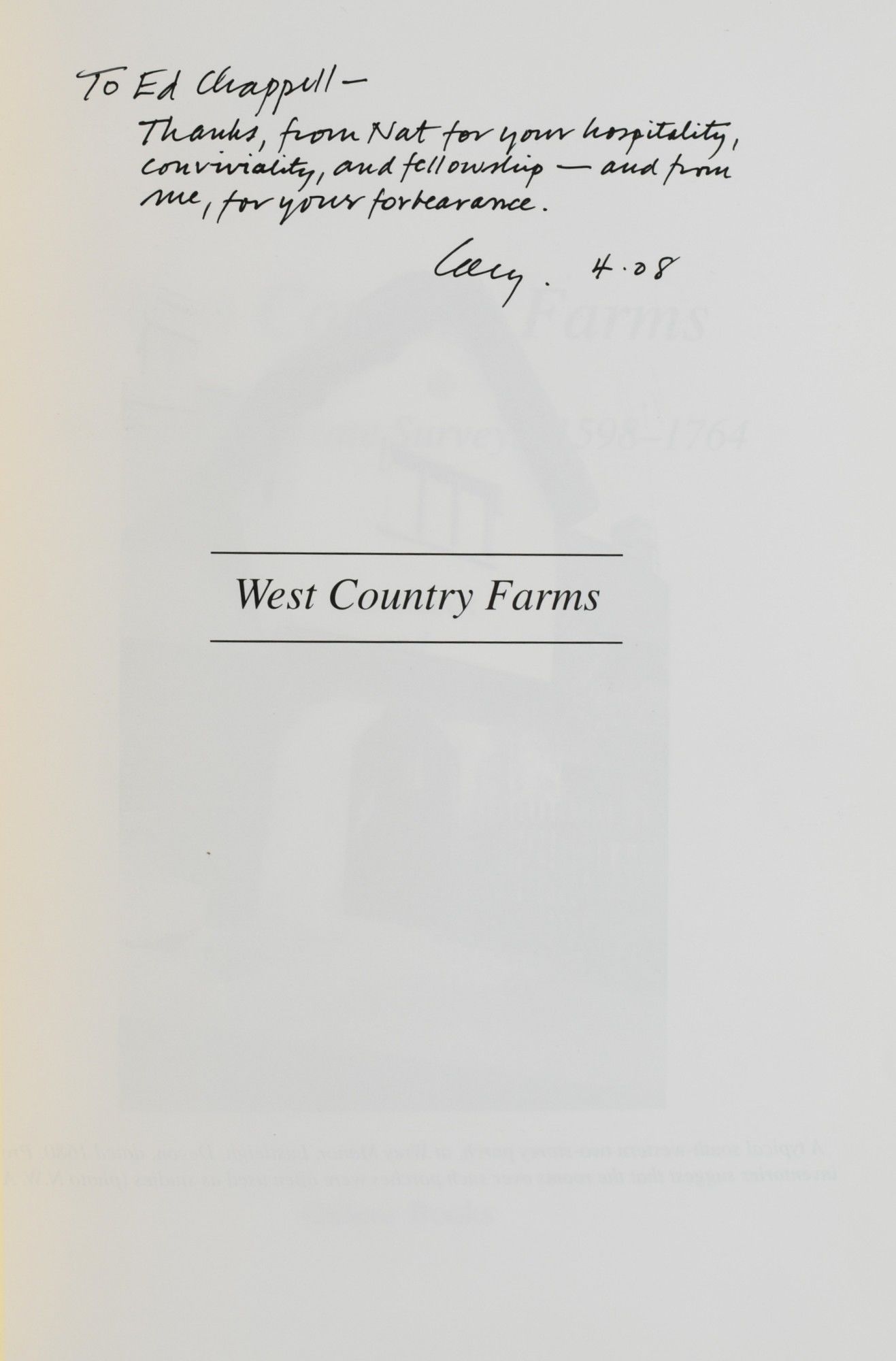 Oxford: Oxbow Books, 2007. First Edition. Hard Cover. Fine binding/Fine dust jacket. Signed. Quarto; in burgundy cloth with dustjacket; xvi, [1], 2-232 including Index; with map of the West Country endpaper.; illustrated with black and white as well as color photographs, and some architectural drawings and photographic facsimiles.~~This copy is inscribed to architectural historian Ed Chappell: "To Ed Chappell -- |Thanks from Nat for your hospitality; | conviviality, and fellowship -- and from | me, for your forbearance. | Cary. 4-28".~Also laid in is a substantial TLS to Mr. Chappell from Cary Carson: "Who says you can't write a book in four-day sprints over a period of 35 years. You hold the unlikely proof in your hands.". Fine binding / Fine dust jacket.