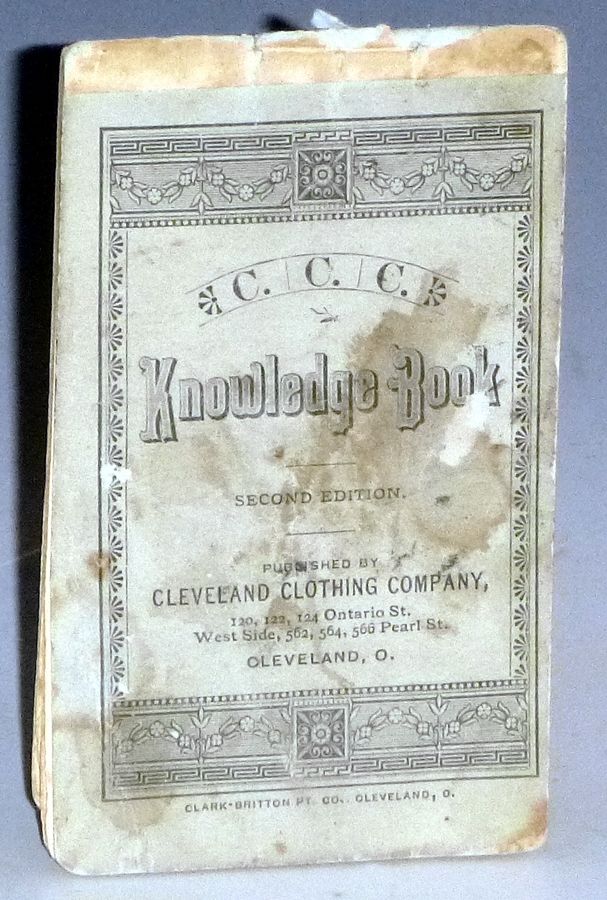 Cleveland Clothing Company, 1885.  Approx.2 5/8" x 4 1/2" 30 pages. One of Cleveland's large manufacturing ready-to-wear children's clothes and men's accessories. They suffered a major fire in February 1892 forcing them to give up their business. No references found in OCLC, NUC or elsewhere online. Clearly, this was a promotional item with the 1885 and 1886 calendar at the end of the item. Worn and fragile but certainly the only known copy to have survived. A list of various events in American history, how to measure for men's clothing, etc. P. 16 lists all the "strong features of the C.C.C. [Cleveland Clothing Company].string bound in blue decorative front wrapperlacks rear wrapper, some staining to from wrapper.