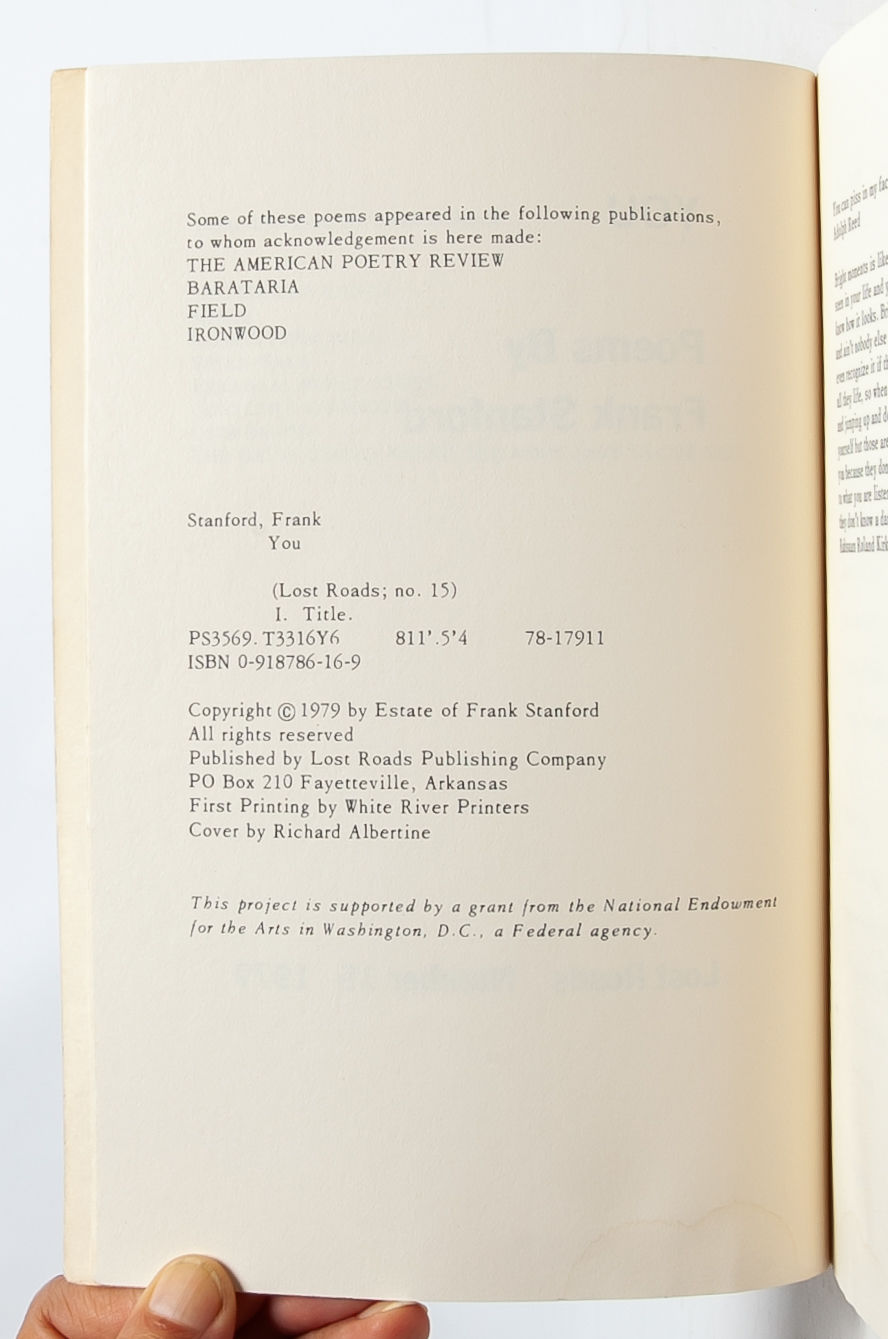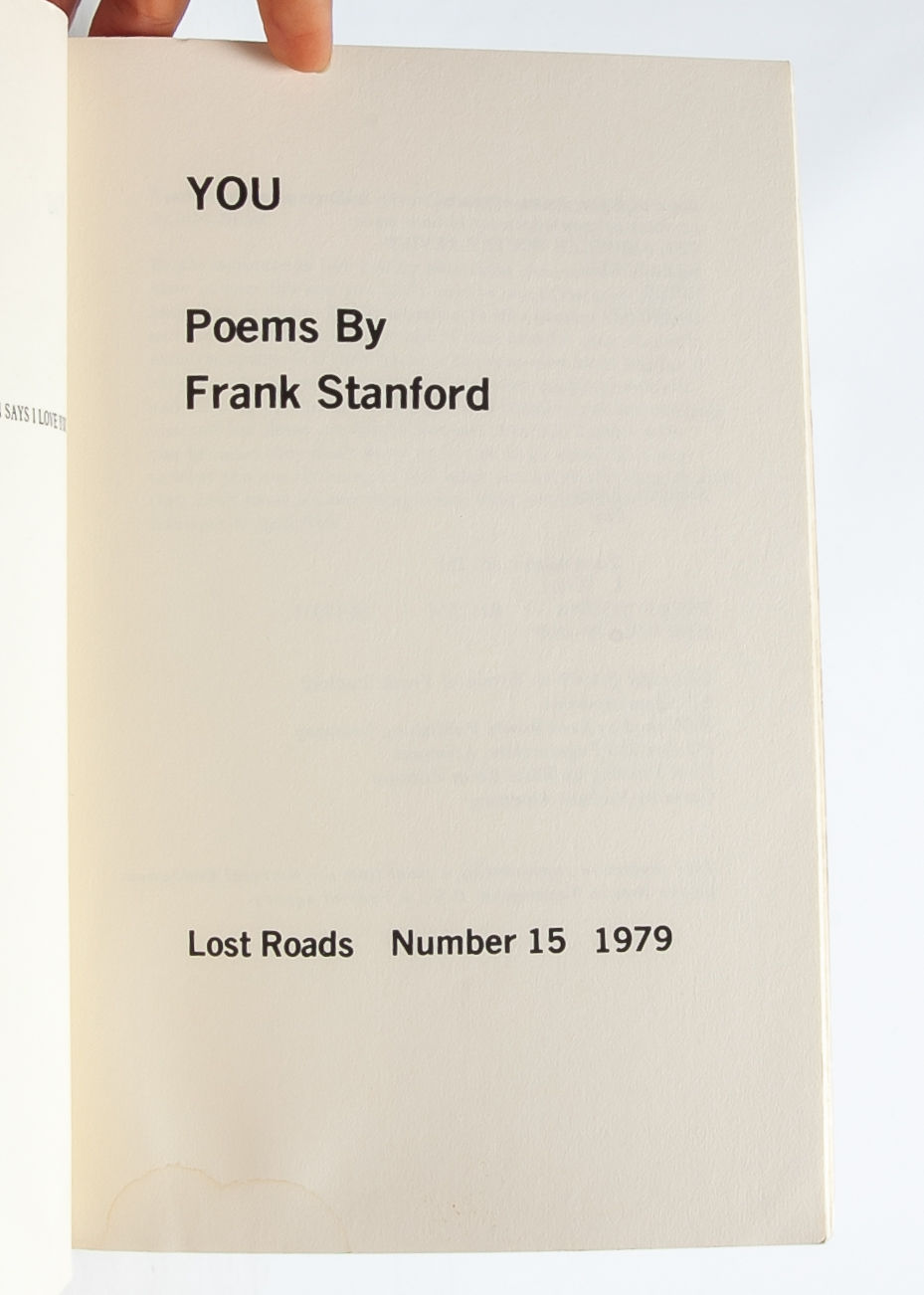 The second posthumous publication of Stanford’s work (following Crib Death), published as Lost Roads Number 15. An increasingly scarce example of Stanford's maturing work, cut short by his suicide at 29. Threatening animals mingle with weary men and observant, suspicious women in these stark poems. Death creeps through many of the poems as well: "When you get lost on the road / You run into the dead." Near Fine.