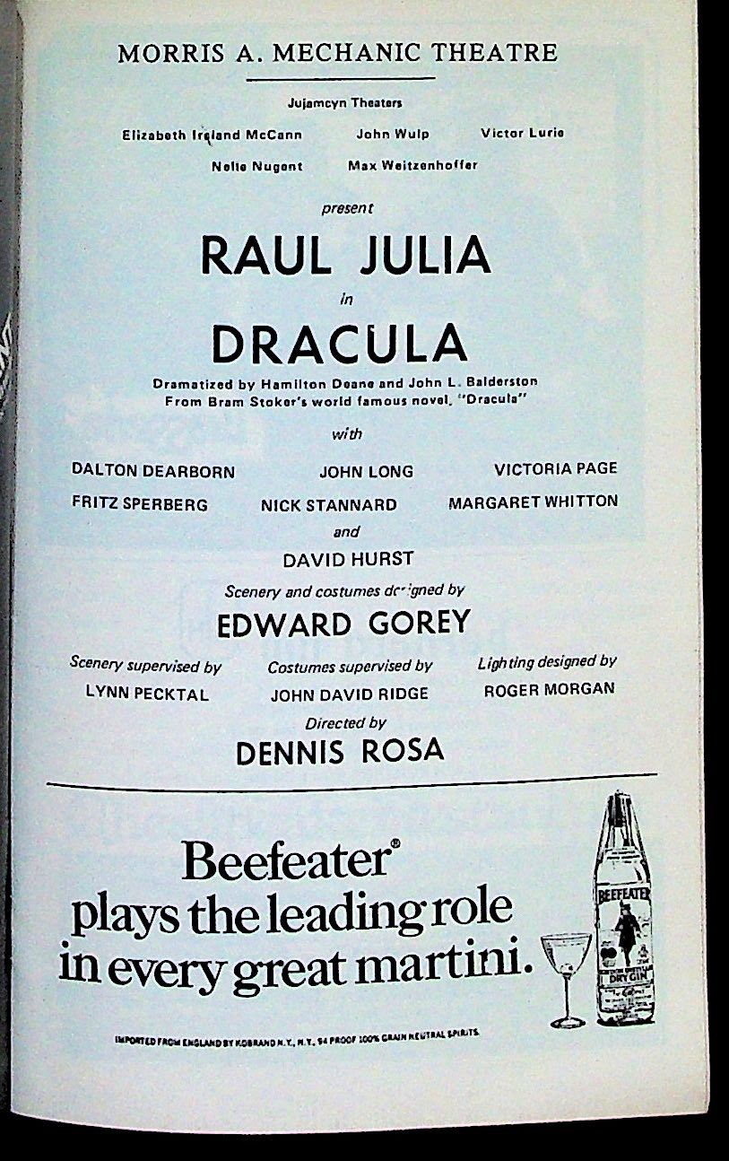 Baltimore: Playbill Magazine / Mechanic Theatre, 1978. Paperback. Very Good. Paperback. Originally preformed at the Wilbur Theatre in Boston for a limited time, it appeared at the end of October in New York on Broadway at the Martin Beck theatre in 1977. This dramatised version of Dracula starring Raul Julia (who replaced Frank Langella) featured costumes and scenery designed by Edward Gorey. True to Gorey's illustration style, the costumes were all designed in black, white, and gray with touches of red. He won a Tony award for his costume designs and was nominated for a Tony for his set designs for this play. The cover of this Playbill for the Baltimore performance features an illustration by Gorey. Unlike the New York edition of the Playbill, this Baltimore edition does not include Gorey's costume sketches or photographs from the play. Still, an uncommon and collectible item. Includes an article on John Travolta and advertisements for many Baltimore area businesses. Bound in white side-stapled illustrated paper wrappers with title to front cover. Small fold to bottom of front cover, else fine. Unpaginated. DRA/120723.