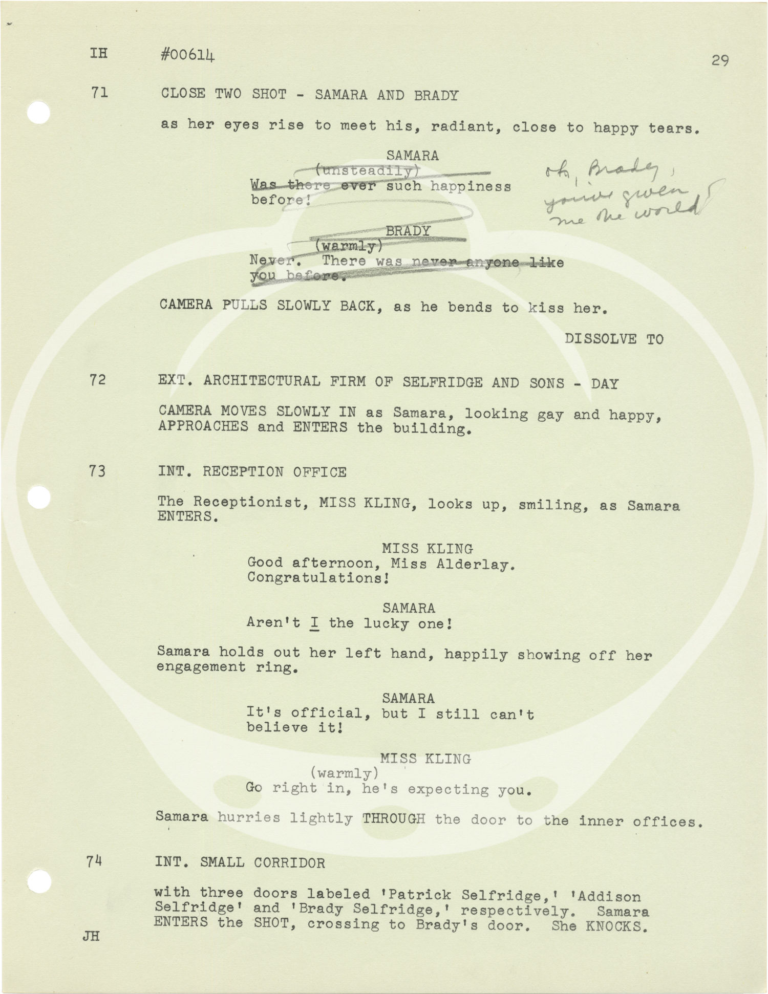 White untitled wrappers. Title page present, dated July 20, 1965, noted as First Draft Screenplay, with credits for screenwriter Jean Holloway. 115 leaves, with last page of text numbered 114. Mimeograph duplication on eye-rest green stock, rectos only. Pages Very Good plus, wrapper Near Fine, bound with two gold brads.