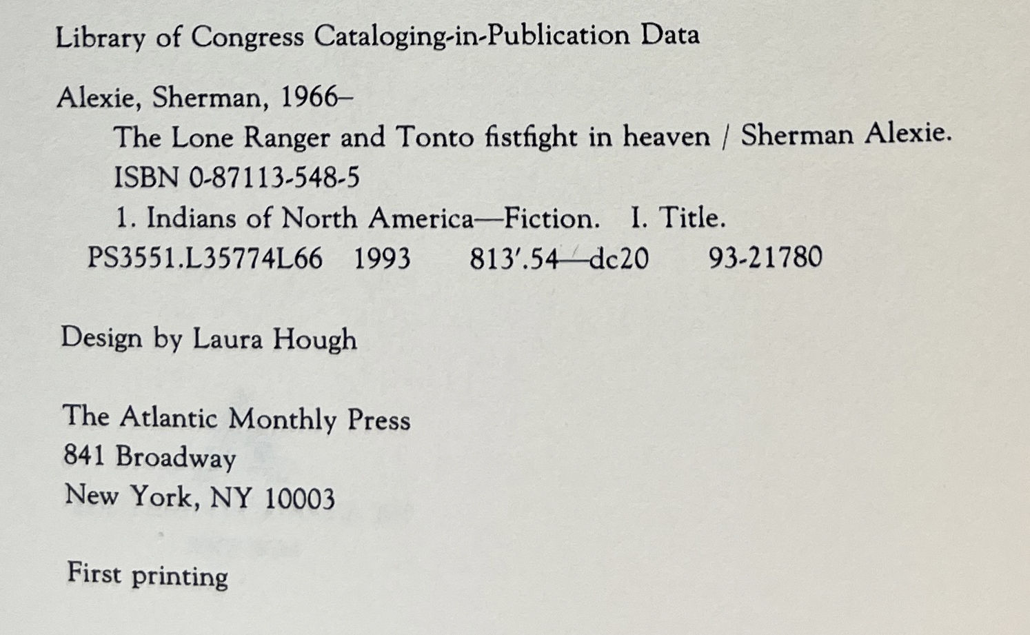 New York: Atlantic Monthly Press, 1993. First Edition. Hardcover. Very Good/Near Fine. Very Good in a Near Fine jacket, unclipped ($21), faded at the spine, lightly rubbed at the edges. Blue cloth, bumped at the corners, with silver gilt lettering on the spine. Square and firmly bound, former owner's information written on the front endpaper, clean otherwise. The debut story collection from the National Book Award-winning author of The Absolutely True Diary of a Part-Time Indian.