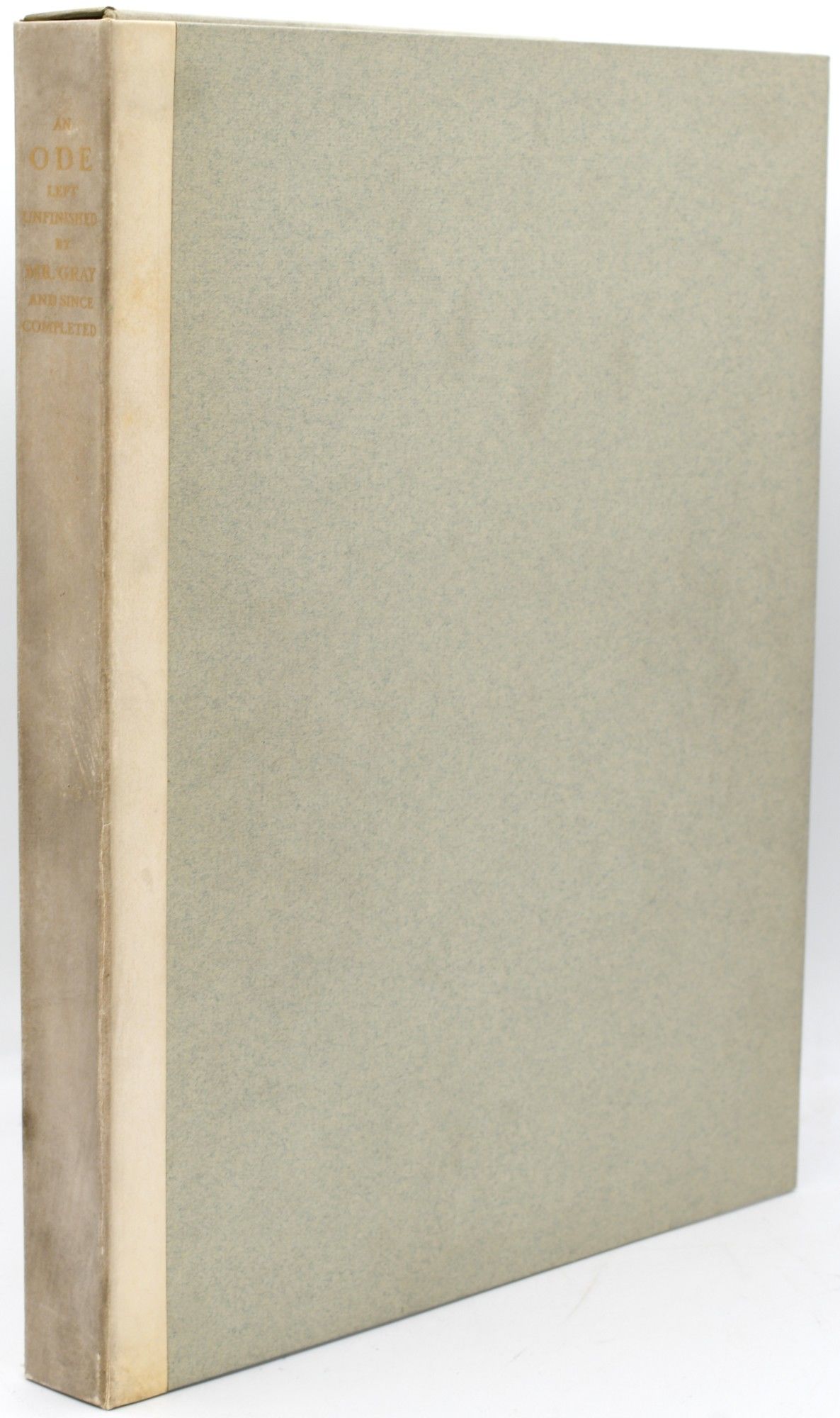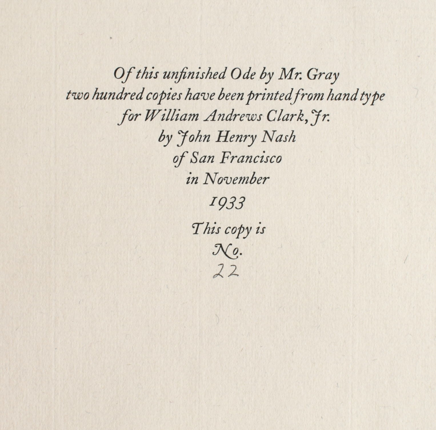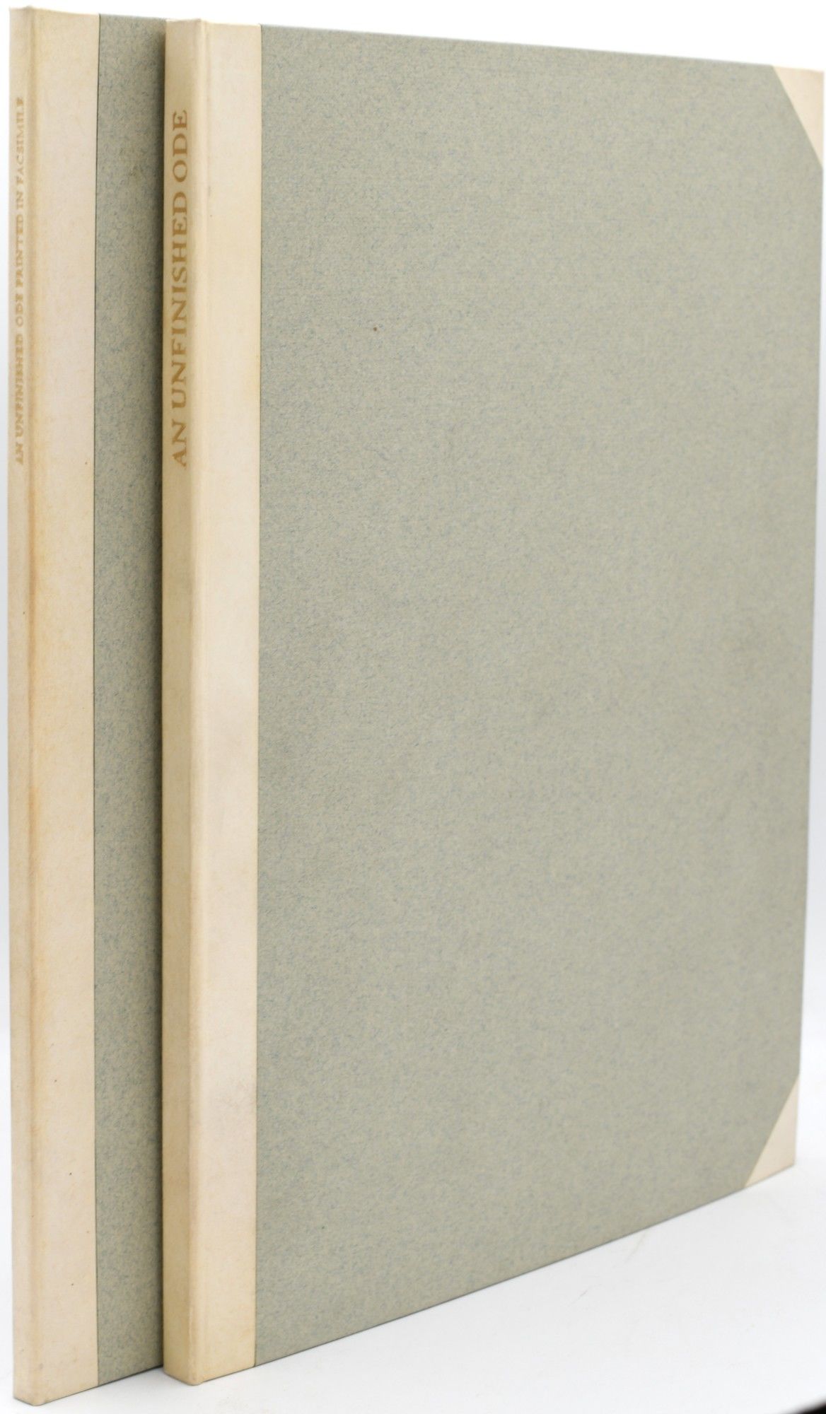 Printed by William Andrews Clark by John Henry Nash, 1933. Very Good binding. Two quarto volumes; each in quarter vellum in grey paper-covered boards, lettered in the gilt to the spines; and a gray paper-covered chemise, the whole housed in a slipcase; the slipcase is soiled and has some tape repair as does the chemise; the editiod limited to two hundred copies, of which this is #22; with a “Compliments of William Andrews Clark | Christmas,1933” slip tipped in; the second volume holds an 8-pages facsimile of the original printing of the Ode; the chemise is backed in vellum lettered in gilt; the slipcase has a printed paper label to the spine. Very Good binding.