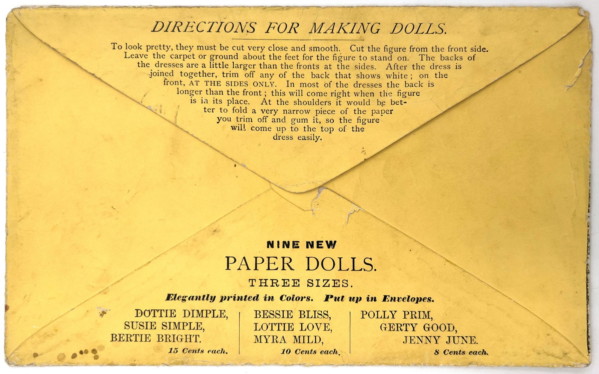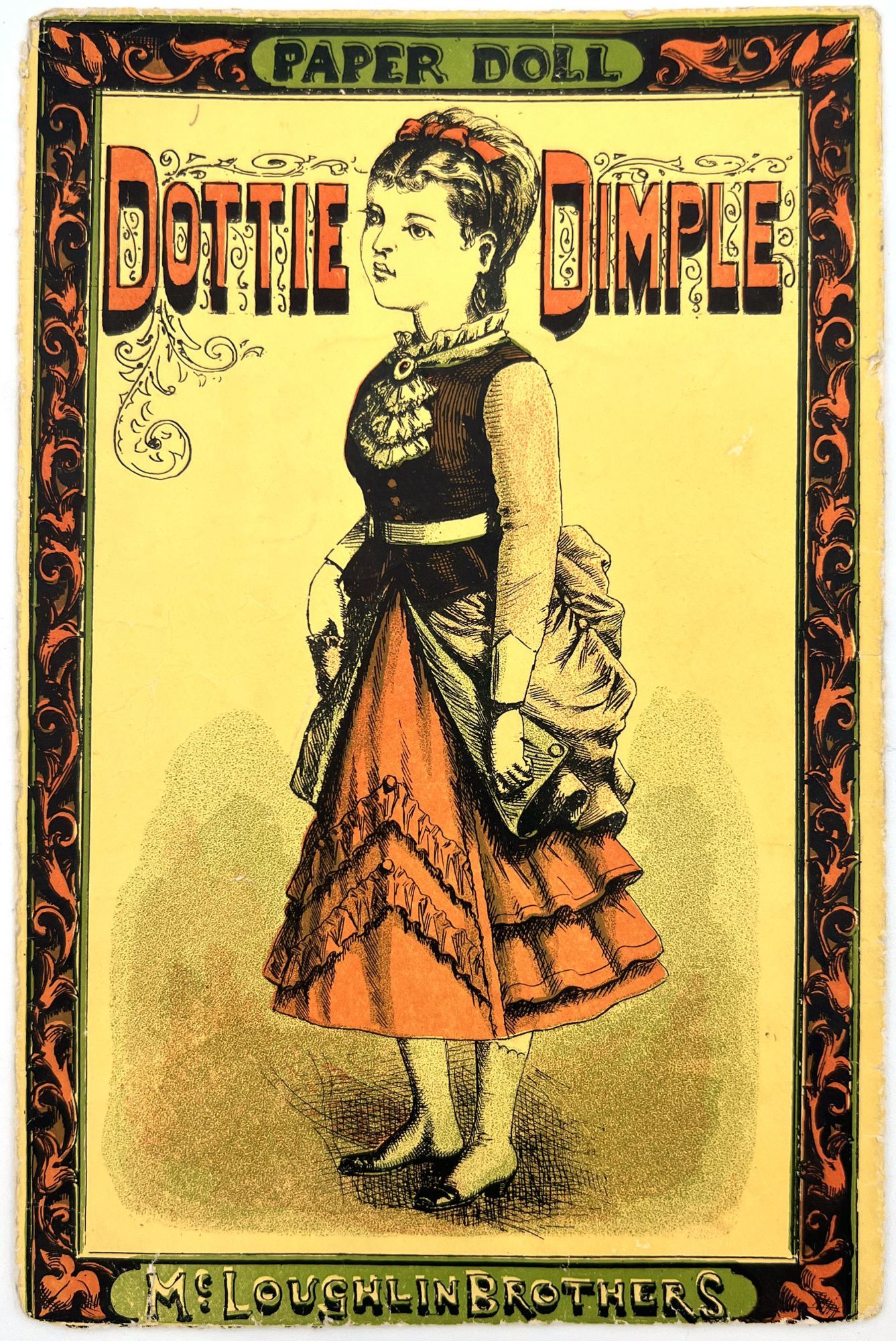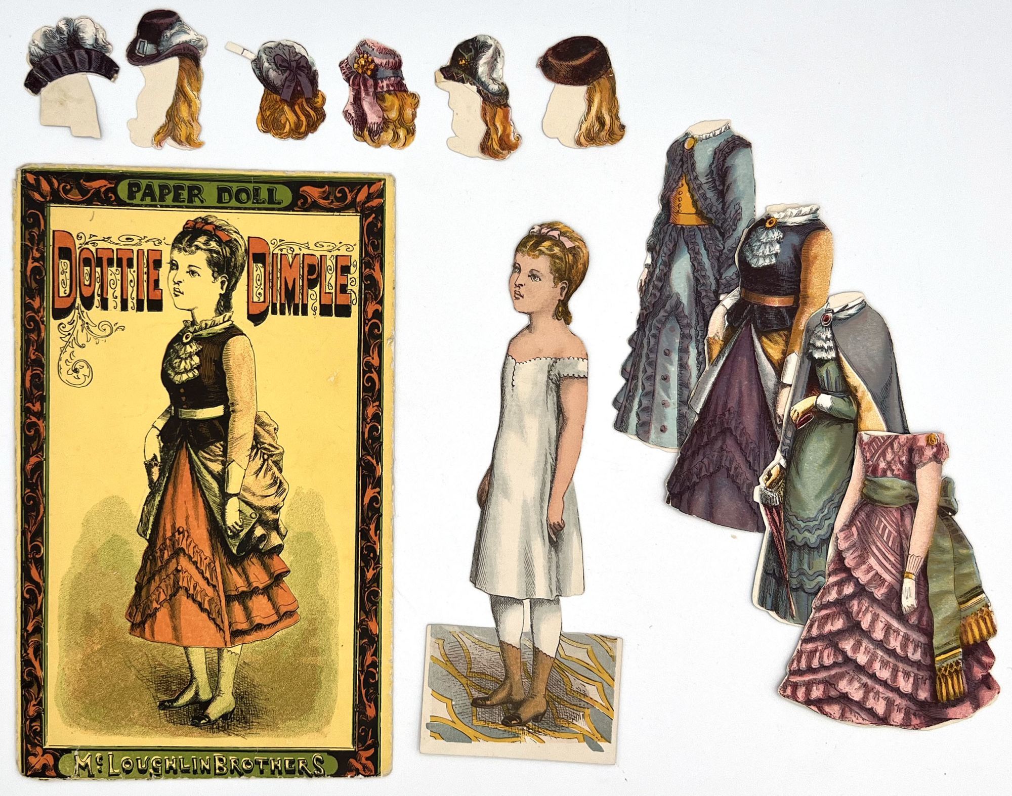 McLoughlin Bros, 1875. Near-fine; a bright and saturated example. A couple short tears, edge wear, small surface tears. Envelope a little rubbed. One hat may be lacking back. Two costumes lacking.. Published by McLoughlin, this example of "Dottie Dimple" is offered with the scarce original envelope. The doll, costumes, and hats/hair accessories are all two-sided; the costumes are designed to slip over the doll's head. Includes 8.25" paper doll, four (4) outfits, and six (6) hats/hairs. Original illustrated envelope measures 9.25" by 5.75