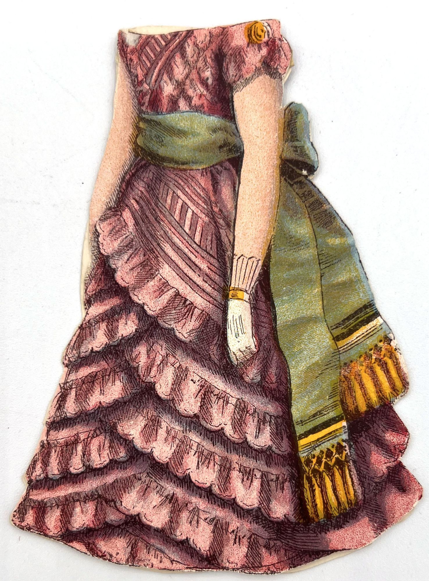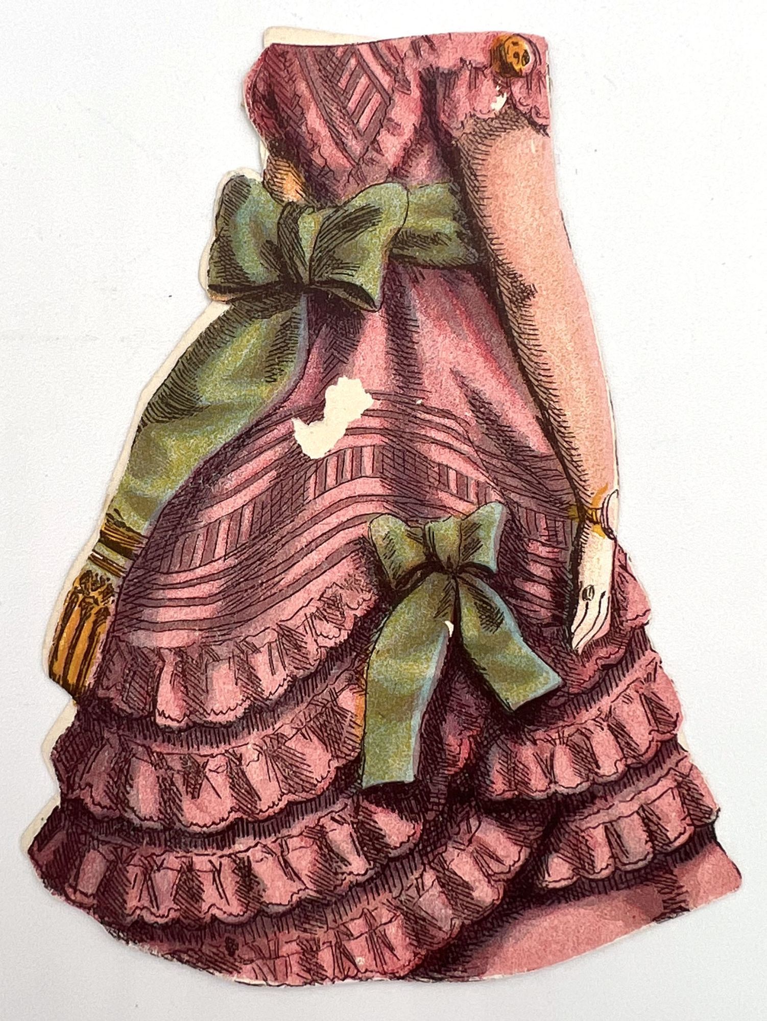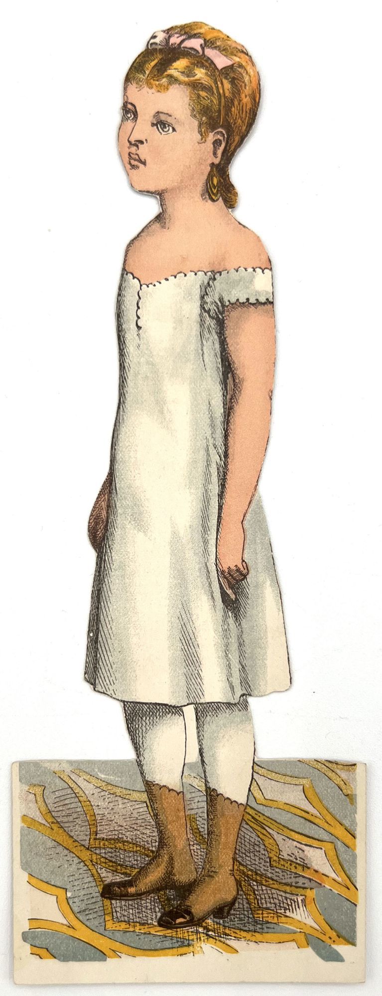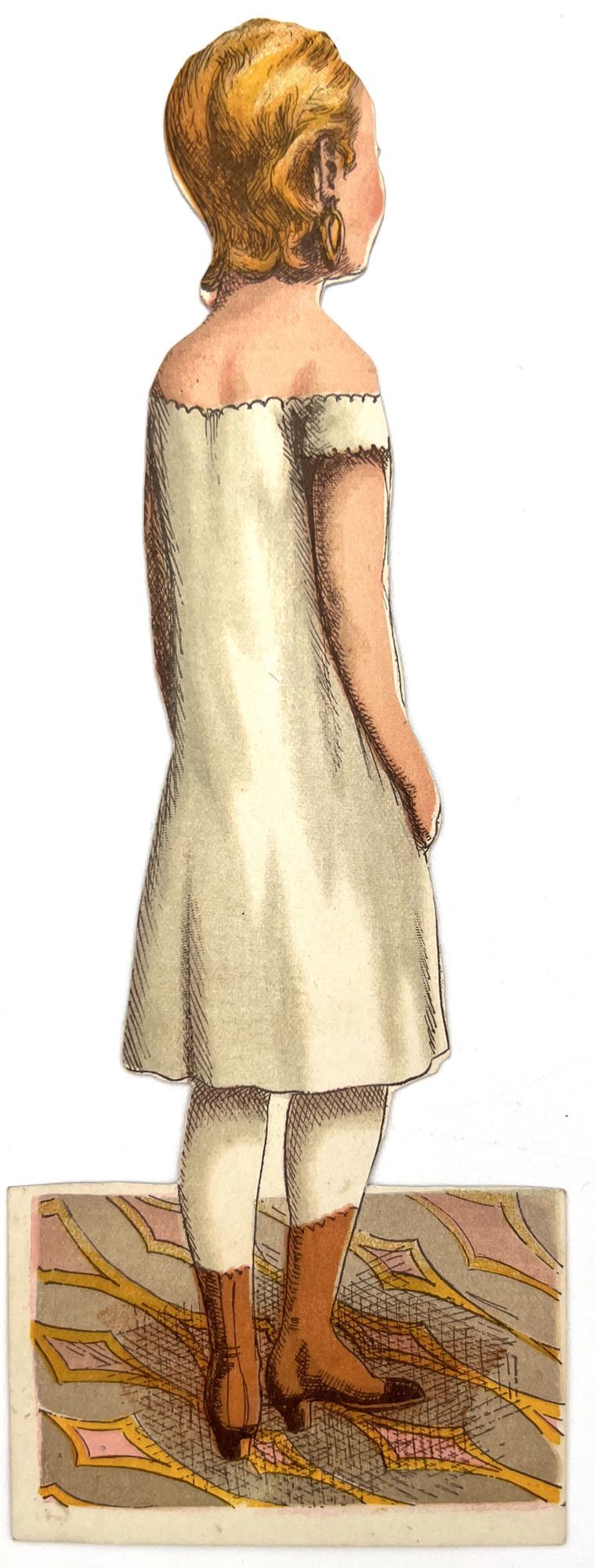 McLoughlin Bros, 1875. Near-fine; a bright and saturated example. A couple short tears, edge wear, small surface tears. Envelope a little rubbed. One hat may be lacking back. Two costumes lacking.. Published by McLoughlin, this example of "Dottie Dimple" is offered with the scarce original envelope. The doll, costumes, and hats/hair accessories are all two-sided; the costumes are designed to slip over the doll's head. Includes 8.25" paper doll, four (4) outfits, and six (6) hats/hairs. Original illustrated envelope measures 9.25" by 5.75