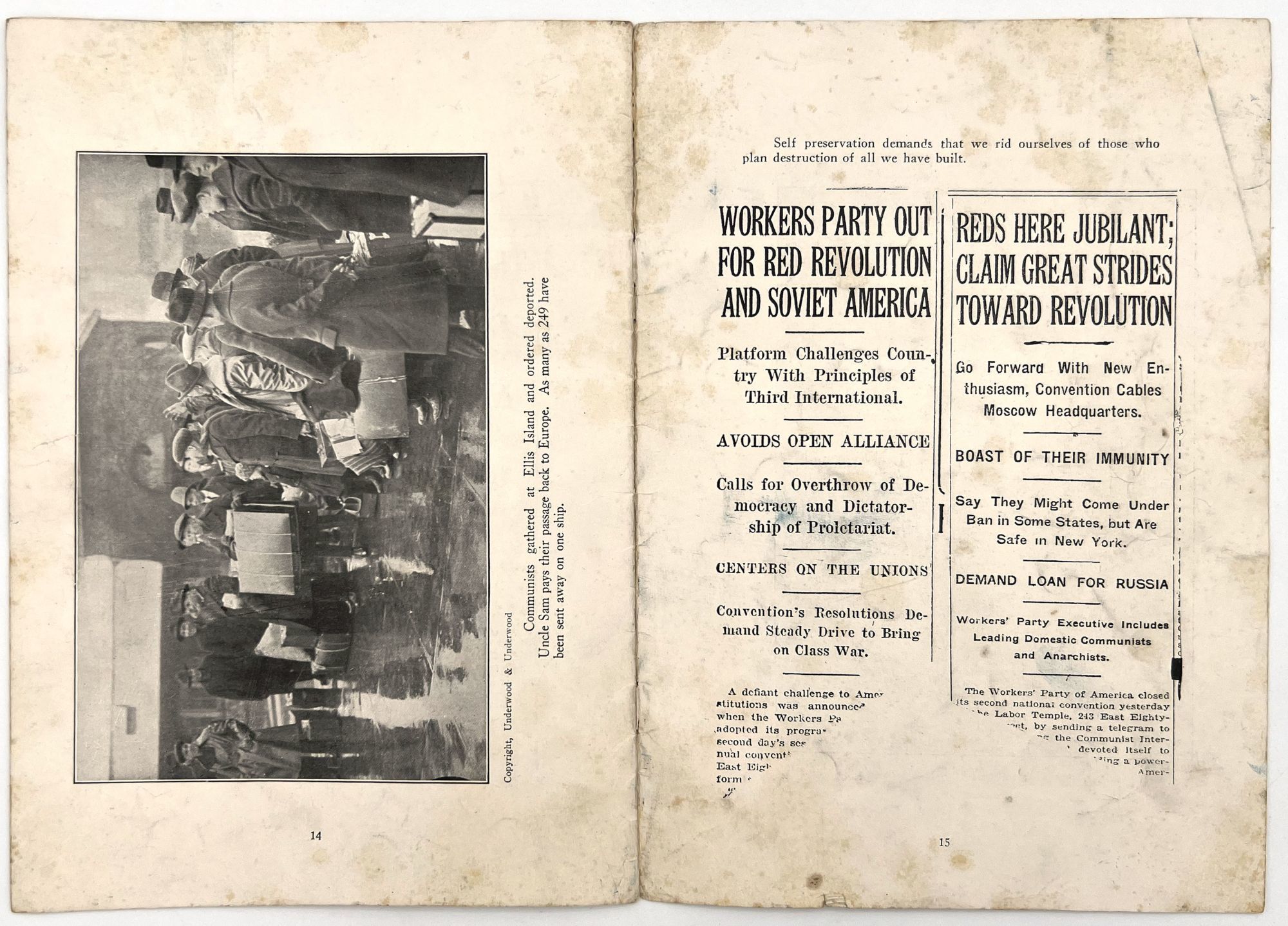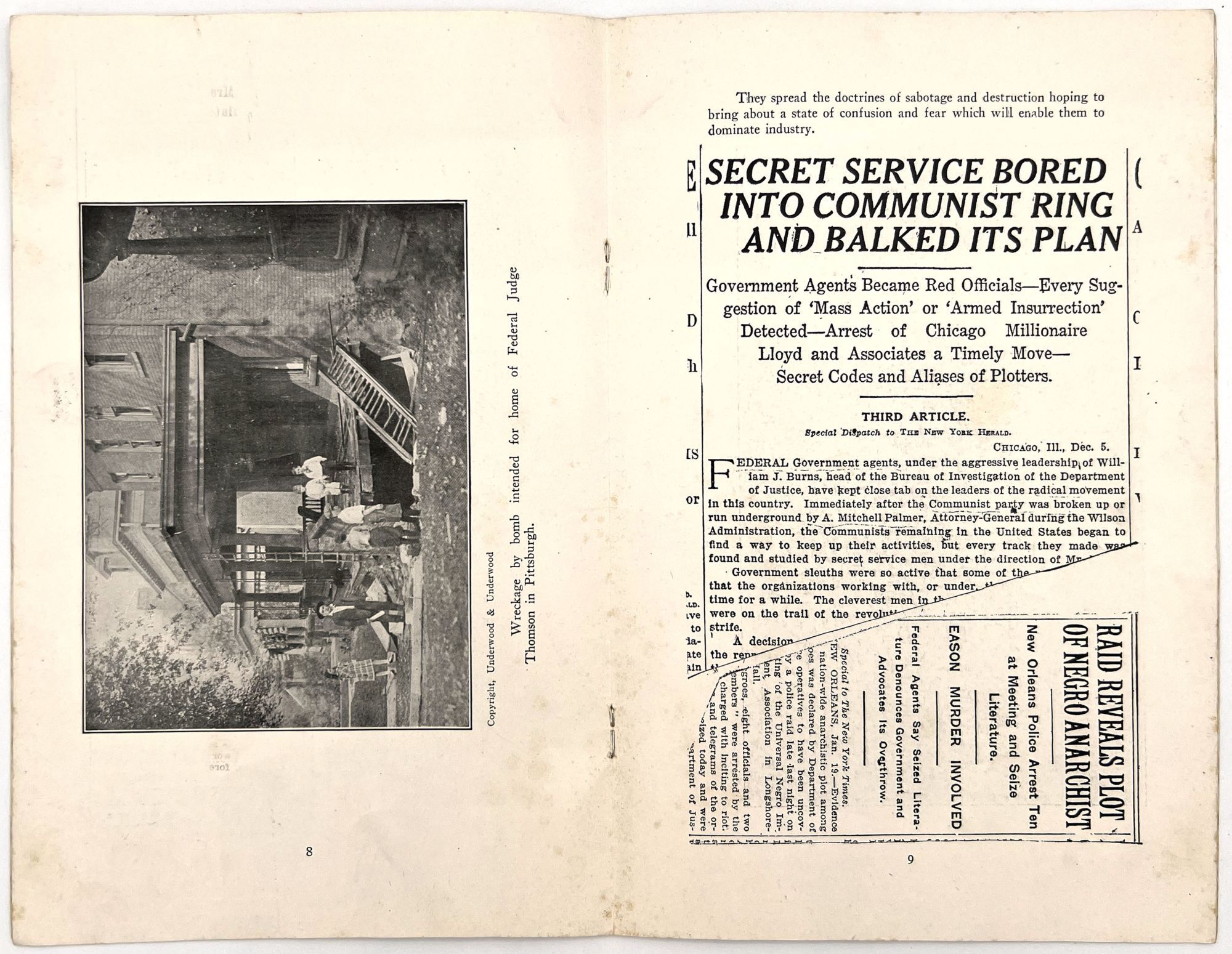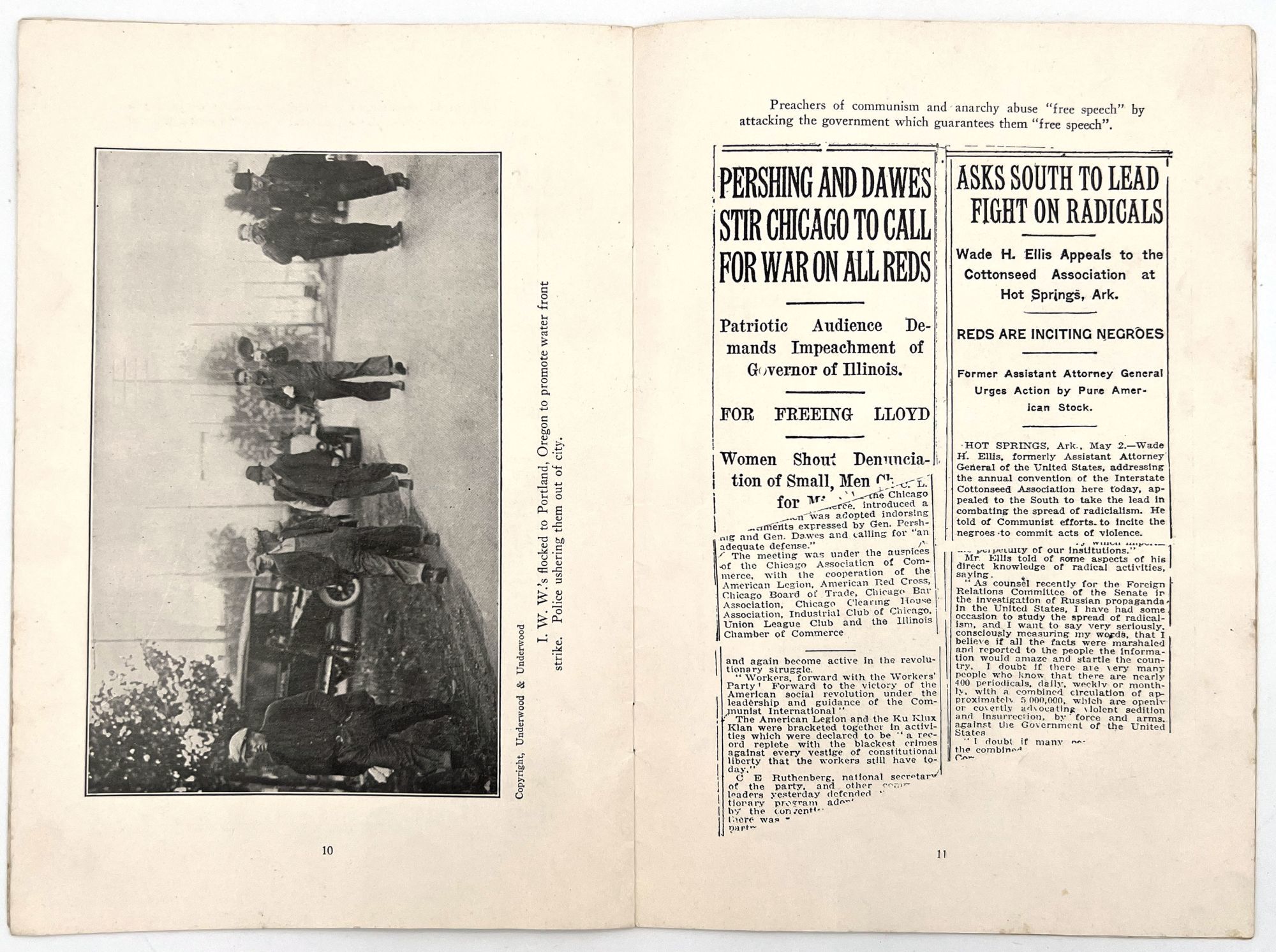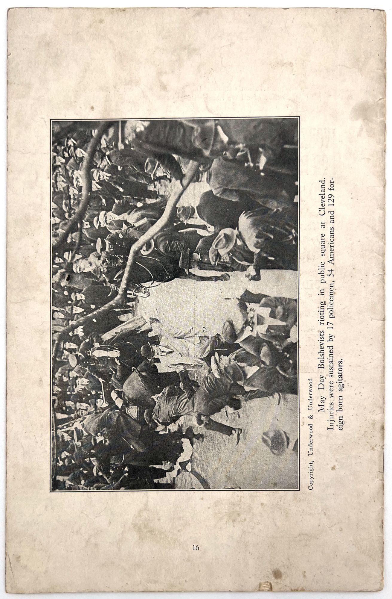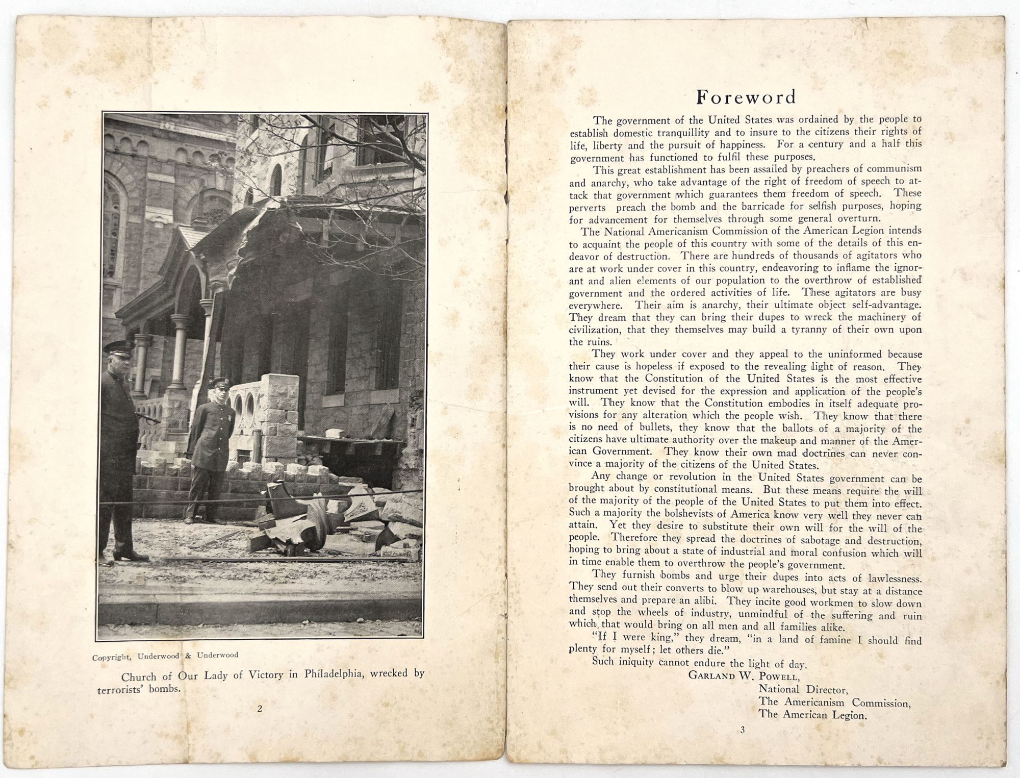 United States: [The American Legion?], 1925. Fair. Lacking original wrappers and title page. Dust soiled with some minor short tears, staining.. The present booklet was published for the general public, most likely by the American Legion, in a bid to establish communism as an insidious threat to the American way of life and democracy. Includes a foreword by Garland W. Powell, National Director of the Americanism Commission of the American Legion. The foreword establishes the booklet's strict anti-Communist point of view as a means to save American democracy: "The government of the United States was ordained by the people to establish domestic tranquility and to insure to the citizens their rights of life, liberty and the pursuit of happiness..." The remainder of the booklet includes reproductions of photos of chaos purportedly wrought by communists and revolutionaries, as well as newspaper clippings with captions such as, "Hundreds of thousands of agitators are at work in this country". Features a reproduction of a 1923 cartoon by Herbert Johnson, depicting a strapping sailor ("American Labor") aboard a ship ("American Industry") being attached by pirates ("Communist", "Red", "Revolutionist"). 8vo (9.25" by 6"), pp. 16 with in-text illustrations, lacking original wrappers and possibly title page.