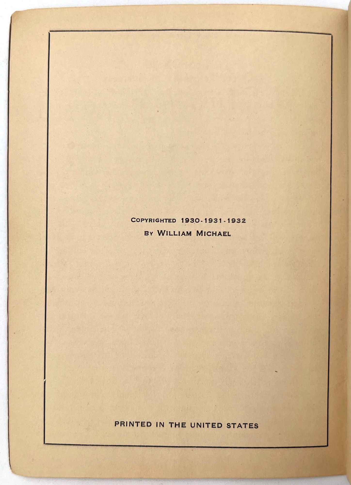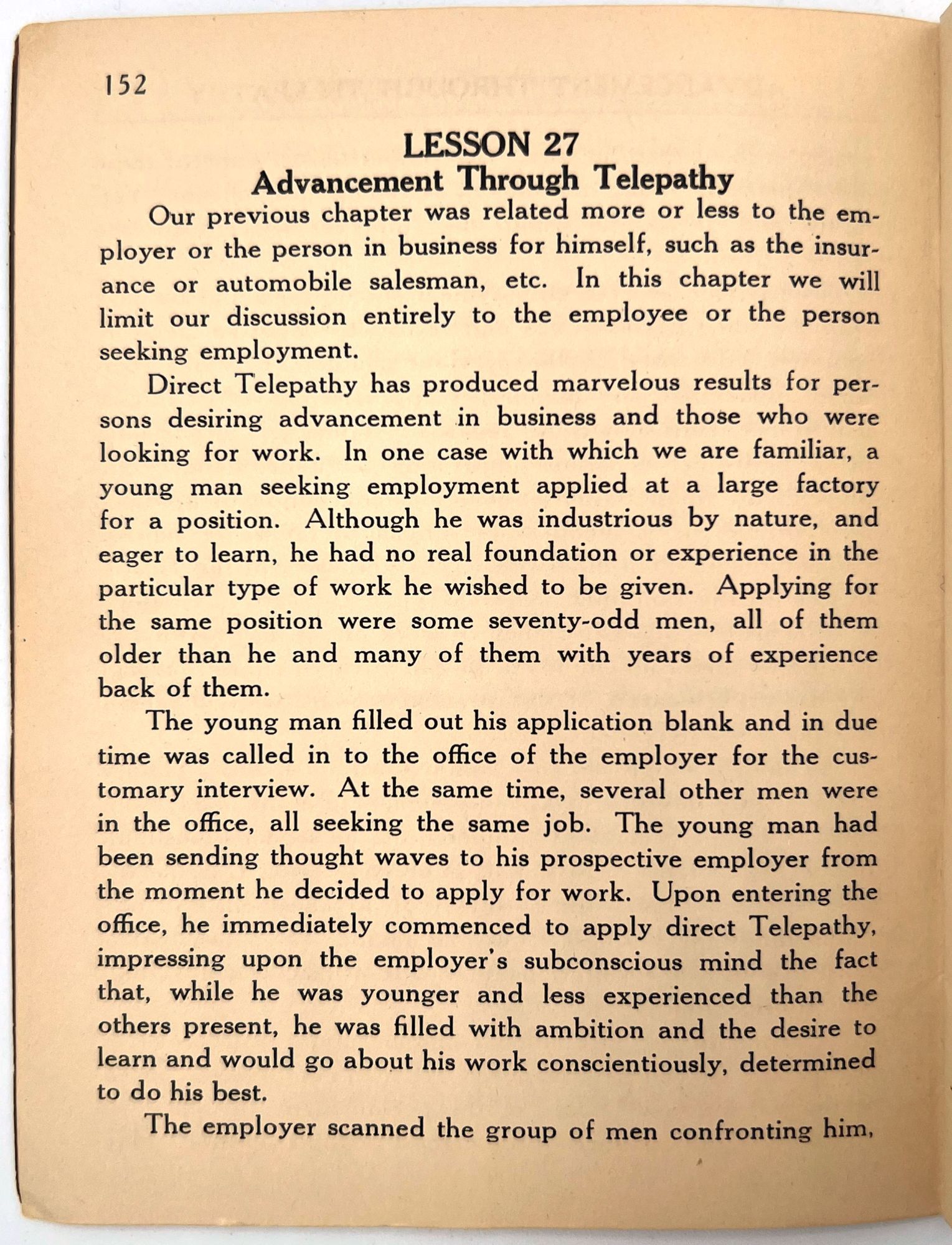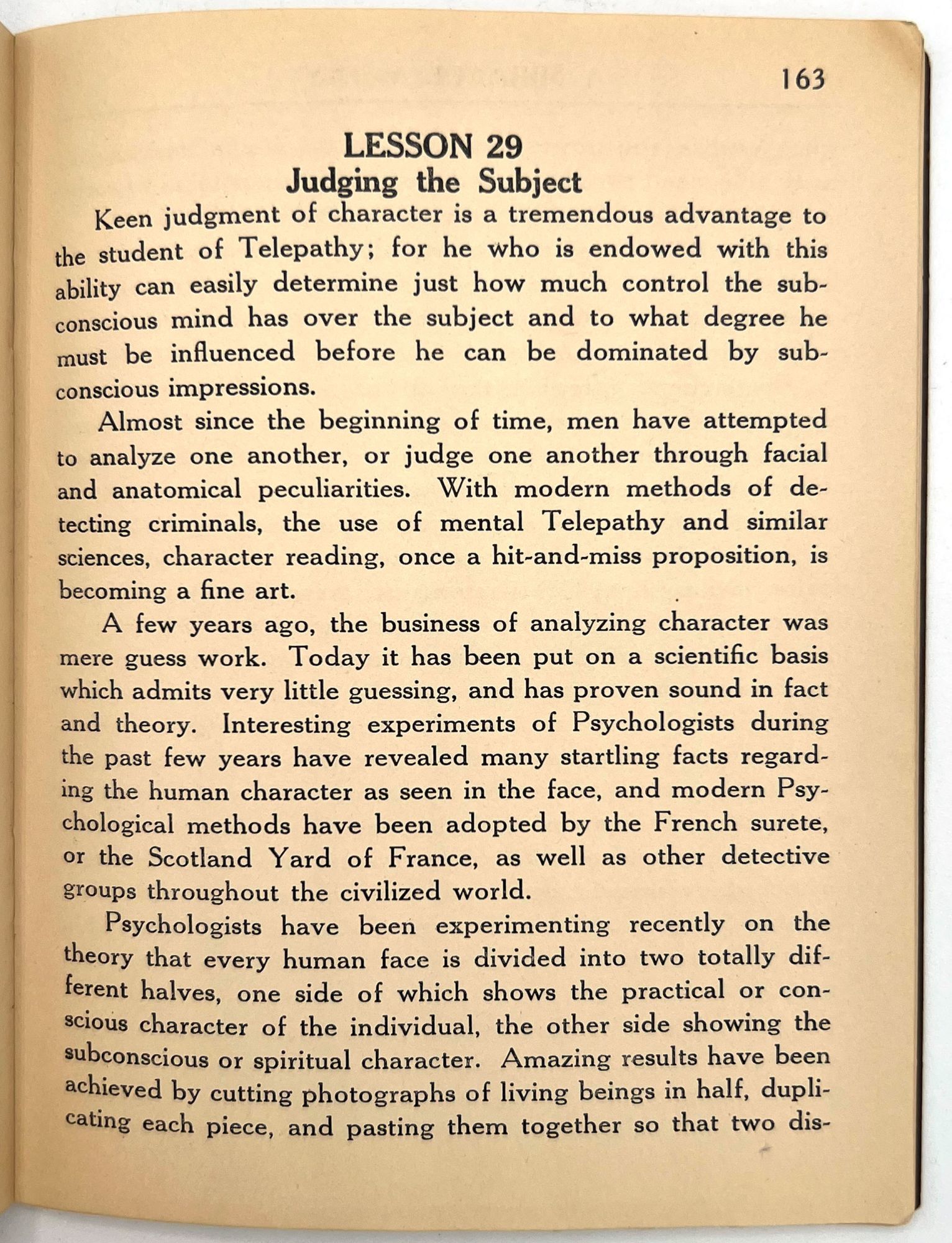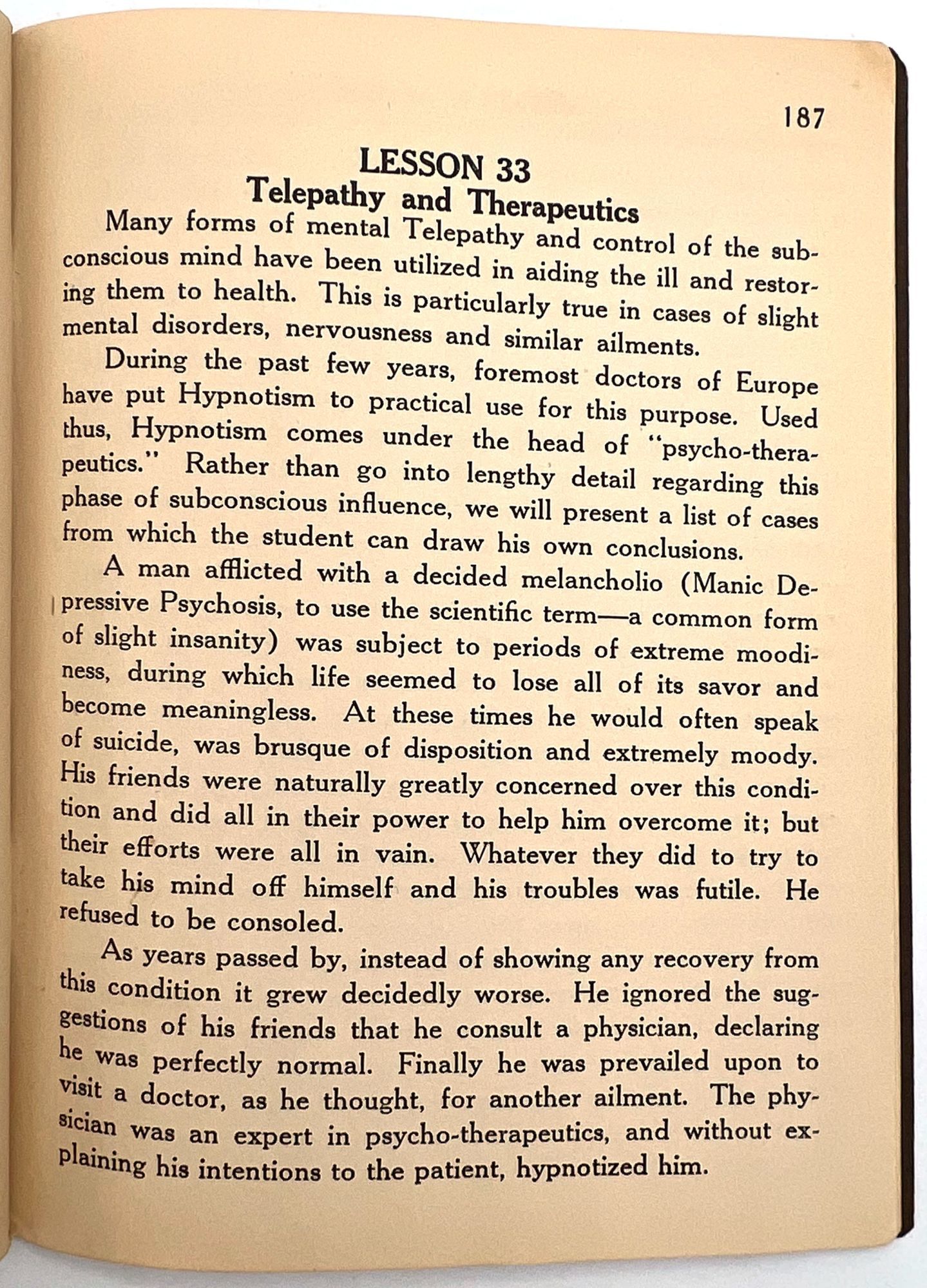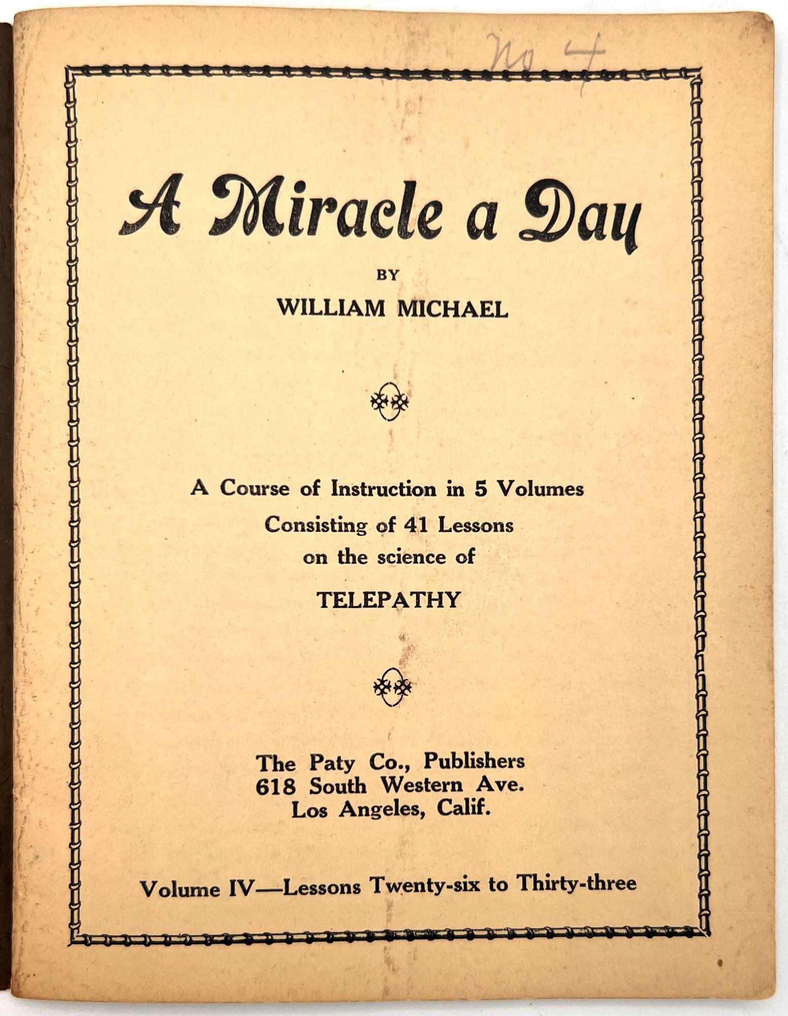 Los Angeles, California: The Paty Co, 1932. Good to very good. Toned, Minor dust soiling/staining. Extremities worn.. Vol. IV of "a course of instruction in five volumes consisting of 41 lessons on the science of telepathy" (title-page). This volume contains lessons 26 through 33: "Direct Telepathy in Business"; "Advancement Through Telepathy"; "Telepathy and Character Reading"; "Judging the Subject"; "Resume of Telepathy"; "Hypnotism and Telepathy"; "Helping Others Through Telepathy"; and "Telepathy and Therapeutics". The final section, quite interestingly, argues that telepathy and hypnotism can help treat "melancholia" (i.e. depression) and "hysteria". 12mo (6.25" by 4.45"), pp. 192, stapled in original printed brown wrappers.