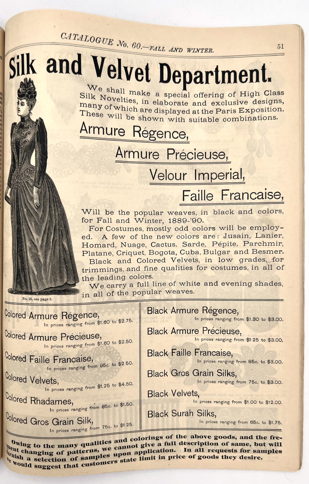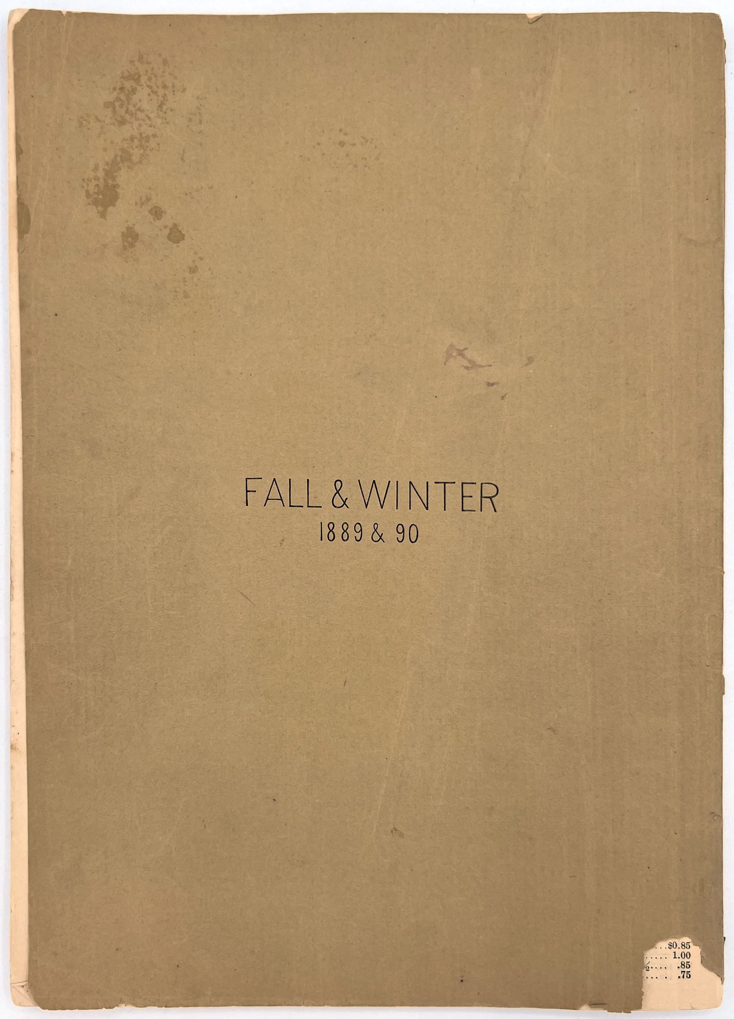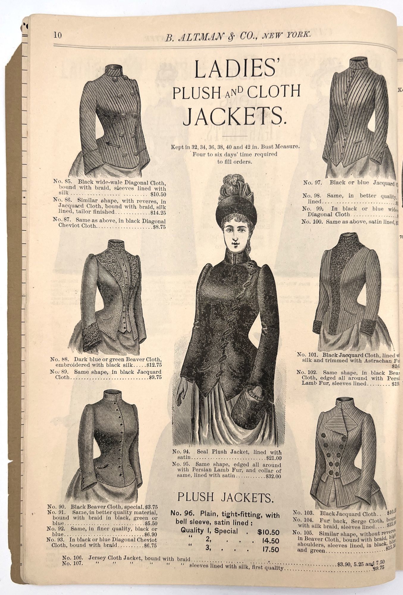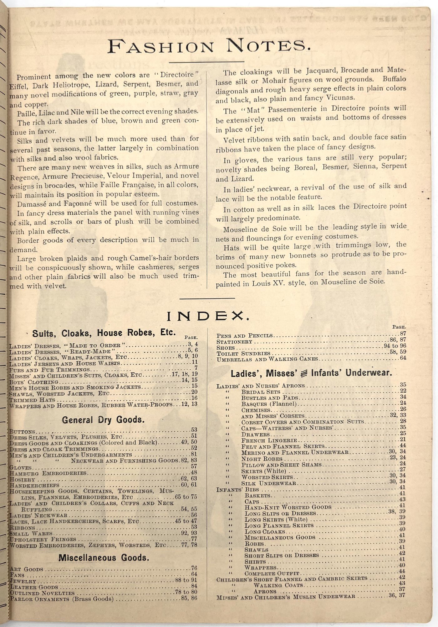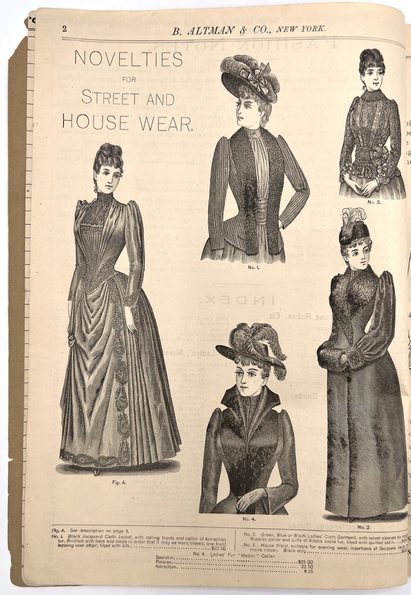 New York, New York: B. Attman & Co, 1889. Very good. Small open tear to upper right-hand corner of upper wrapper. Minor chipping, short tears, toning.. Printed catalogue advertising women's and children's clothing and accessories sold by the B. Attman & Co. of New York, profusely illustrated over its 96 pages. Includes a blank mail-in order form in the front and index, as well as a brief description of the latest trends ("Velvet Ribbons with satin back... In gloves, the various tans are still popular...", etc.). The clothes advertised are from the clothier's Fall/Winter 1889-1890 line of fashion. Each item is illustrated and priced with a style number for easy ordering. Also includes an "upholstery" section selling rugs, tapestries, towels, etc. There is a full page devoted to mourning jewelry, befitting the period.