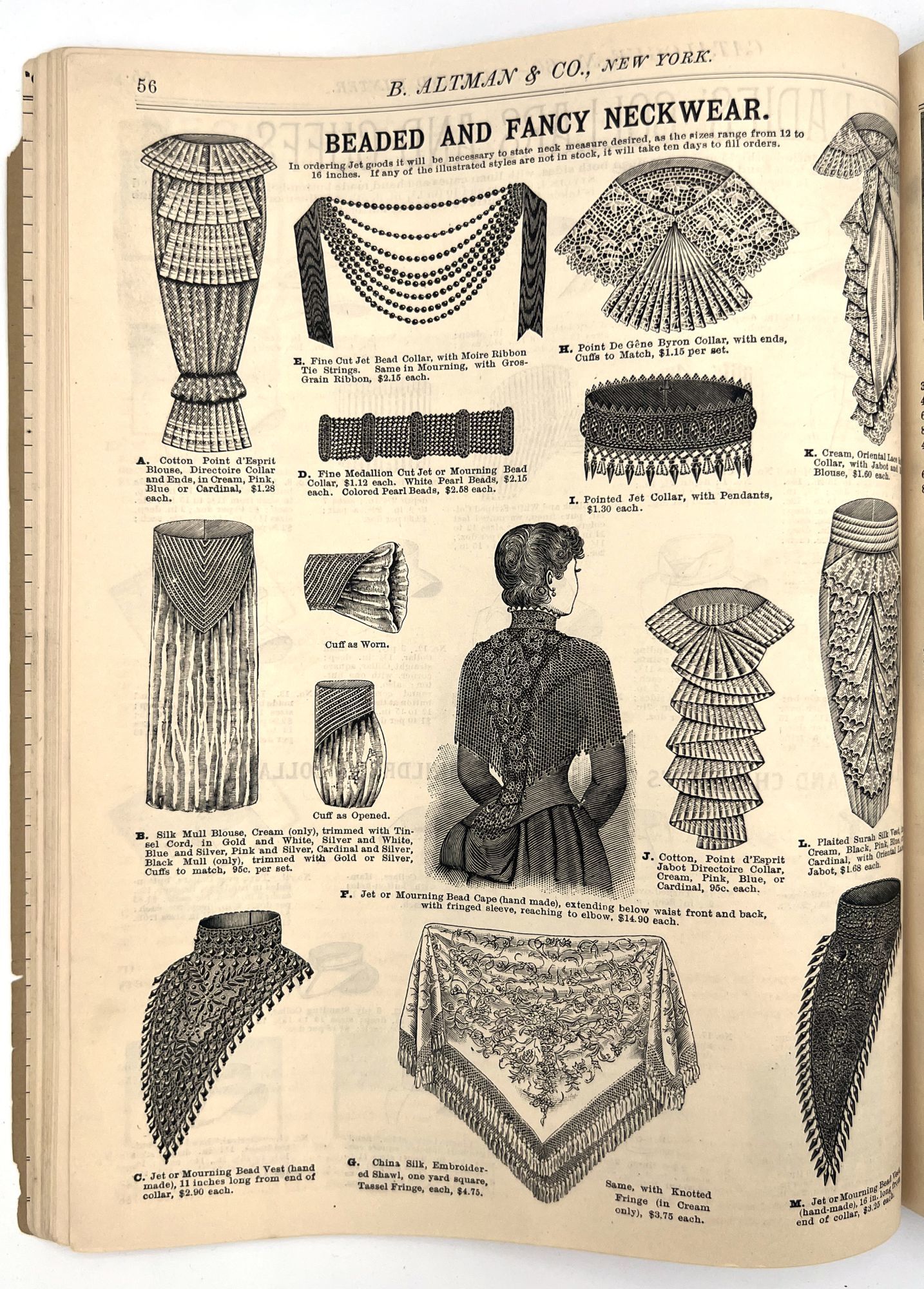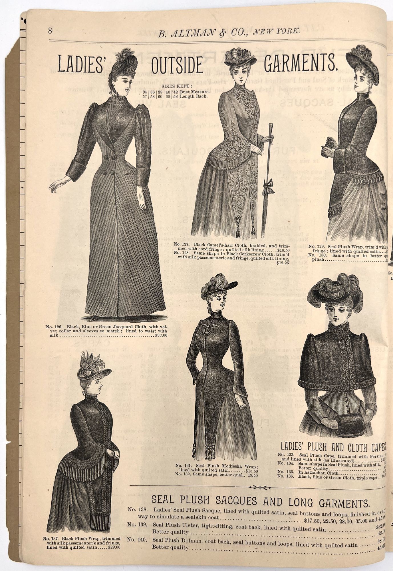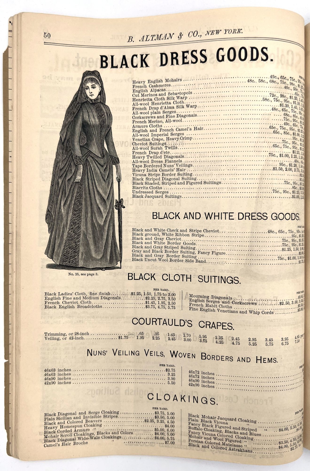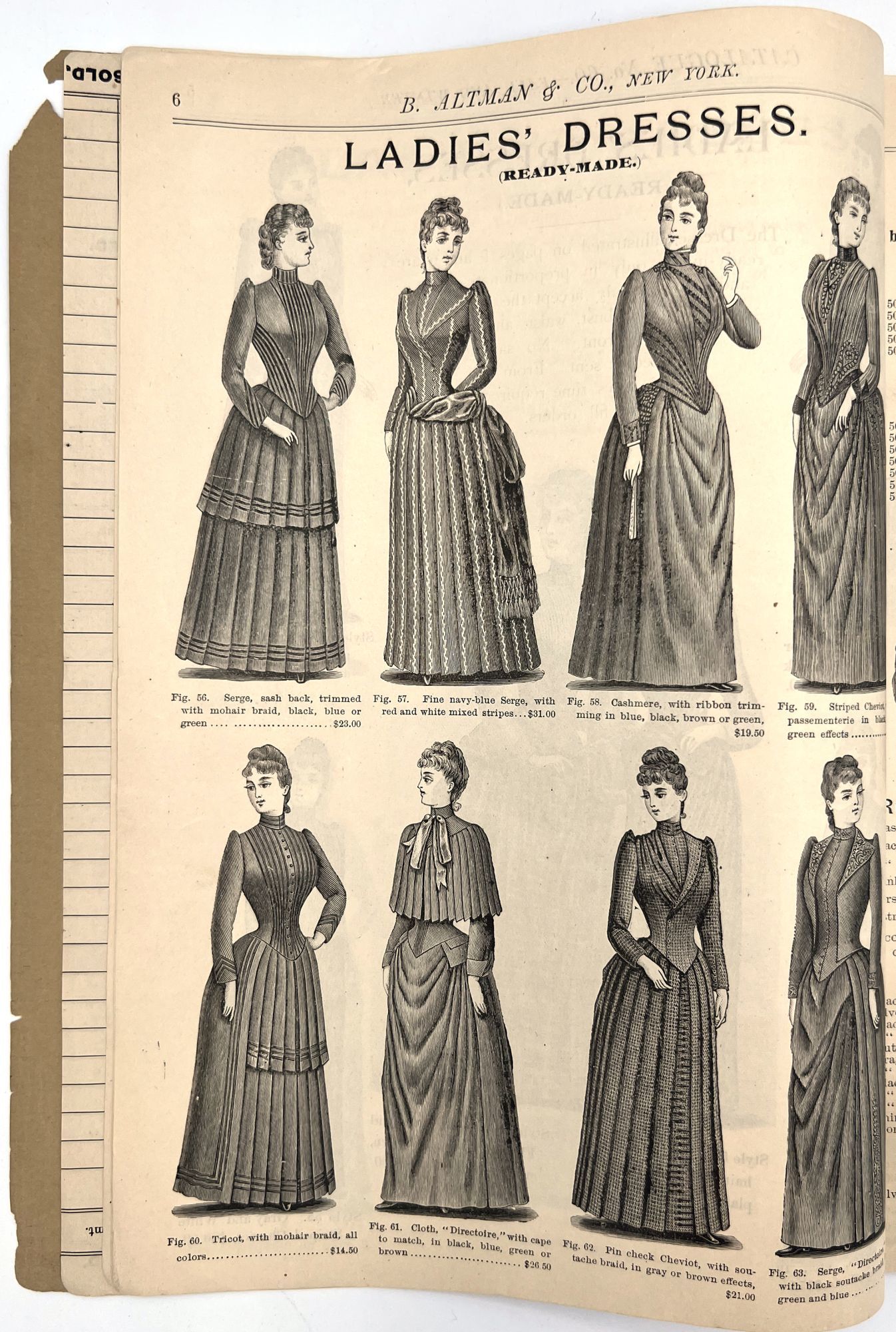 New York, New York: B. Attman & Co, 1889. Very good. Small open tear to upper right-hand corner of upper wrapper. Minor chipping, short tears, toning.. Printed catalogue advertising women's and children's clothing and accessories sold by the B. Attman & Co. of New York, profusely illustrated over its 96 pages. Includes a blank mail-in order form in the front and index, as well as a brief description of the latest trends ("Velvet Ribbons with satin back... In gloves, the various tans are still popular...", etc.). The clothes advertised are from the clothier's Fall/Winter 1889-1890 line of fashion. Each item is illustrated and priced with a style number for easy ordering. Also includes an "upholstery" section selling rugs, tapestries, towels, etc. There is a full page devoted to mourning jewelry, befitting the period.